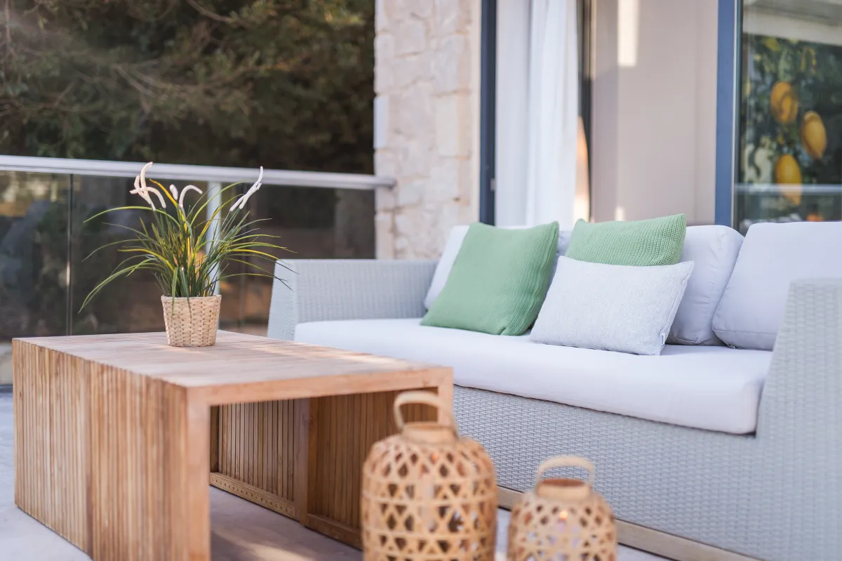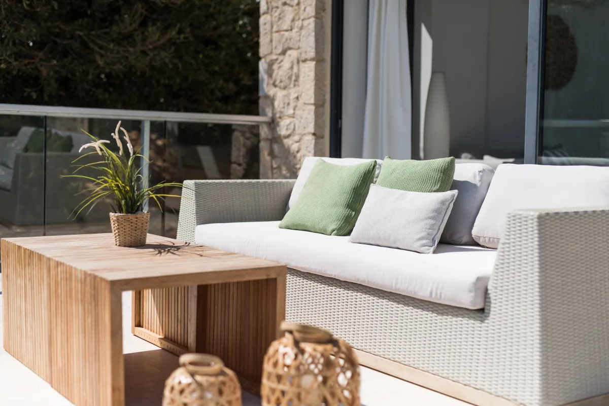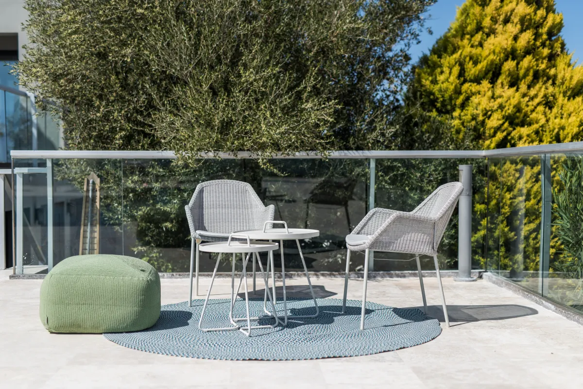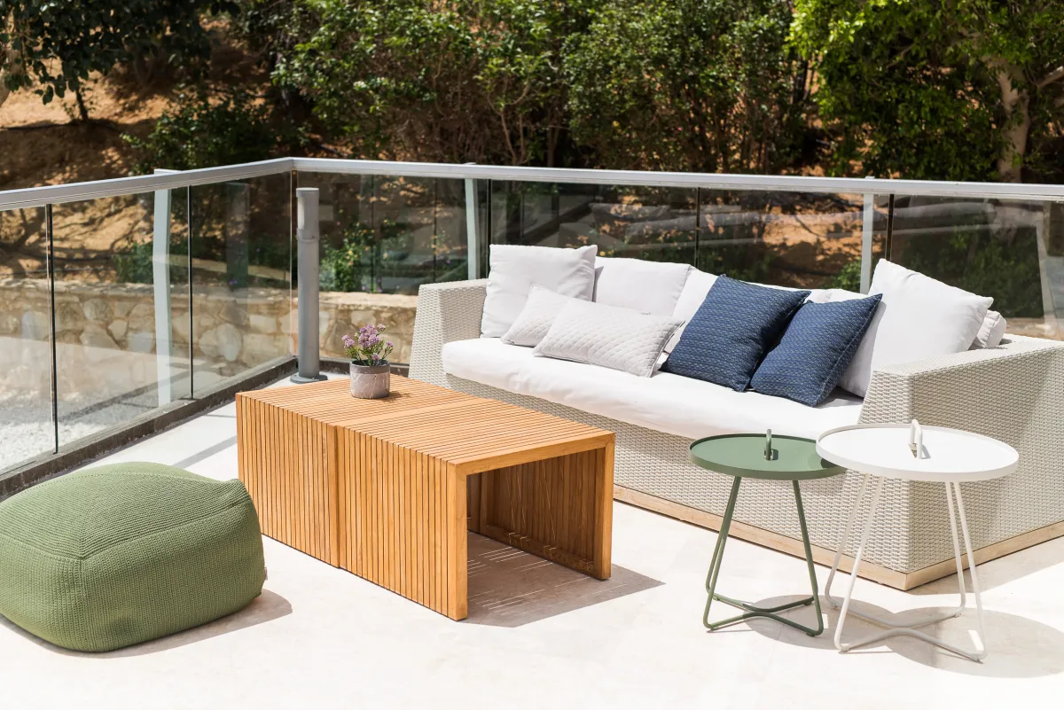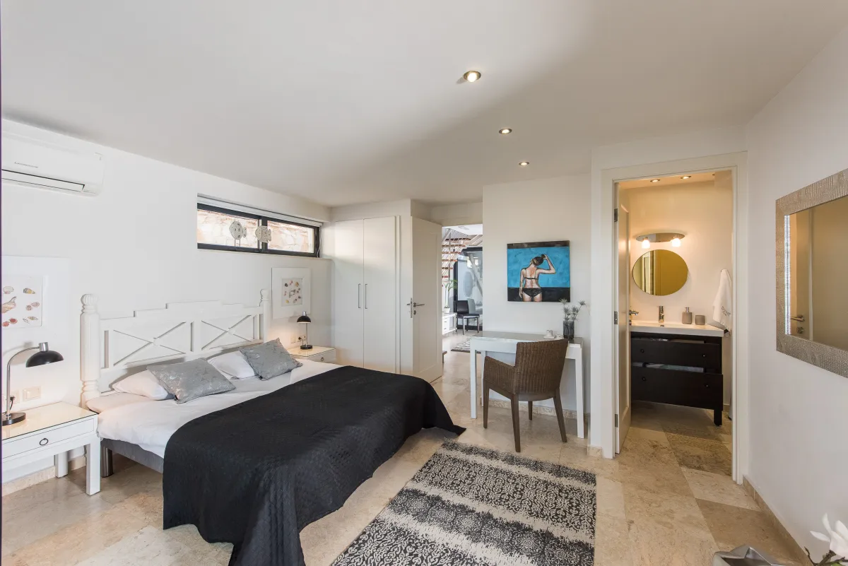 The villa offers 4 double bedrooms, with the 3 ground-floor bedrooms having outdoor seating areas and the Master bedroom upstairs offering a large balcony and beautiful sea views. Each villa bedroom has an en-suite bathroom and there is an additional WC for guests. Cots and fold-out beds are also available if required. Housekeeping is done daily, while linens and towels are changed every 4 days.
