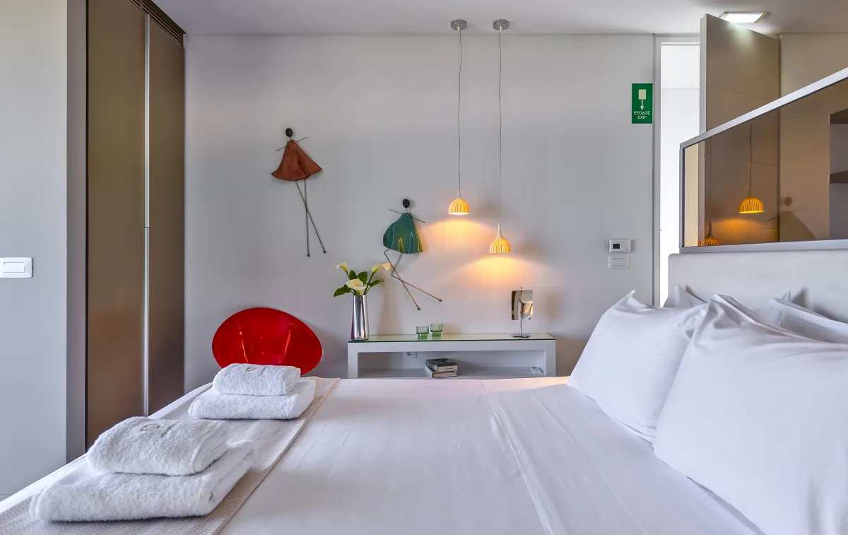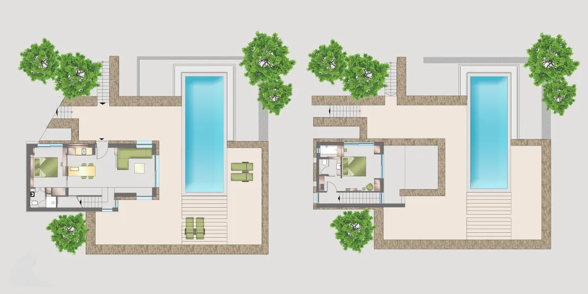 The private holiday villa is home to 1 master bedroom and 1 guest bedroom, each with ensuite bathrooms and queen-size beds that can be split. There is also a sofa bed available in the living room if required. The bedrooms have private balconies, air conditioning, and a safe for guests to utilize. Slippers, bathrobes, and toiletries are provided for guests.
