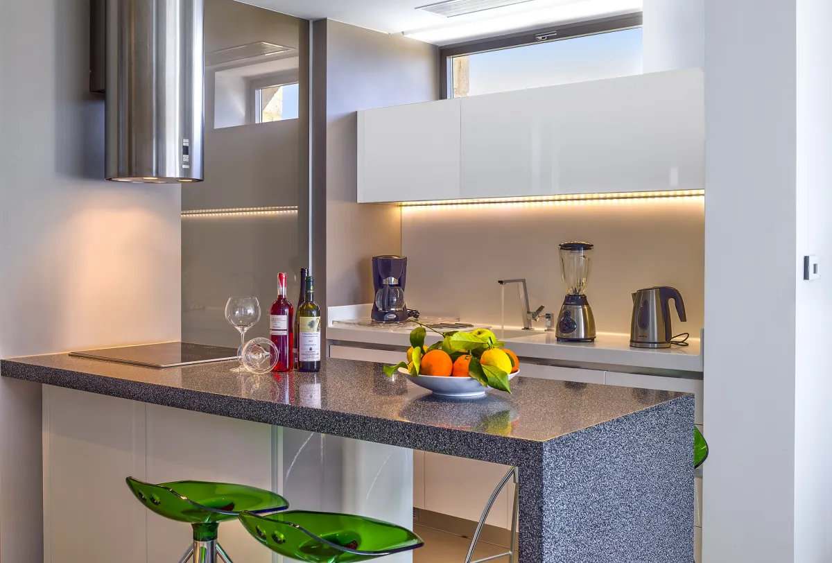 Oneiro Villa is equipped with a functional, modern kitchen with all the necessary appliances. There are also full laundry facilities at the rental property. The holiday villa offers housekeeping services daily (except for Sunday) with linens and towels changed twice a week. An elegant, open-plan dining area is also available, offering ample seating for guests.