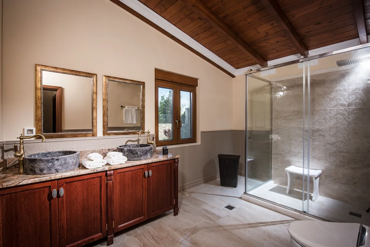 Bella Mare Villa accommodates guests in 5 bedrooms: a master bedroom with a balcony and panoramic sea view, a dressing room, and a separate bathroom with a walk-in shower and double-basin vanity; 3 double bedrooms, 1 with a sea view and 1 with a TV; and a twin bedroom. All bedrooms have air conditioning and an infant cot is available if required. There is also another bathroom with a walk-in shower, double-basin vanity, and a guest WC. Hair dryers, toiletries, and towels are provided for visitors.
