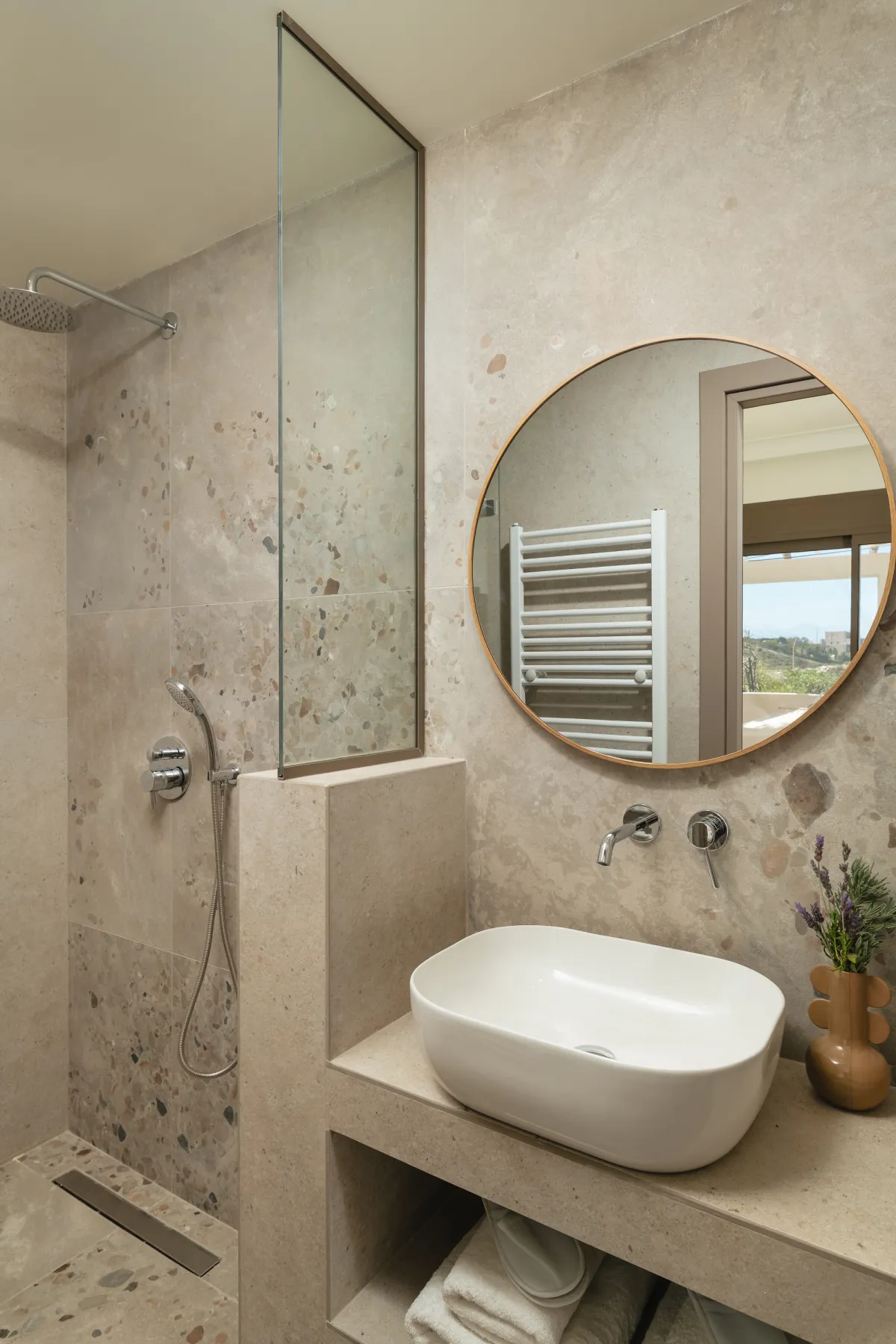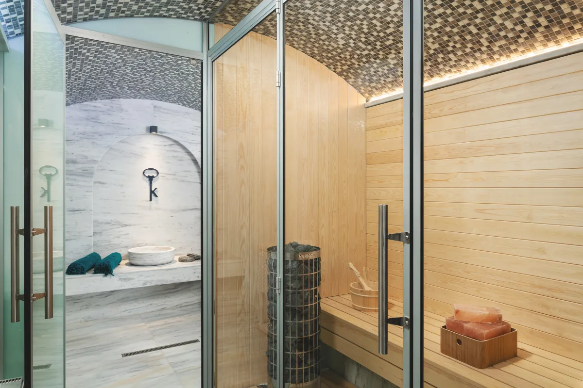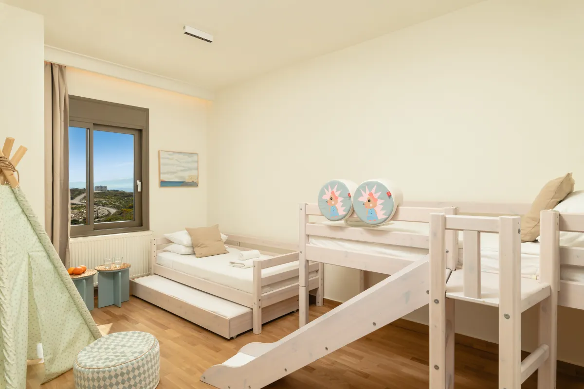 The villa’s six stylish bedrooms are thoughtfully designed for privacy and comfort. Each double room boasts a super king or king-size bed, en-suite or dedicated bathroom, air conditioning, and balcony access. The second-floor room with three single beds is perfect for children or friends sharing. With a total of seven bathrooms, including spa-like amenities such as a whirlpool, sauna, and steam room, every guest can enjoy ultimate convenience and relaxation. Baby and child-friendly amenities are also provided, including a cot, high chair, toys, monitor, bath, and changing table.