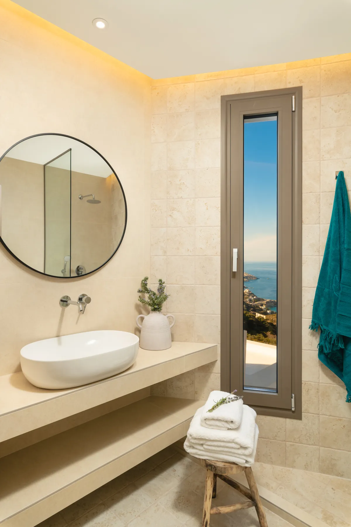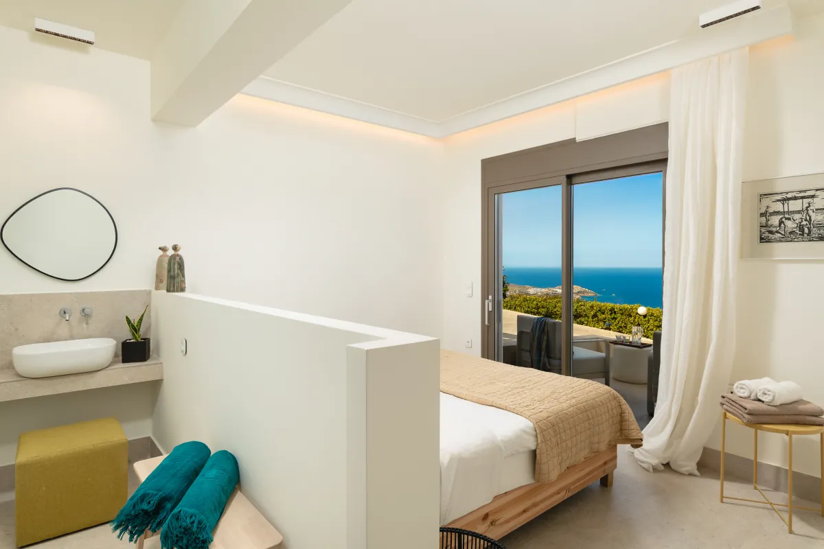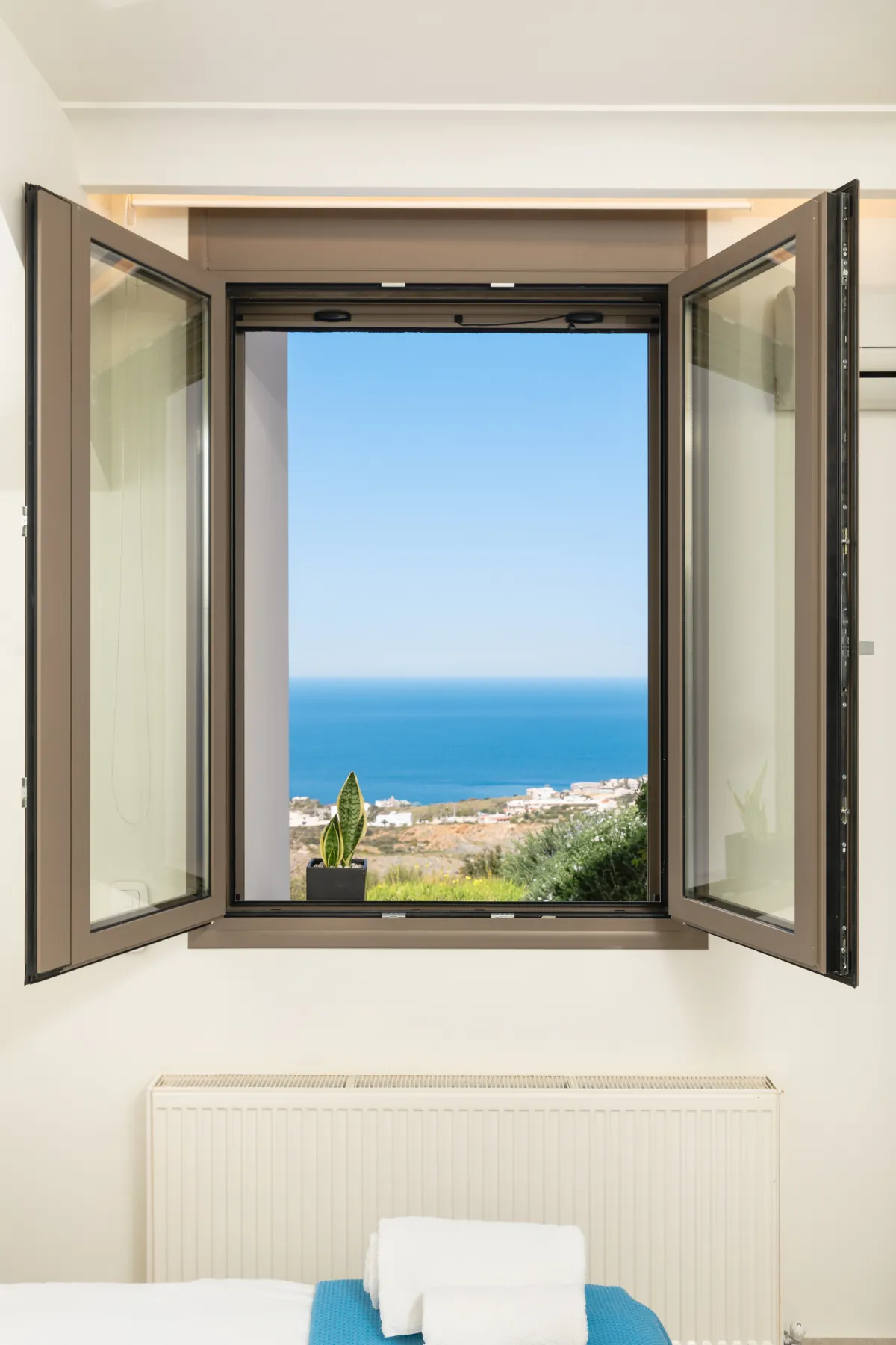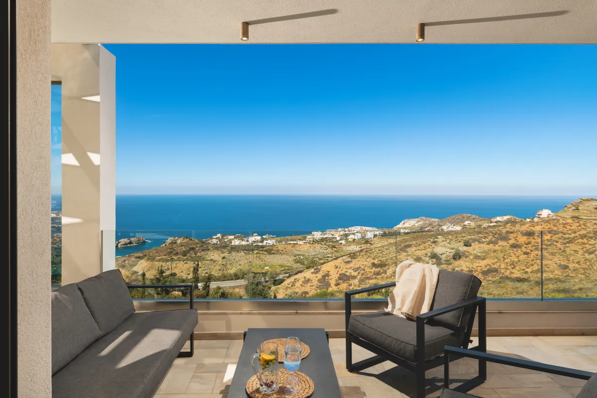 Outdoors, Blue Key Villa transforms into a sun-drenched sanctuary. Enjoy a swim in your private pool while the kids splash in their own shallow section. Soak in the jacuzzi, relax under umbrellas on one of the 10 sunbeds, or gather for an al fresco meal with the built-in BBQ and outdoor dining area. There's even a ping pong table and play area to keep everyone entertained. With panoramic views and every detail considered, it’s the perfect place to spend long, lazy days under the Cretan sun.