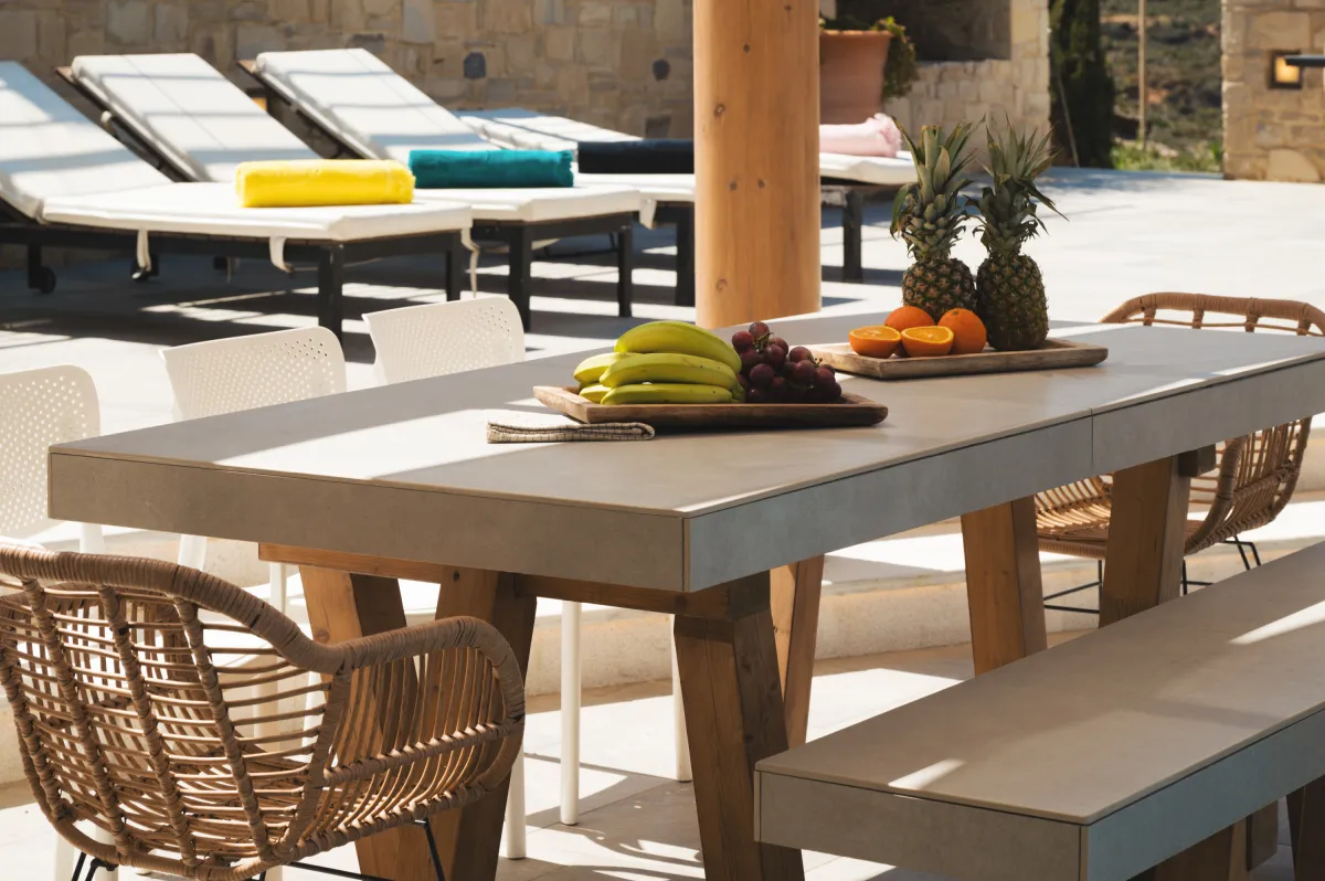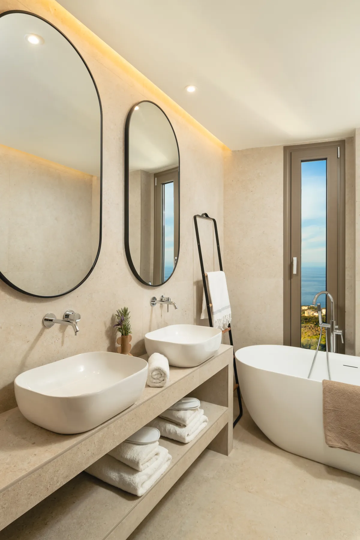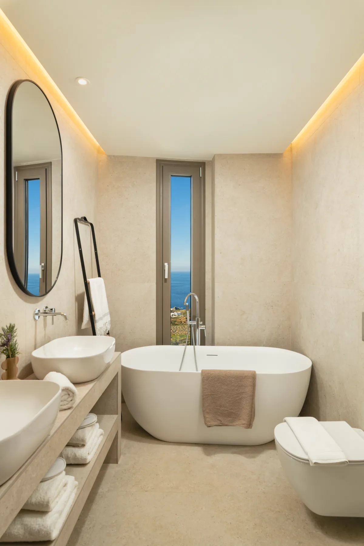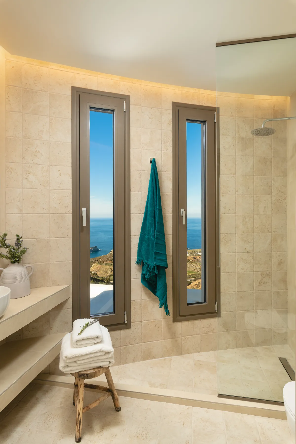 Outdoors, Blue Key Villa transforms into a sun-drenched sanctuary. Enjoy a swim in your private pool while the kids splash in their own shallow section. Soak in the jacuzzi, relax under umbrellas on one of the 10 sunbeds, or gather for an al fresco meal with the built-in BBQ and outdoor dining area. There's even a ping pong table and play area to keep everyone entertained. With panoramic views and every detail considered, it’s the perfect place to spend long, lazy days under the Cretan sun.
