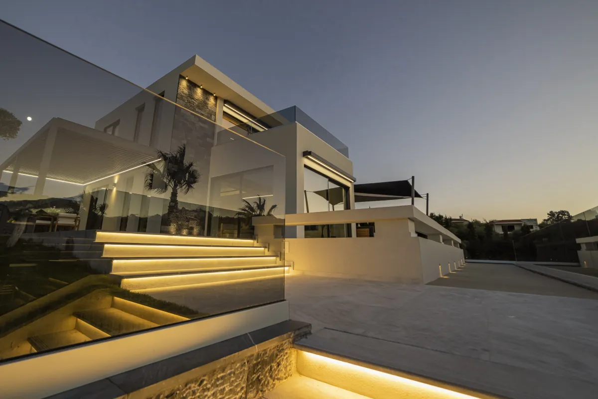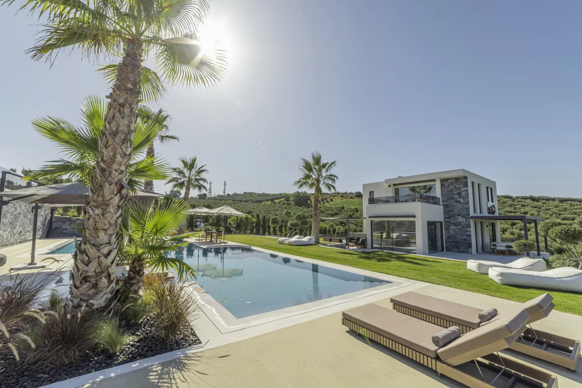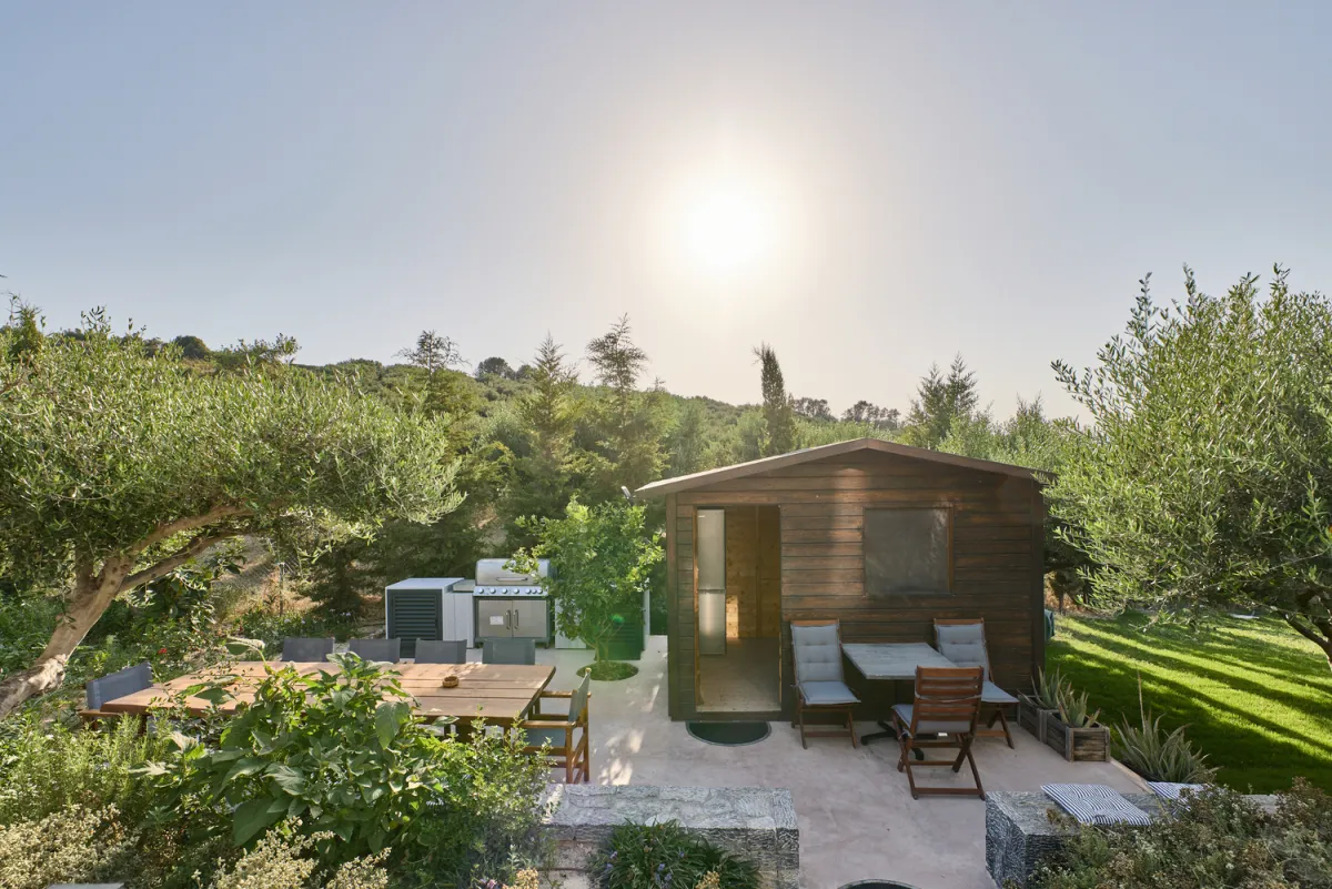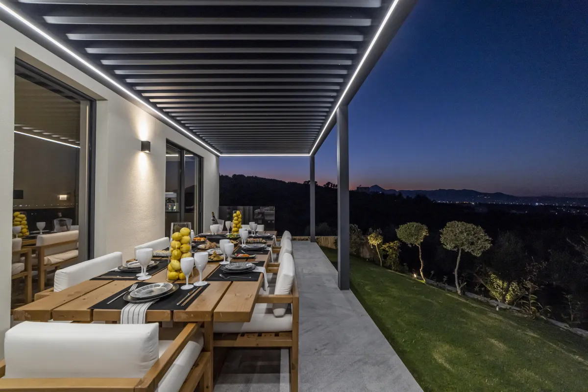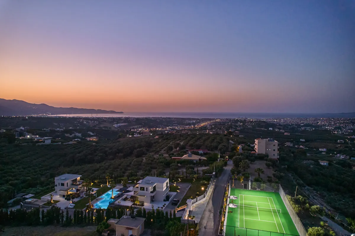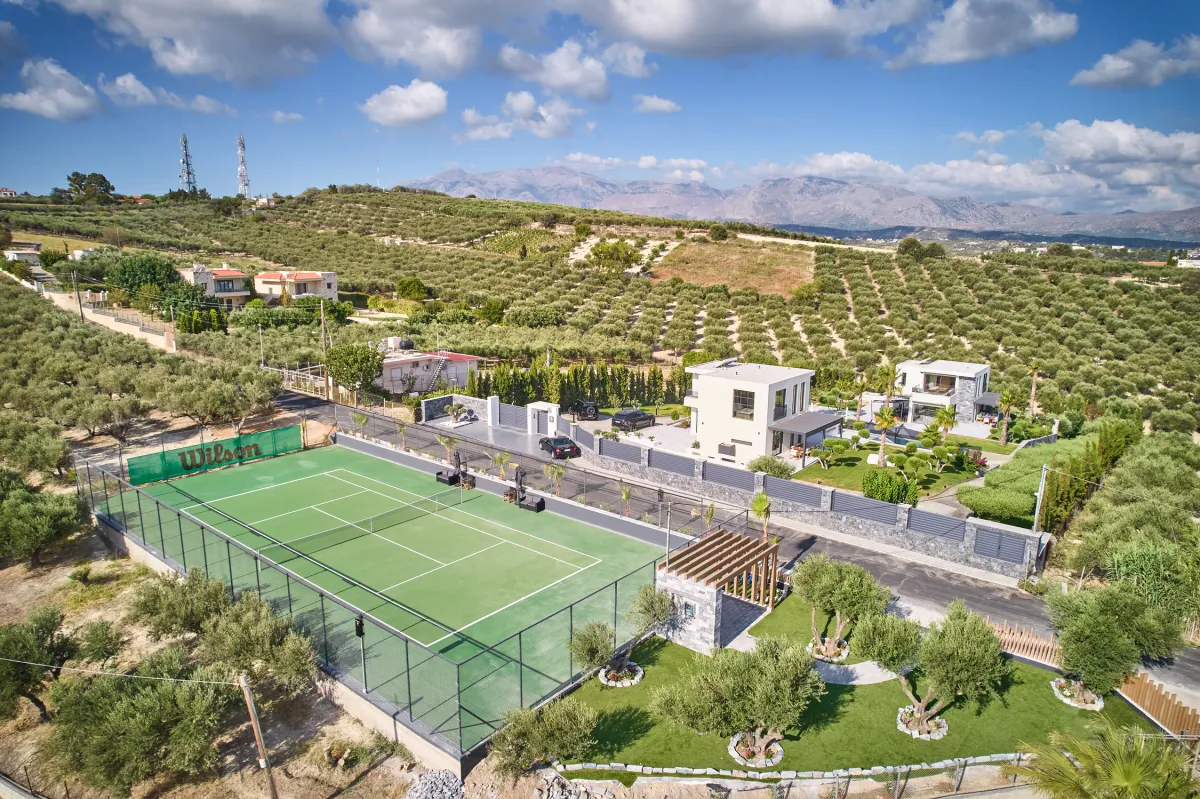 The beautiful exterior of the Geolivia Estate holiday accommodation features stunning views of the surrounding land and cityscapes and the outdoor amenities include a private swimming pool, poolside with shaded seating, a jacuzzi, an outdoor shower, a wc and a changing room, a built-in BBQ and gas grill, an al fresco dining area, a professional tennis court and garage parking for 6 vehicles.