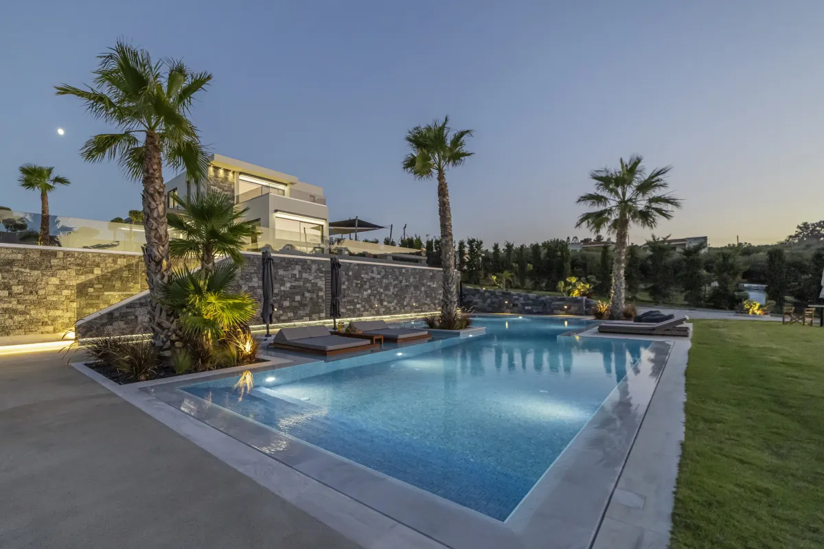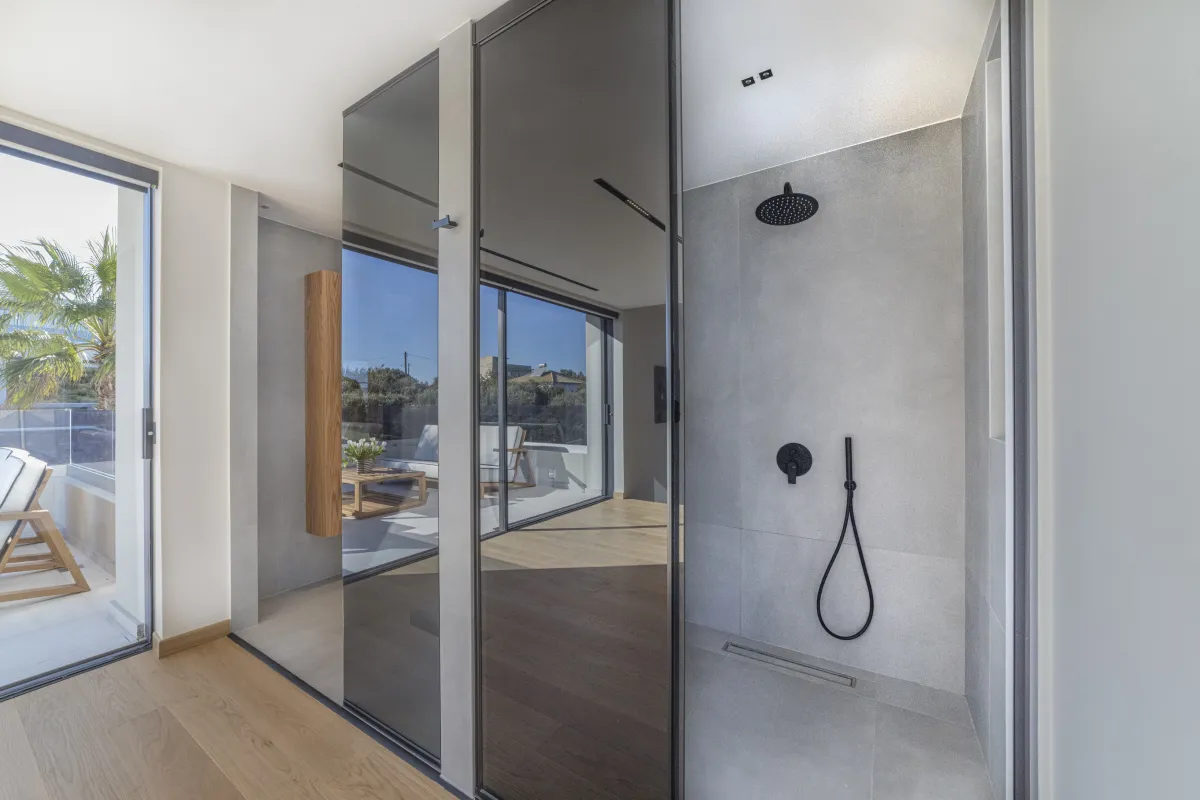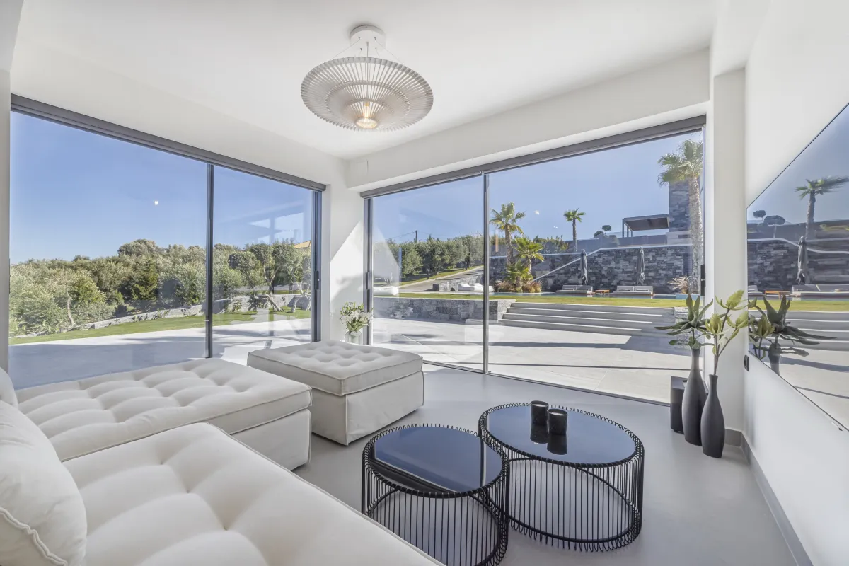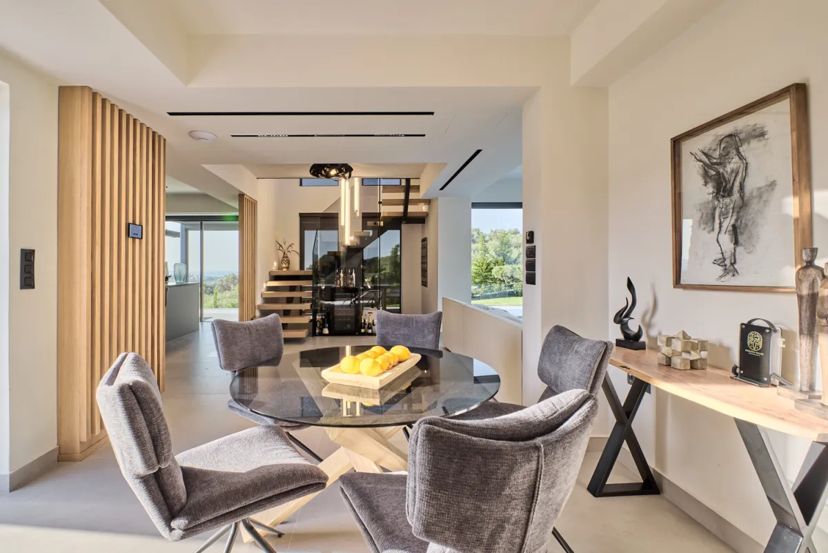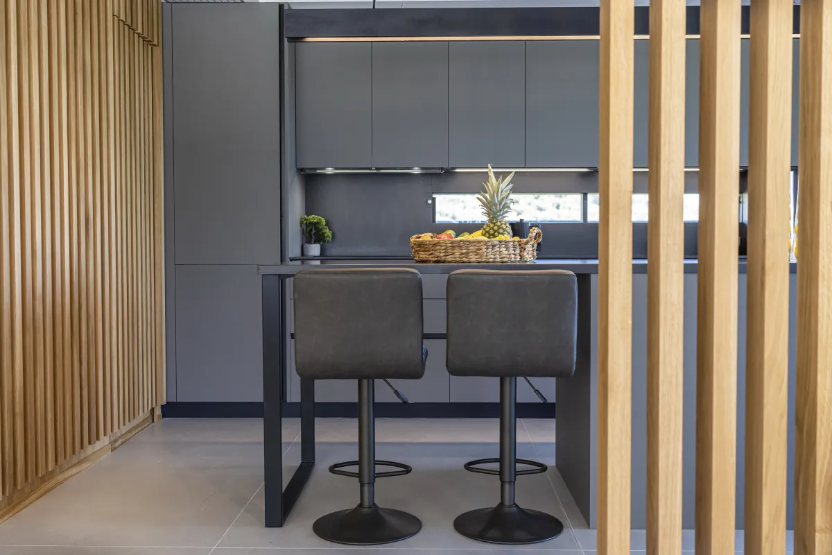The Geolivia Estate is a trendy holiday rental that sleeps up to 14 guests in its 2 modern units. At the ground floor of each unit, you will find an open-plan living and dining area fitted with contemporary furniture with ample table seating, a 60” HD Smart TV and Bluetooth stereo, and air conditioning. The sophisticated villas’ kitchens are fully laid out with a stove, oven, dishwasher, freezer, fridge, toaster, coffee machine, Nespresso machine, capsules and a minibar. There is also a guest WC in each villa and hair dryers, toiletries, towels, and bathrobes are provided for visitors in each bathroom. An infant highchair is available if required.