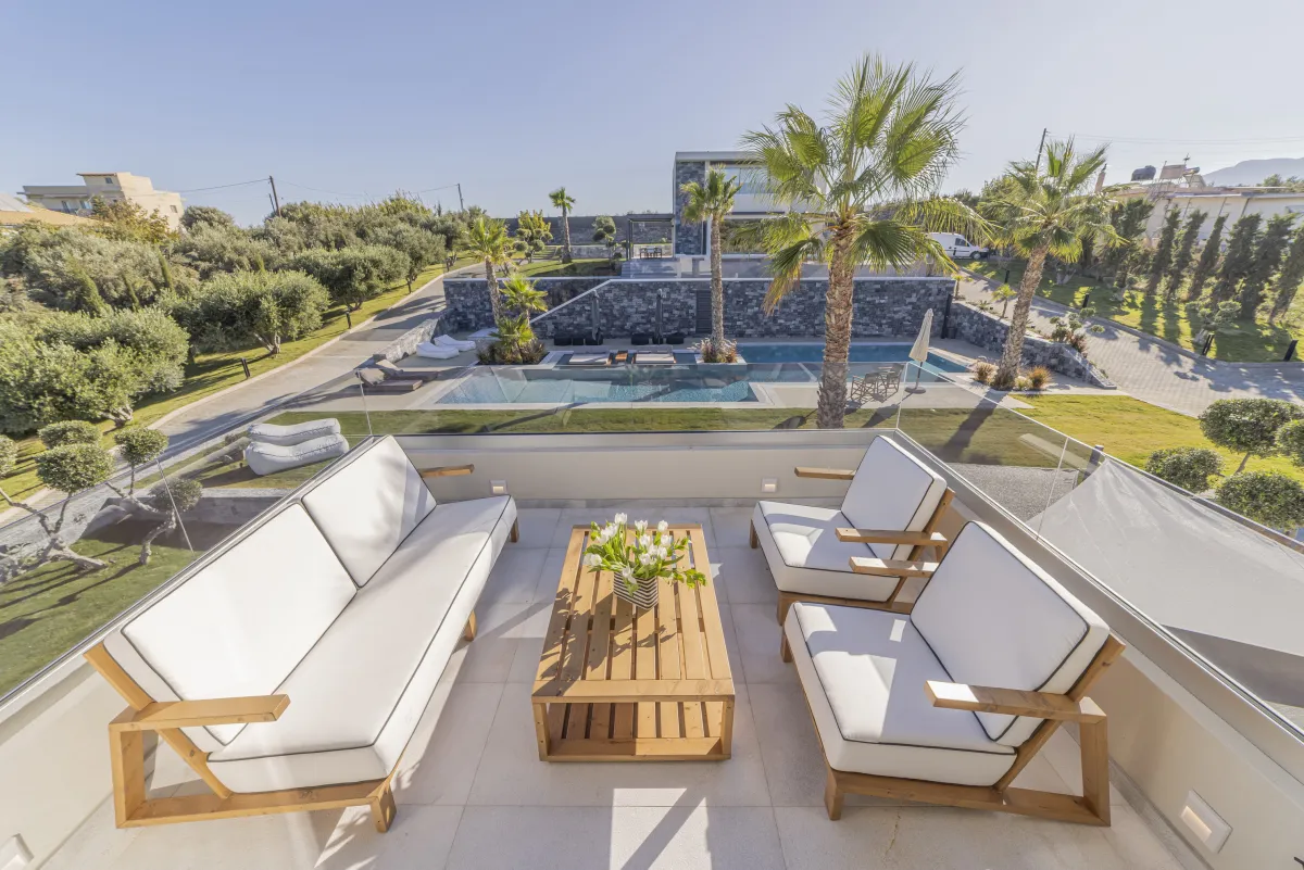 Moreover, the first floor of each villa has a double bedroom, air conditioning, satellite TV, safe, WC and ensuite shower cabin and a private balcony with sitting furniture.