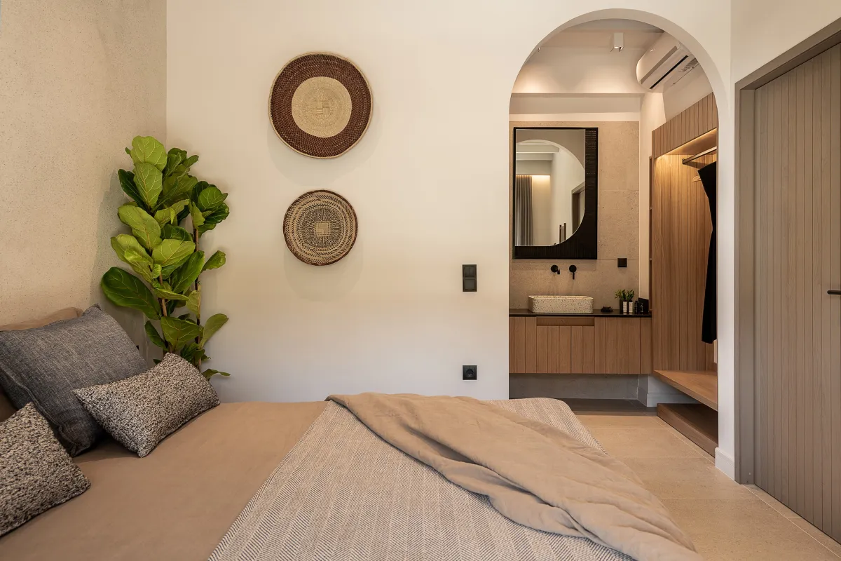 This Greek luxury villa is in the popular holiday destination of Agia Pelagia, overlooking the beautiful bay of Lygaria. It can accommodate 4 adult guests. The villa can be reached from Heraklion in 20-25 minutes and is an excellent locale from which to explore various Cretan attractions. Villa Aura is home to modern, classy aesthetics and awe-inspiring sea views. Private parking is available at the villa for 2 vehicles. Villa Aura’s living room is tastefully furnished and equipped with a 50-inch Smart TV, satellite, and Netflix. There is also air-conditioning available in the villa’s living room. The Aura luxury holiday villa has a laid-back outside entertainment area consisting of a verandah with dining furniture and a gas BBQ, and a private swimming pool section with sunbeds, lounge poufs, and an outdoor shower. The Villa Aura offers a tastefully furnished dining room and adjoining kitchen, equipped with all the mod-cons including an oven and 4-ring stove, microwave, fridge, freezer, and dishwasher. Other kitchen appliances include a toaster, a kettle, and an Izzy Multi (ice crusher). The holiday rental is also equipped with an iron and ironing board, a washing machine, and a tumble dryer. House cleaning and linen changes are available every 3 days. Villa Aura has 2 elegantly decorated bedrooms, both offering king-size beds and luxurious ensuite bathrooms with showers. The front bedroom boasts a panoramic sea view and direct access to the front veranda, while the back bedroom opens onto a secluded veranda with views of the garden. Linens, bath towels, toiletries, and a hairdryer are provided with this holiday rental.