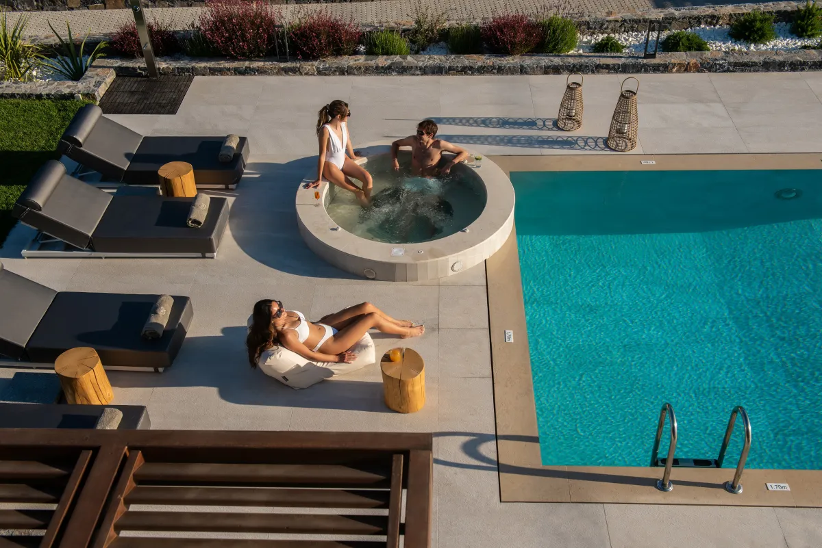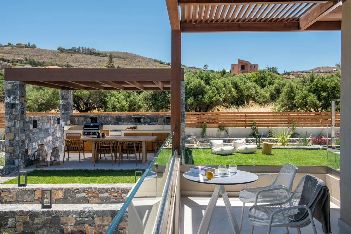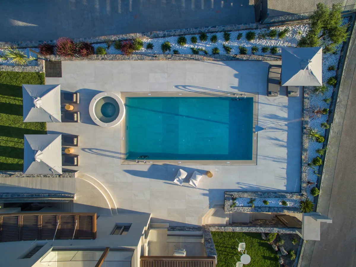 The luxury villa has a beautiful outside area, complete with a waterfall swimming pool and jacuzzi, and is stylishly furnished with loungers, umbrellas, and dining furniture. There is also a gas grill for BBQs and a wonderful selection of Cretan herbs growing in the garden. KYMO Instyle Villa has private parking for up to 5 cars.