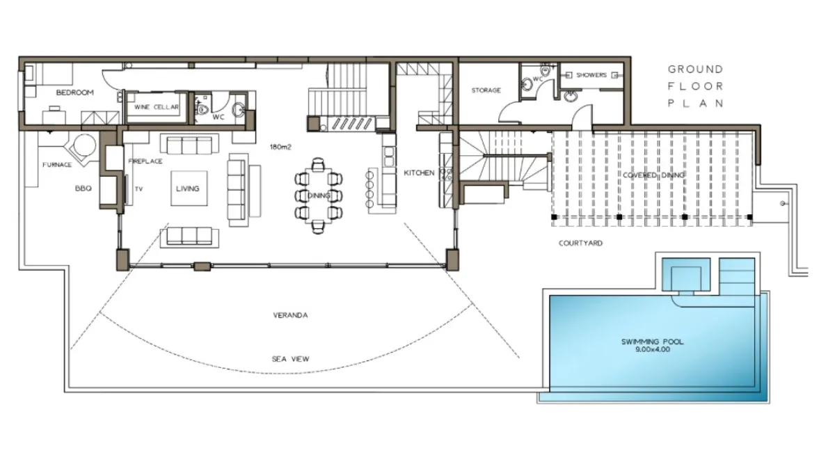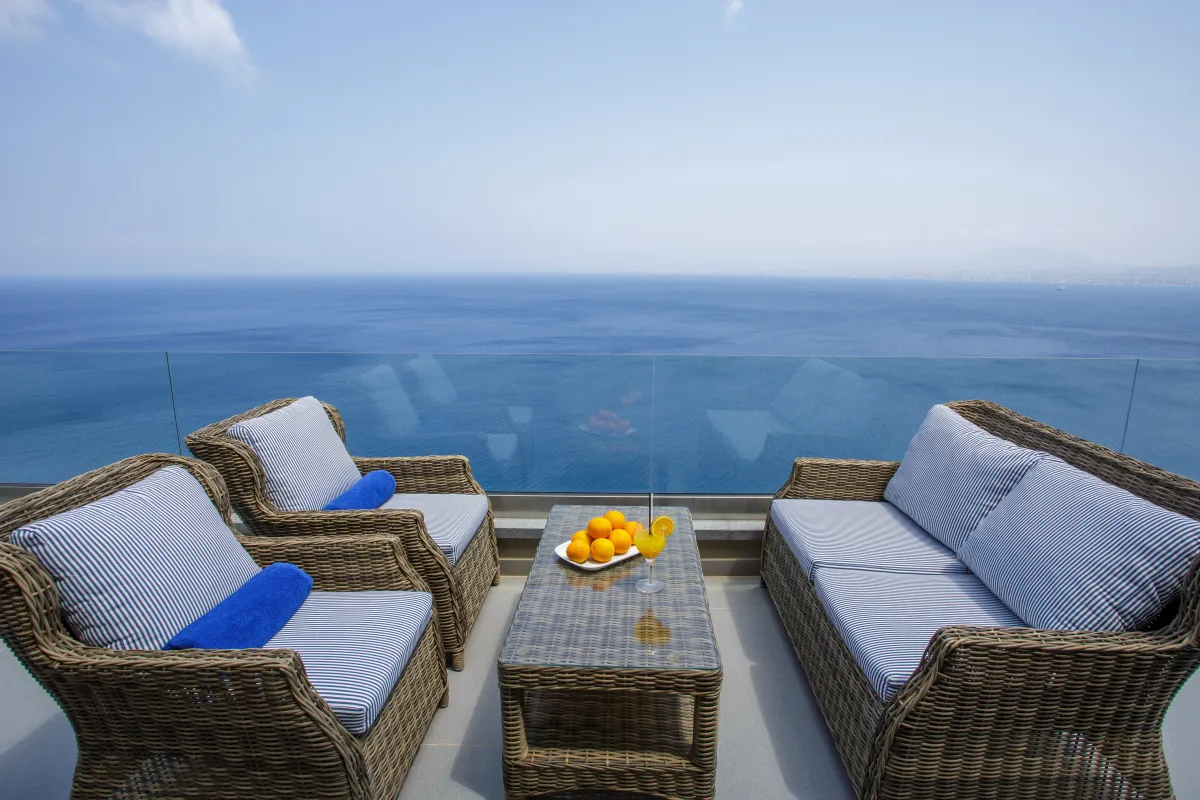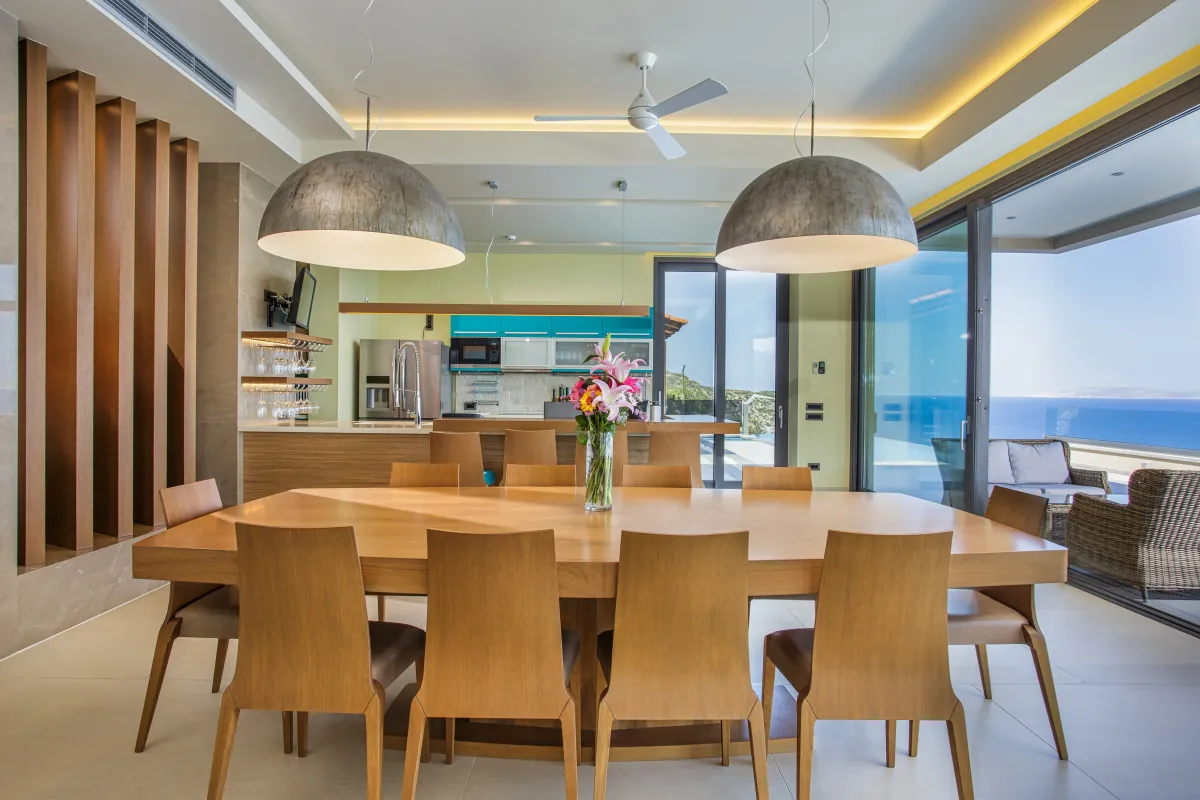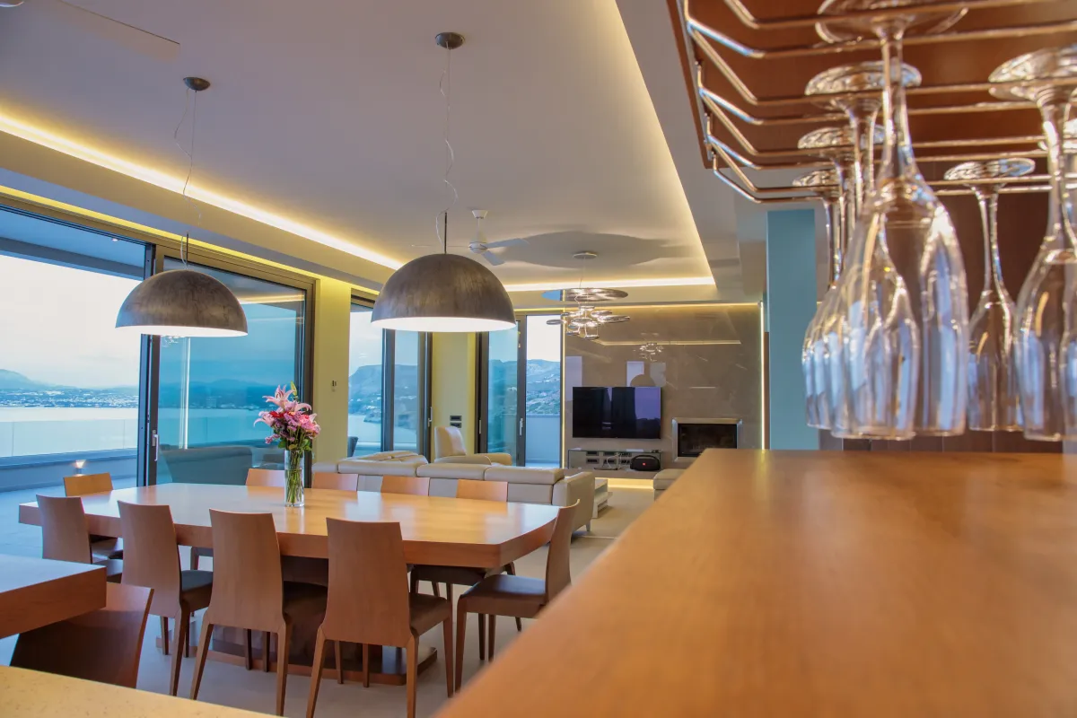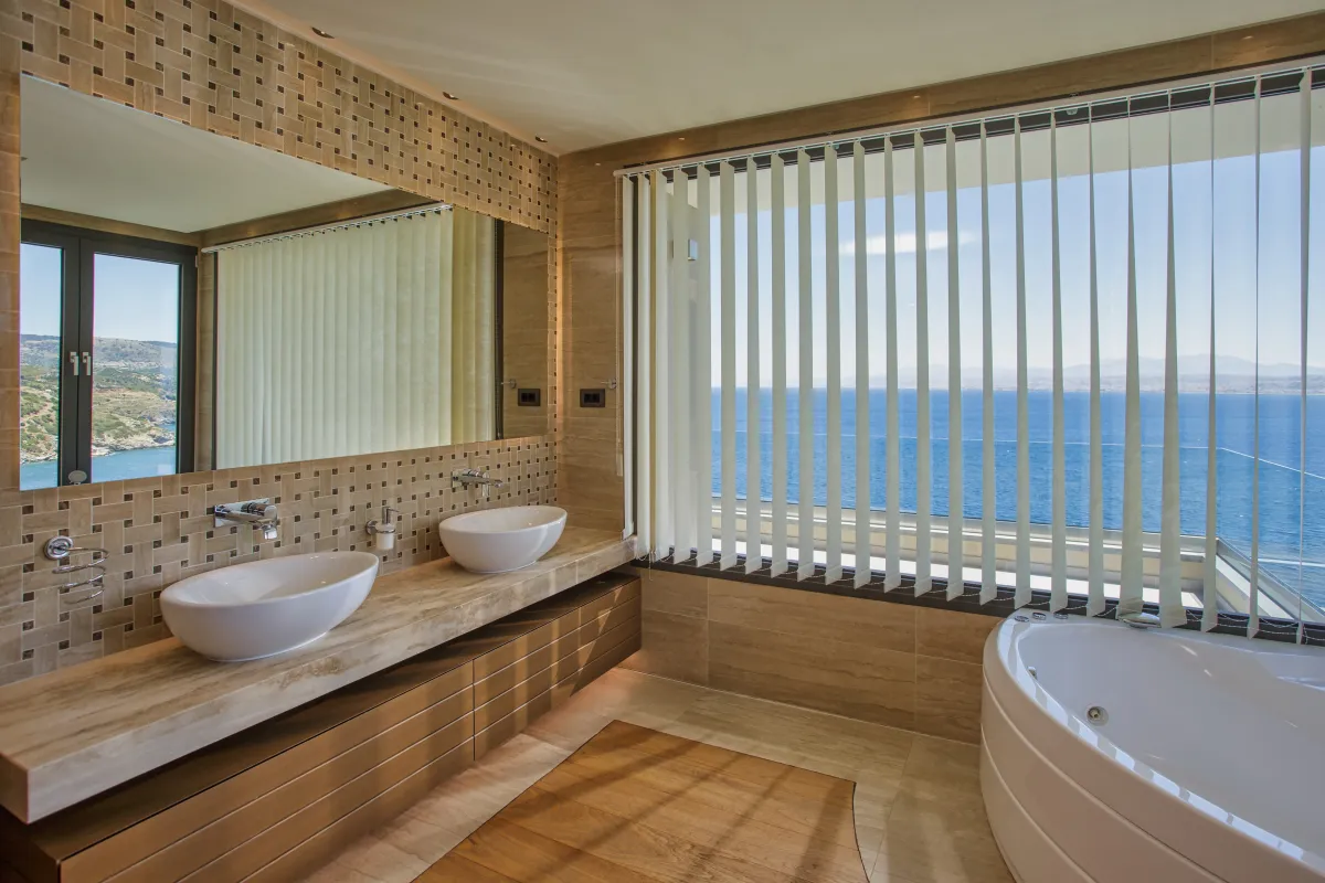 Located in the heart of Crete, a fashionable holiday destination in Greece, is Villa Amphitriti - a private luxury villa that provides visitors the opportunity to relax in opulent splendor on the coast. This private villa rental offers a superb base from which to discover the diverse island or simply relax in this delightful part of northern Crete. Villa Amphitriti can accommodate up to 11 guests in lavish comfort. This private luxury rental has an elegant living area, stylishly furnished with two large leather sofas and a nesting coffee table, as well as a 65 "Samsung Smart TV, DVD player, and HD Satellite TV. In addition, there is a fireplace, air conditioning, a wine cellar, and a guest toilet available.The dining area is furnished with an elegant olive wood table and 12 dining chairs, illuminated by two custom-made ceiling lamps. Villa Amphitriti is equipped with a stylish, modern kitchen with a built-in oven and smooth electric stovetop, a microwave, and a Whirlpool stainless steel 4-door refrigerator with icemaker, as well as a Nespresso coffee machine, a juicer, and a kettle . Additionally, there is a flat-screen TV, a kitchen bar with 4 chairs, and a hanging wine glass rack. Adjoining is a fully equipped kitchen extension with a Miele refrigerator and storage space. The master bedroom has a king-size bed with bedside cabinets, a dressing table and chair, and balcony windows with a sea view. There is a large flat-screen TV, a wall-length wardrobe with a digital / card safe box, and a full en-suite bathroom with a Jacuzzi tub. The second master bedroom has two beds joined as a king-size, bedside cabinets, a dressing table and chair, and balcony windows with a sea view. There is an en-suite bathroom with a shower but no bathtub. The third bedroom is similarly furnished except that its bathroom has a bathtub. There are two more bedrooms with beds joined to form a king-size, and showers (no bathtubs) in the bathroom. The final room has a single bed, a bedside cabinet, a sofa chair, and a wardrobe. On the lower floor of the private villa, there is a laundry room with a separate washer and dryer, and ample storage. Adjacent to this is a Hamam steam room with a relaxation area, shower, and toilet. The impeccable outdoor area is host to a heated infinity pool (seawater) with a beautiful sea view, a comfortable Jacuzzi area, and a waterfall jet. The roofed terrace has a monastery-style table that can seat up to 20 guests. There is a large indoor storage room with indoor showers and a toilet. A barbeque, wooden oven, wall fireplace, and worktop with sink are also available. There are sun-loungers and an open-air shower with hot and cold water for bathers to enjoy. A path with steps leads down to the walking road, from where visitors have private access to the beach. The luxury holiday home offers parking for up to 5 cars and visitors will receive a welcome pack upon arrival. Take a break at Villa Amphitriti and let the calming, relaxed atmosphere of Crete embrace you! Important notice upon request: Heating of the pool - 350 euro/week.