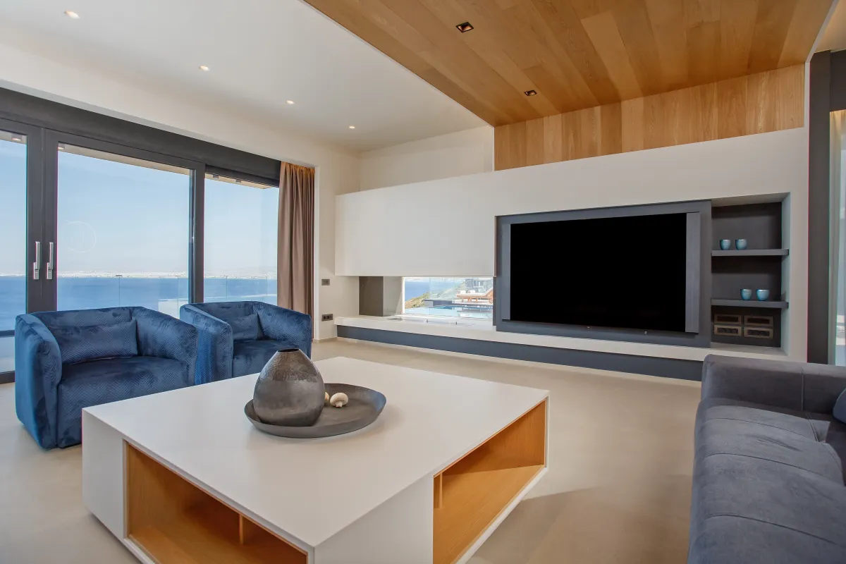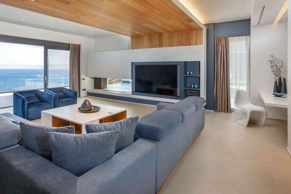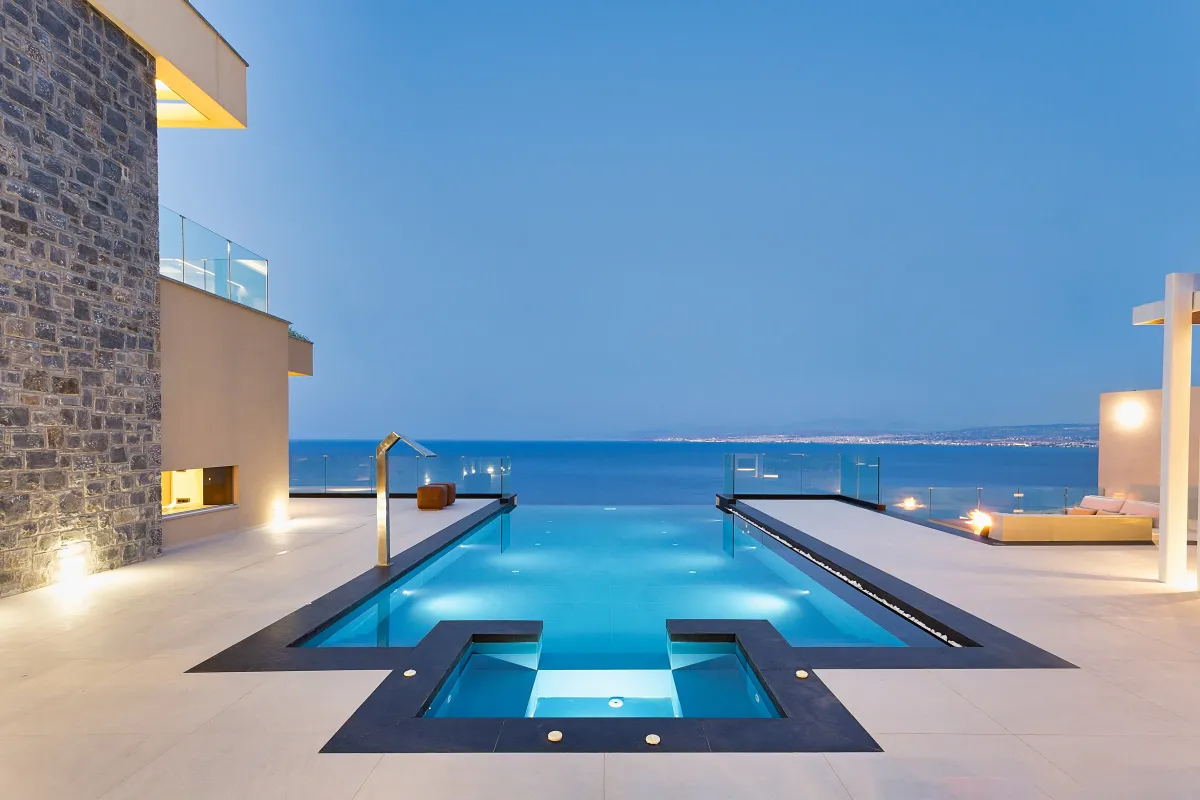Nestled in the heart of Crete, an exclusive holiday destination in Greece, is Villa Hyperion - a private luxury villa that offers visitors the opportunity to vacation in magnificent splendor on the coast. The exclusive villa rental provides an exquisite base from which to explore the diverse island or just relax in this enchanting part of northern Crete. Villa Hyperion can accommodate up to 14 guests in sumptuous grandeur. The private luxury villa has a trendy living area, comfortably furnished with two large leather sofas and a nesting coffee table, as well as a 65 "Samsung Smart TV, DVD player, and HD Satellite TV. There is also a fireplace, air conditioning, wine cellar, and guest bathroom available.The dining area is host to a large, olive wood table and 12 dining chairs, illuminated by two contemporary ceiling lamps. Villa Hyperion has an elegant, modern kitchen with a built-in oven and smooth electric stovetop, a microwave, and a Whirlpool stainless steel 4-door refrigerator with icemaker, as well as a Nespresso coffee machine, a juicer, and a kettle. Furthermore, there is a flat-screen TV, a kitchen bar with 4 chairs, and a hanging wine glass rack. Adjacent is a fully equipped kitchen extension with a Miele refrigerator and storage space. The luxury villa’s two master suites each boast a king-size bed with bedside cabinets, floor-to-ceiling balcony windows with beautiful sea views, and a large flat-screen TV. Each suite has a large wardrobe with a digital / card safe box. The en-suite bathrooms have double sinks, a Jacuzzi bathtub, and a shower. There are 3 bedrooms with twin / single beds pushed together, sharing balconies with the master bedrooms, and a bathroom with a shower (no bathtub). The last 2 bedrooms are similarly furnished but share an outdoor area, each with its own seating. They also have a bathroom with a shower but no bathtub. On the lower floor of the private villa, there is a gym space with a treadmill and home gym equipment including a weights system. Adjacent to this is a Hamam steam bath with a relaxation area, shower, and toilet. The immaculate outdoor area is home to a heated infinity pool (seawater) with an idyllic sea view, a relaxing Jacuzzi area, and a waterfall jet. The roofed terrace holds a monastery-style table that can seat up to 20 diners, and a room with ample storage space, indoor showers, and a toilet. A barbeque, wooden oven, wall fireplace, and worktop with sink are available for visitors. There are also sun-loungers and an open-air shower with hot and cold water for guests to enjoy. A path with steps leads down to the walking road, from where visitors can gain private access to the sea. The private luxury villa offers parking for up to 5 cars and guests will receive a welcome pack upon arrival. Escape to Villa Hyperion and let the splendor of a Crete luxury vacation gently wash over you! Important notice upon request: Heating of the pool - 350 euro / week.