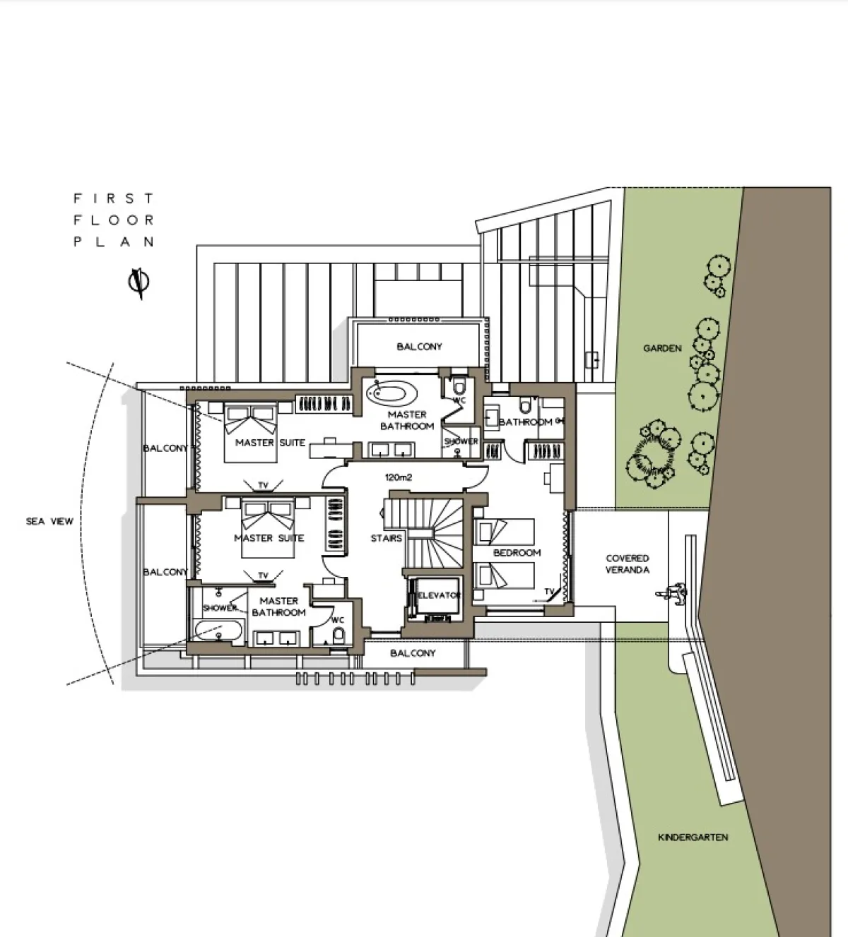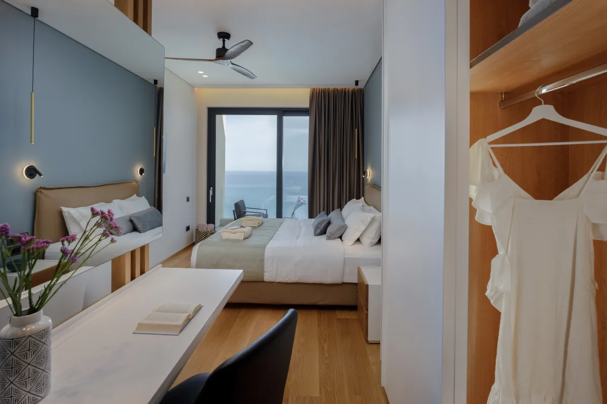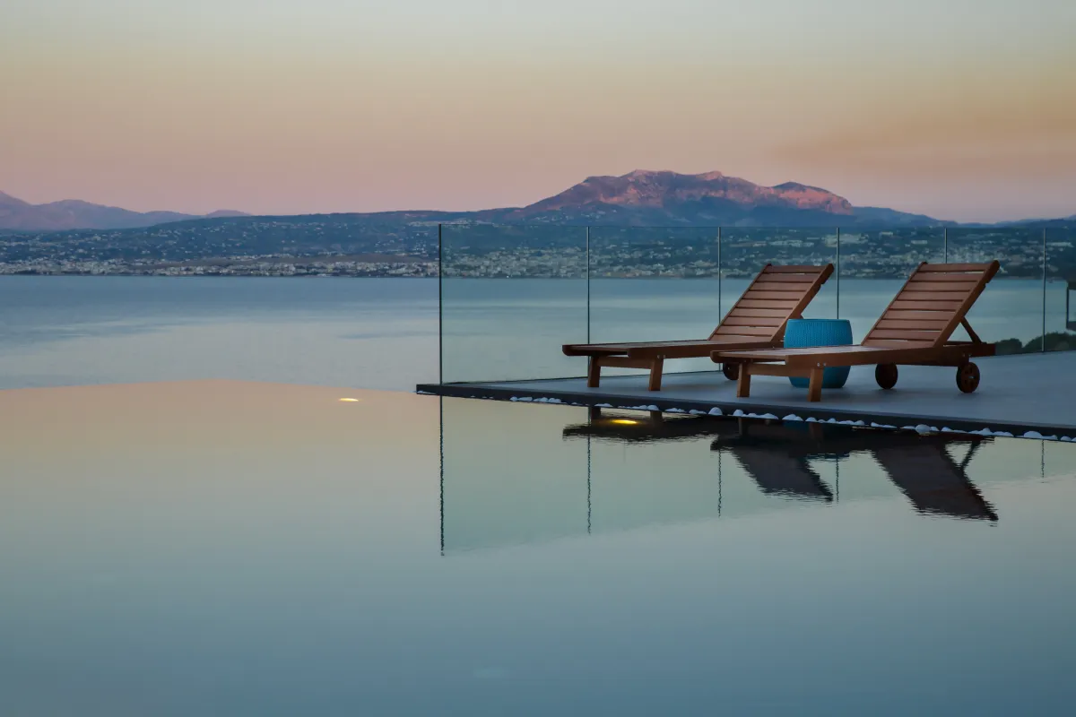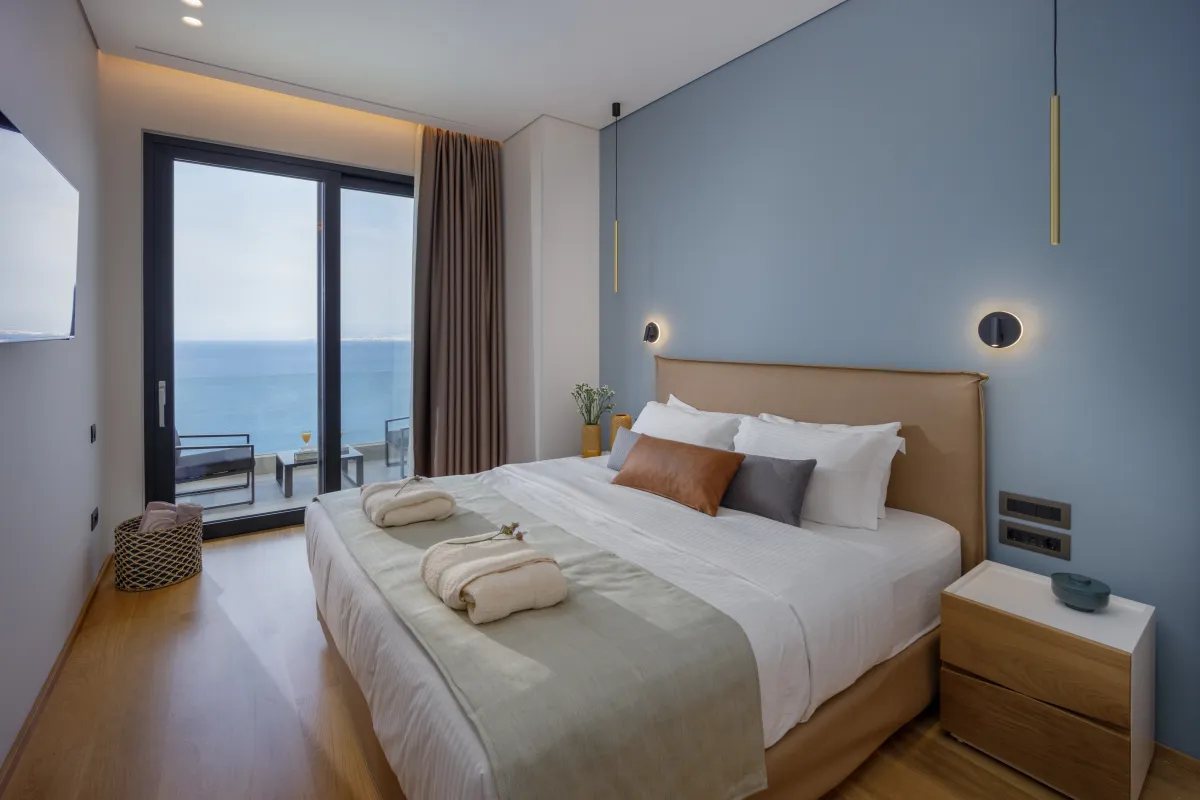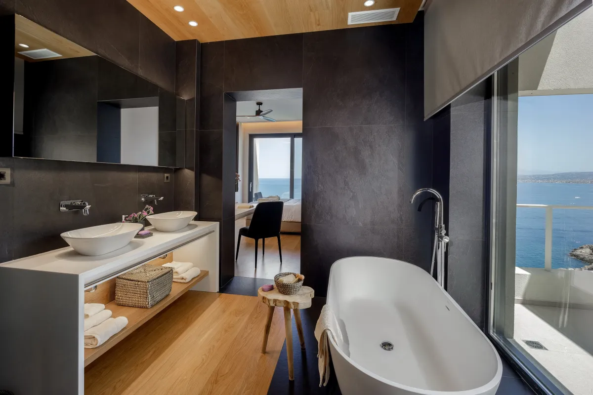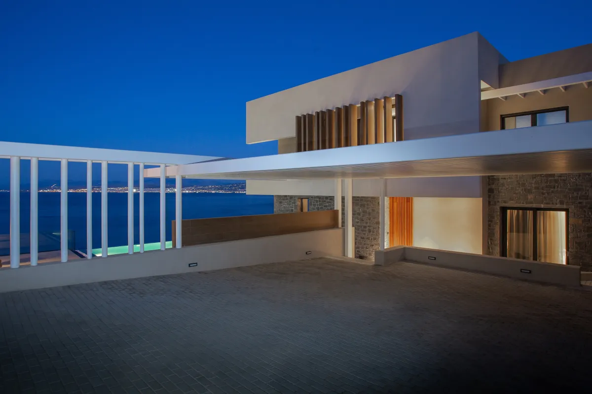 Villa Nereid is a new private luxury villa in the heart of Crete, an exclusive holiday destination in Greece. It can accommodate up to 12 guests in opulent splendor. This 5-star luxury villa rental provides an exquisite base from which to explore the fun-packed island or simply relax in this charming and tranquil corner of northern Crete. Villa Nereid is a luxury holiday villa that boasts an elegant and modern living area, comfortably furnished with a corner couch and sofa, and a nesting coffee table. There is a large Samsung Smart TV and a bioethanol fireplace and air conditioning. The floor-to-ceiling glass doors offer exceptional sea views beyond the villa’s large veranda. The dining area is host to a large, elegant table and 12 dining chairs, illuminated by a beautiful ceiling lamp. An elevator in the living and dining area provides easy access to all floors. Villa Nereid has a trendy, modern kitchen with direct access to an outside seating area with spectacular garden and sea views. The kitchen has a built-in oven and smooth electric stovetop, a microwave, a dishwasher, two large fridges with freezers, a Nespresso coffee machine, a juicer, a kettle, and even a 32 "flat-screen TV. Kitchen utensils, dinnerware , and cleaning products are also provided.A guest toilet lies adjacent to the kitchen. The luxury villa's master suite is home to a double bed with bedside cabinets, floor-to-ceiling balcony windows leading to a spacious private terrace, a stylish sitting area with a beautiful sea view, as well as a 42 "TV and a workspace with a desk The large wardrobe has a safe box, and the en-suite bathroom has a bathtub, a separate shower, and a private balcony The second suite offers much the same, except the bathroom does not have a shower or balcony. are two more bedrooms with en-suite bathrooms, and 2 standard bedrooms with a shared bathroom.These bedrooms each have 2 single beds, which can be pushed together to serve as doubles. On the lower floor of the private villa, there is a gym space with a treadmill and home gym equipment including wall ropes and a weights system with an adjustable smart dumbbell set. There is also a large 65 "TV in the gym area. Adjacent to this is a modern steam bath with a magnificently decorated ceiling, shower, and toilet. The luxurious outside area offers a breathtaking sea view and boasts a large infinity pool (seawater, heated on request) as well as Jacuzzi, waterfall, and heated SPA. There are sun-loungers, open-air showers, and a covered sitting area with a ceiling swing chair. The covered dining area seats 12 guests and has a large garden with a barbecue area with a stone oven, as well as a covered outside kitchen area. The luxury holiday villa offers parking for up to 4 cars and guests will receive a welcome pack upon arrival. Come to Villa Nereid and rest assured that we will make every effort to ensure a splendid vacation experience! Important notice upon request: Heating of the pool - 350 euro/week.