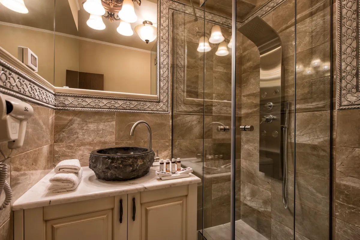 Visitors to the Villa Santorini are accommodated in 6 bedrooms—a master bedroom with an en-suite bathroom featuring a walk-in shower, double-basin vanity, and balcony with sea view; 2 twin bedrooms with en-suite bathrooms (walk-in shower); a twin bedroom with balcony and sea view; and 2 double bedrooms. All bedrooms have air conditioning and satellite TV, and an infant cot is available if required. Additionally, there is a separate bathroom with a walk-in shower, a double-basin vanity, and a WC on the ground floor. Hair dryers, toiletries, and towels are provided for guests.