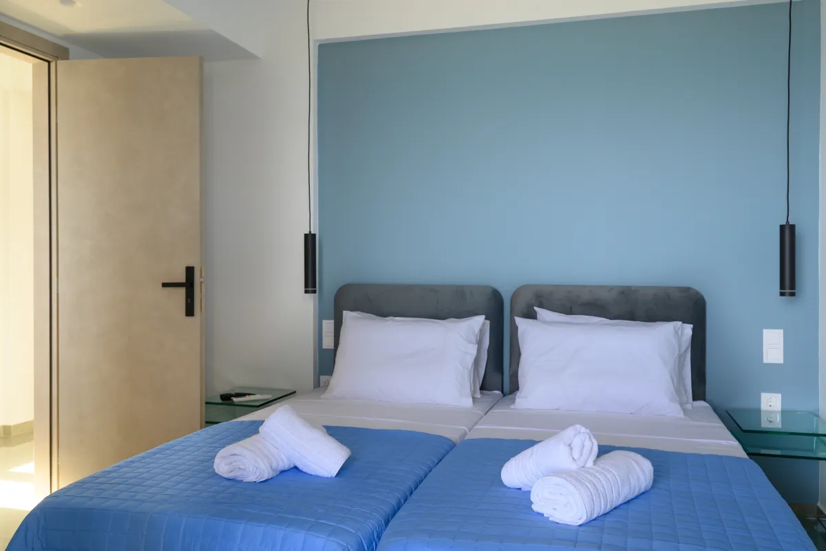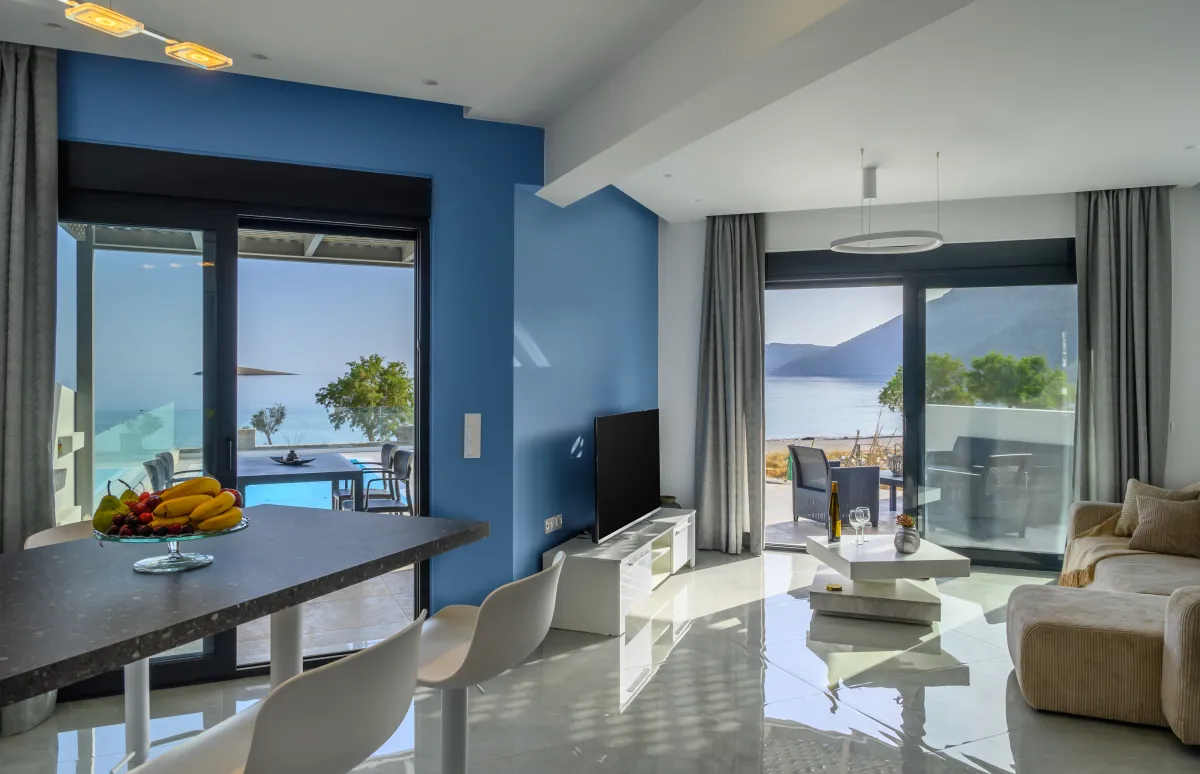 Inside, the villa welcomes you with an airy and inviting living space on the ground floor. The cosy lounge features comfortable seating, a large HDTV, and air conditioning—perfect for relaxing after a sun-soaked day. The open-plan layout flows seamlessly into the dining area and fully equipped kitchen, which comes with everything from a stove and oven to a dishwasher, Nespresso machine, and even a blender for smoothies or cocktails. Whether you're cooking a Cretan feast or enjoying your morning coffee, the space is designed for effortless living with amazing sea views.