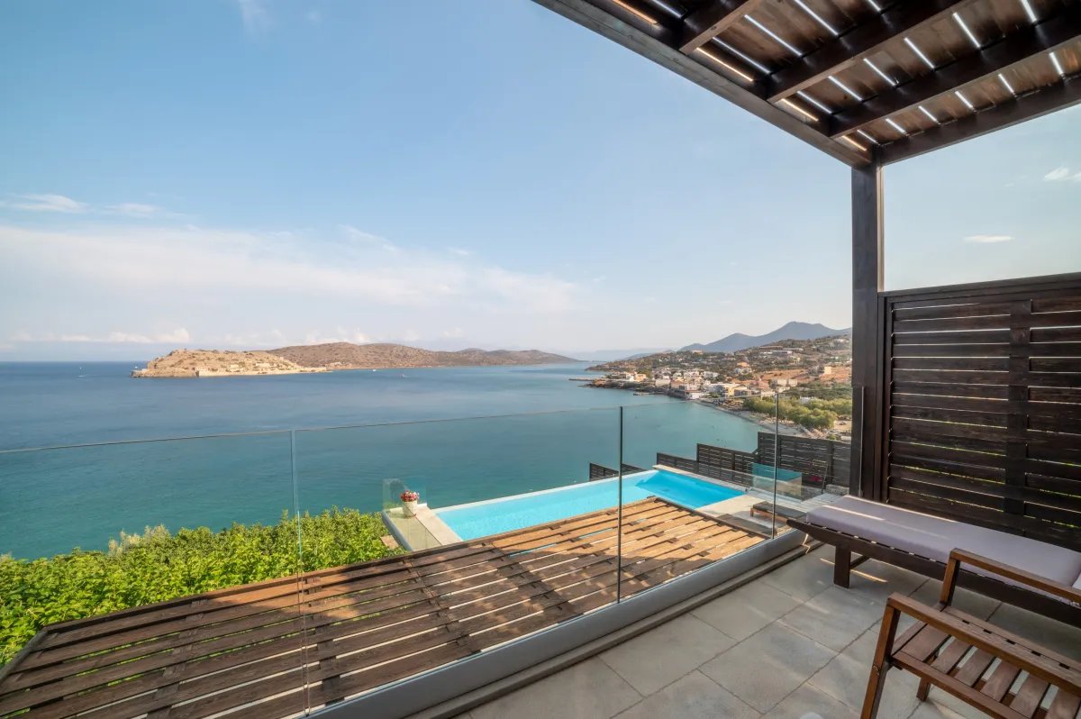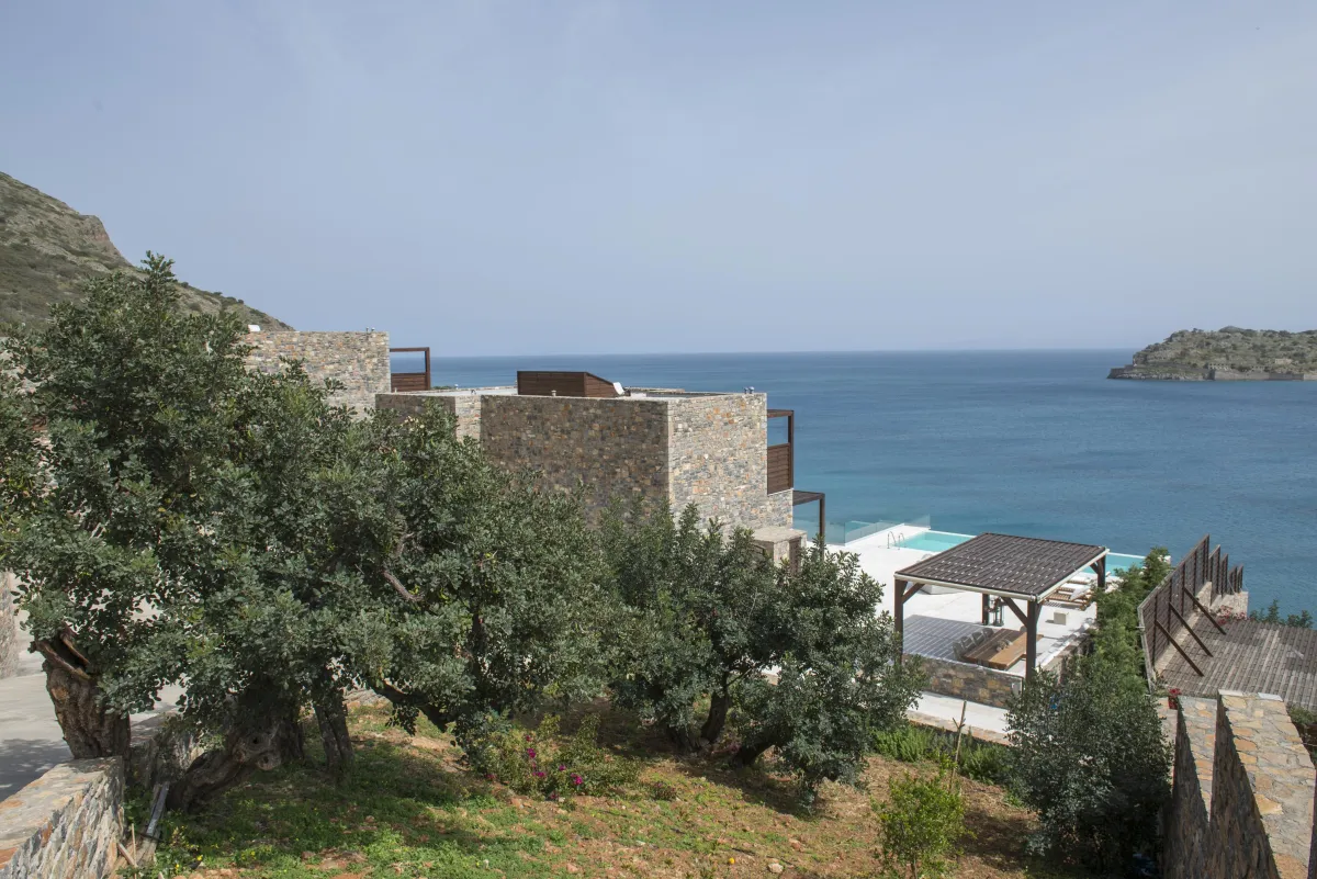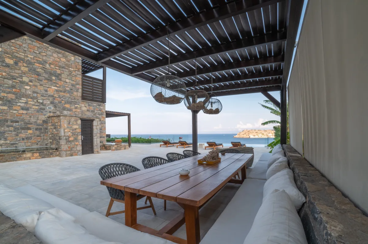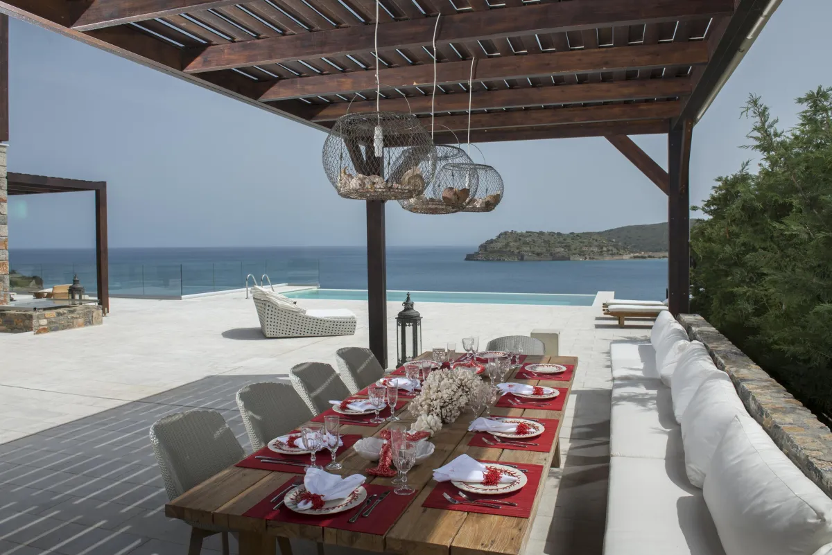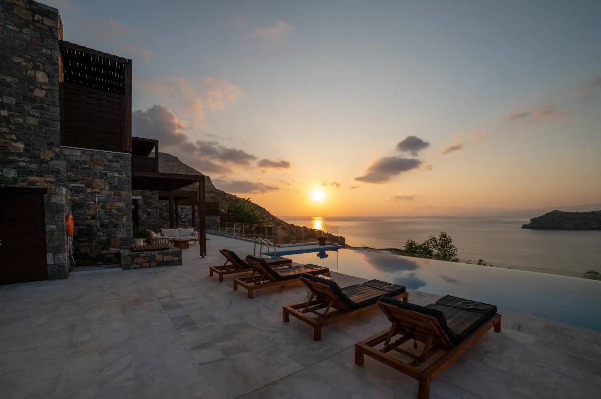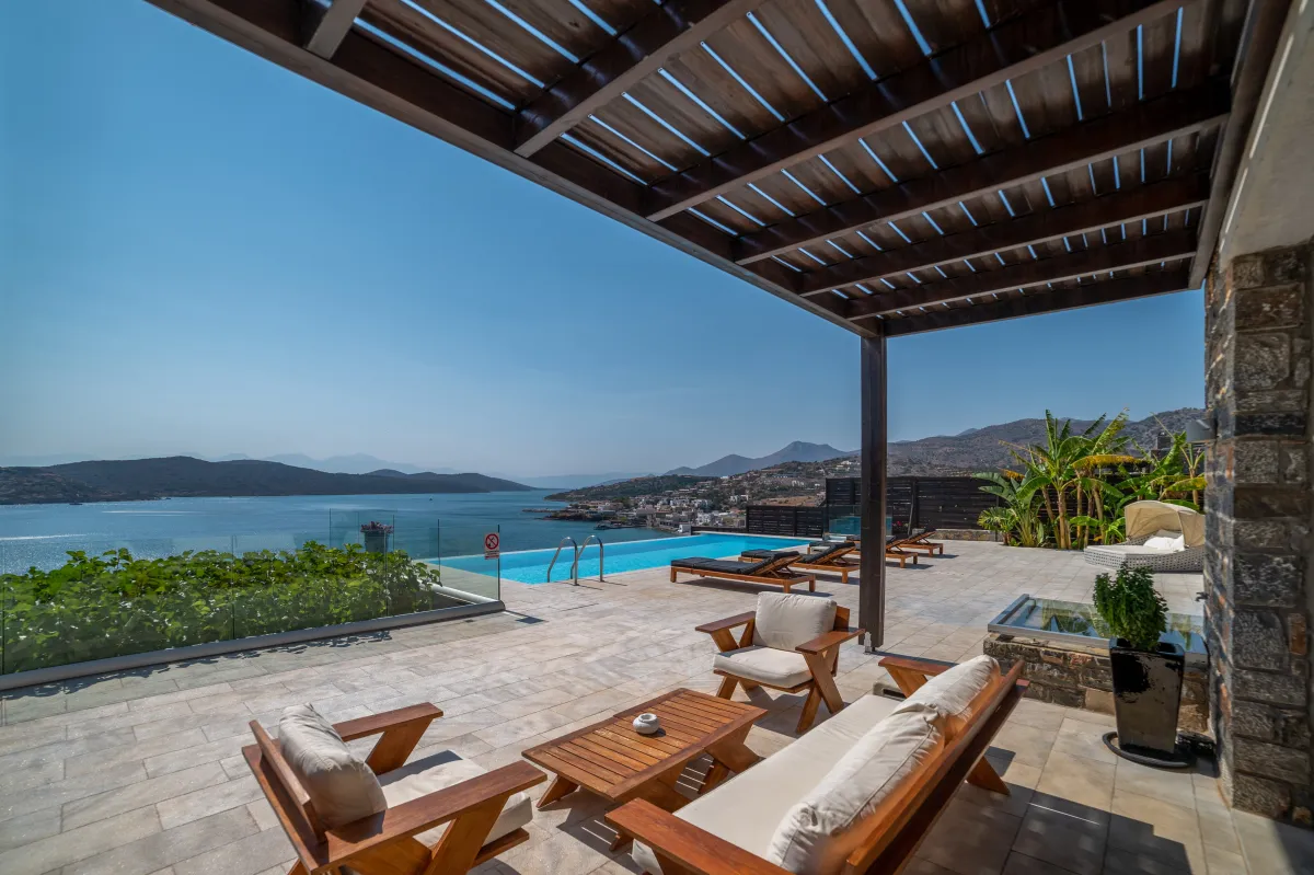 Extravagant eco-chic holiday villa to rent for your best holidays ever, with Ocean Views and private beach, featuring an architectural jewel, overlooking the historical Spinalonga and nearby Elounda, Crete's top resort for luxury-loving celebrities.