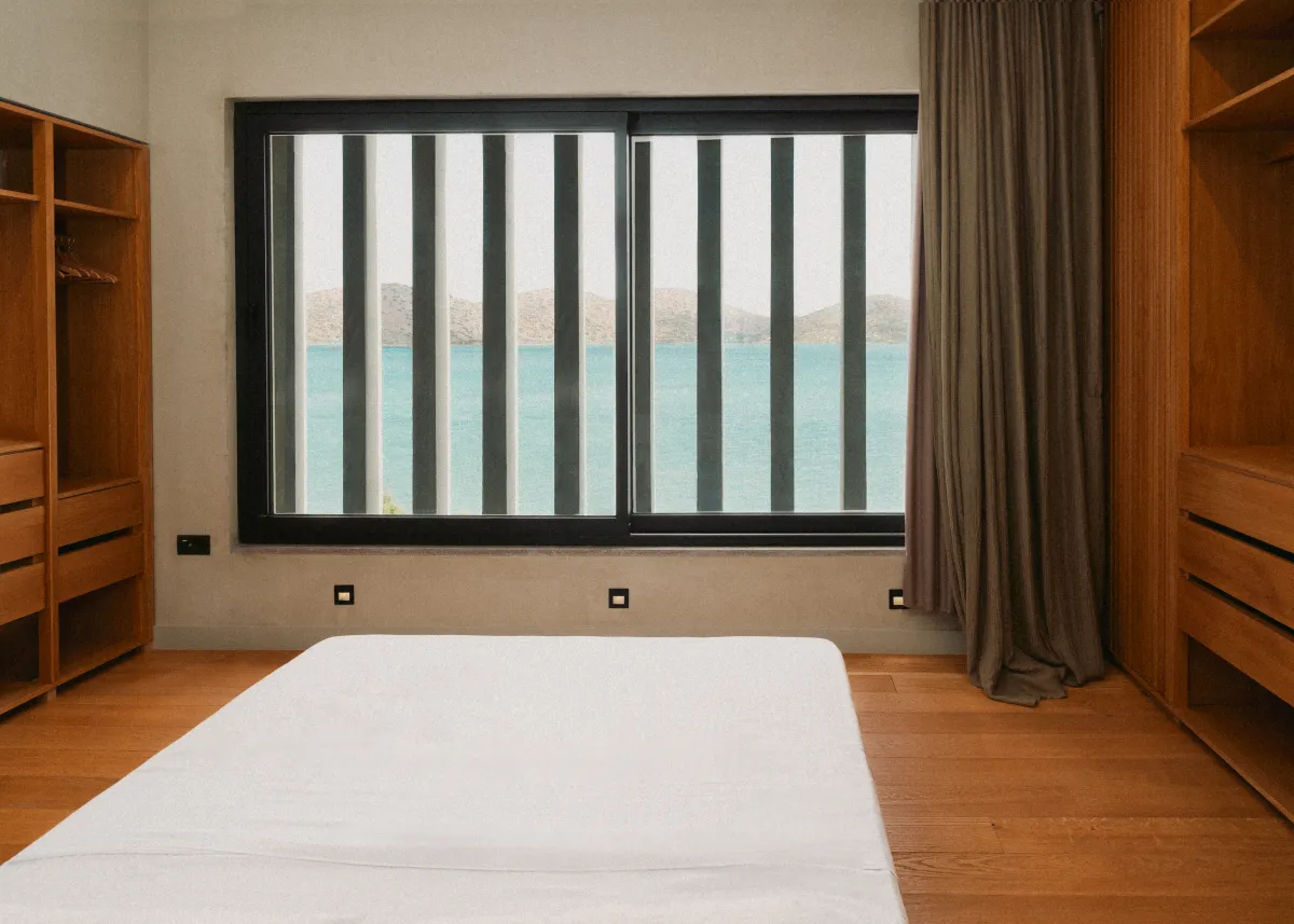 Elounda Gulf Sunrise offers 3 double bedrooms for guests. The ground floor bedroom features a queen-size bed and air-conditioning. The second and third bedrooms are located on the first floor featuring king-size beds, air conditioning, safe, with the third also having an ensuite bathroom.