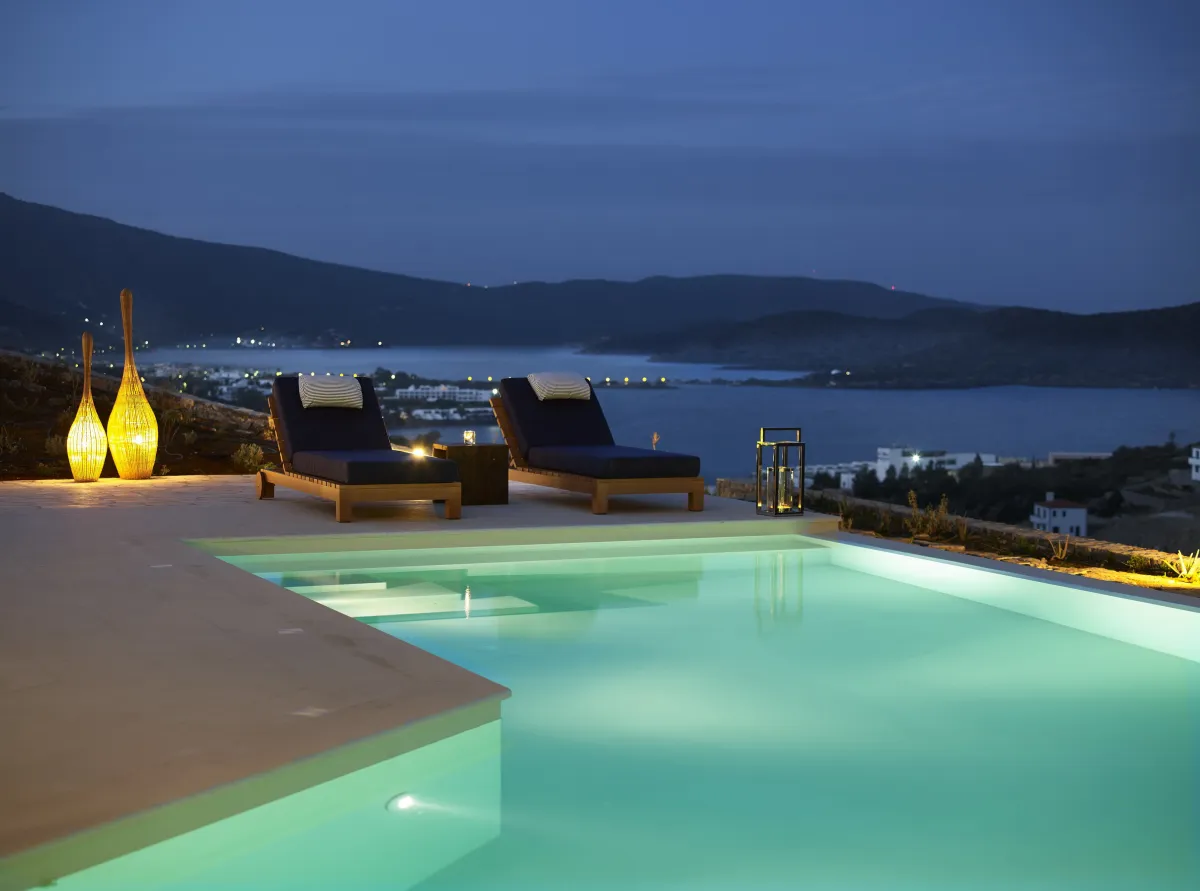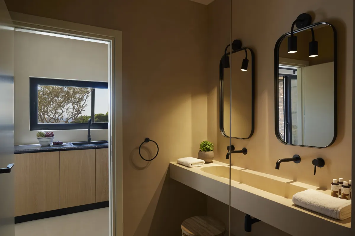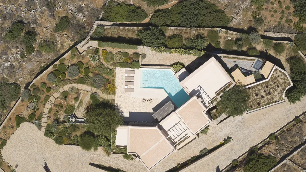 The 352m2 interiors are beautifully furnished in a modern style, appointed with superb media technologies, air conditioning, a study, and a fireplace. An open plan living room with a dining area and a fully equipped kitchen with a bar area, have direct access to the external area and pool. Six spacious bedrooms are thoughtfully designed to enhance the precious sense of comfort and privacy, to accommodate up to twelve guests. There is also a two bedroom Garden Suite as part of Villa Two and just by the side of it. The Suite consists of two bedrooms both with ensuite bathrooms, one shared kitchenette, a small private garden, a jaccuzi and direct access to the pool or to the living room of the main Villa via stone paved paths which can accommodate up to 4 people.The one bedroom has the flexibilty to by converted into a twin room or into a living room if the guests wish so, in order to have a proper two spaced Suite.