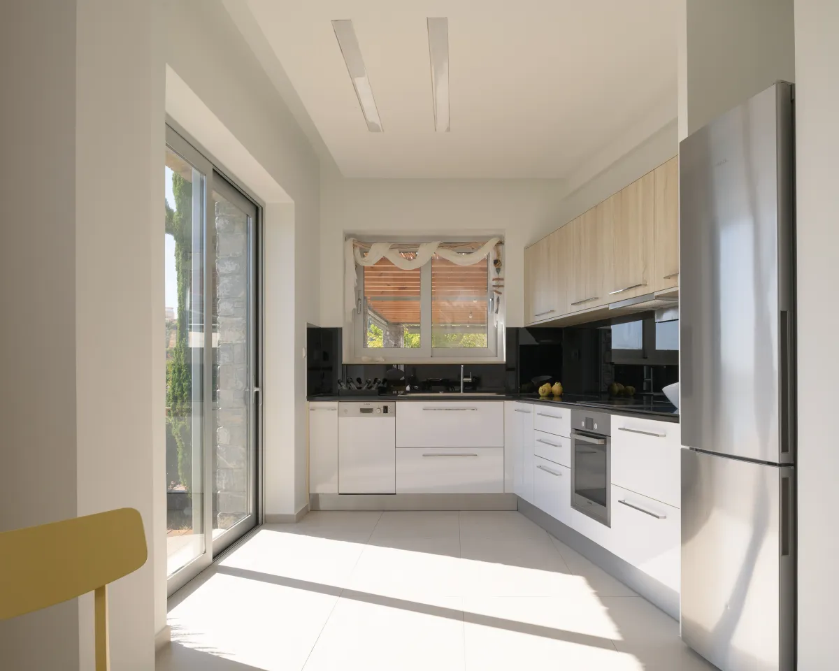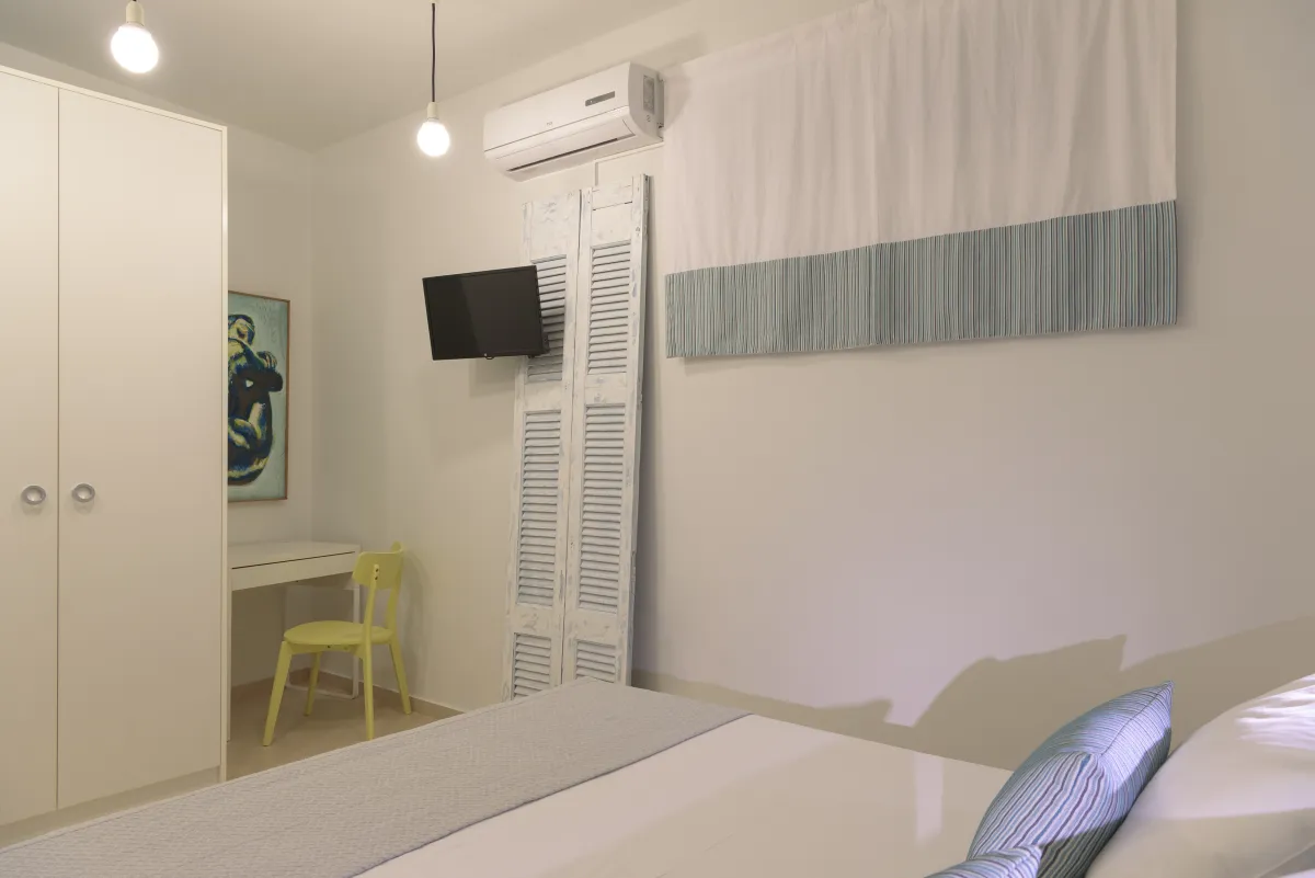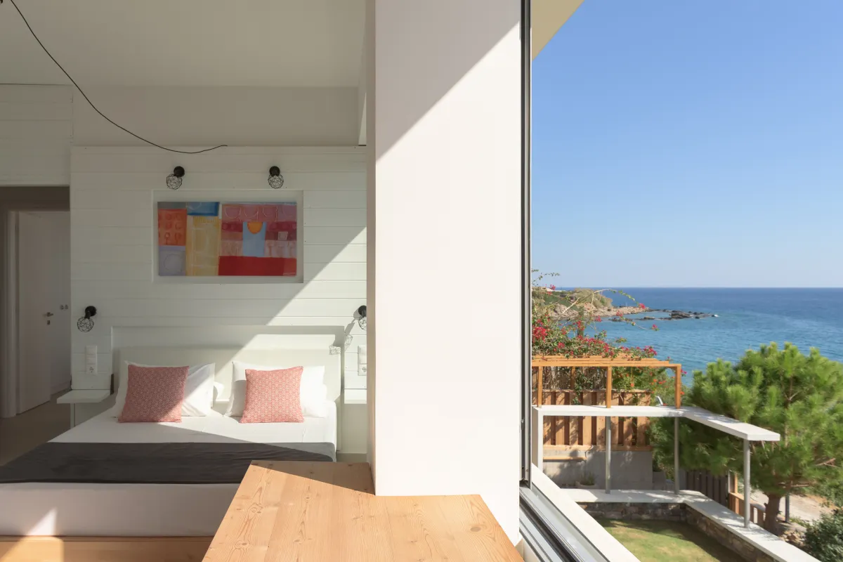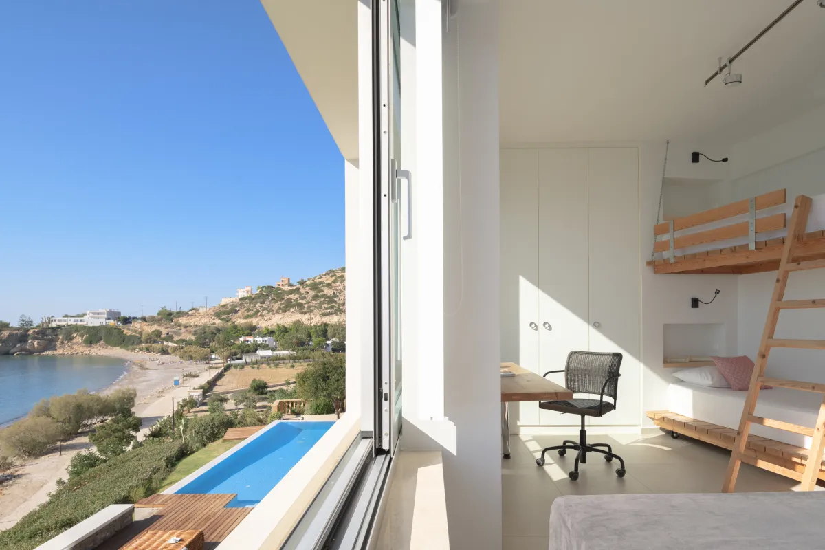 The luxury Thalassa Villa has 4 double bedrooms, 3 with king-size beds and one with a queen-size bed. The villa also has a double bunk bed. All the bedrooms are tastefully decorated with neutral shades and fitted with TVs, air-conditioning. Two of them have large sea-facing windows. There are 2 full bathrooms and one WC, and guests are provided with bath towels and toiletries. Fresh linens are provided for villa guests.