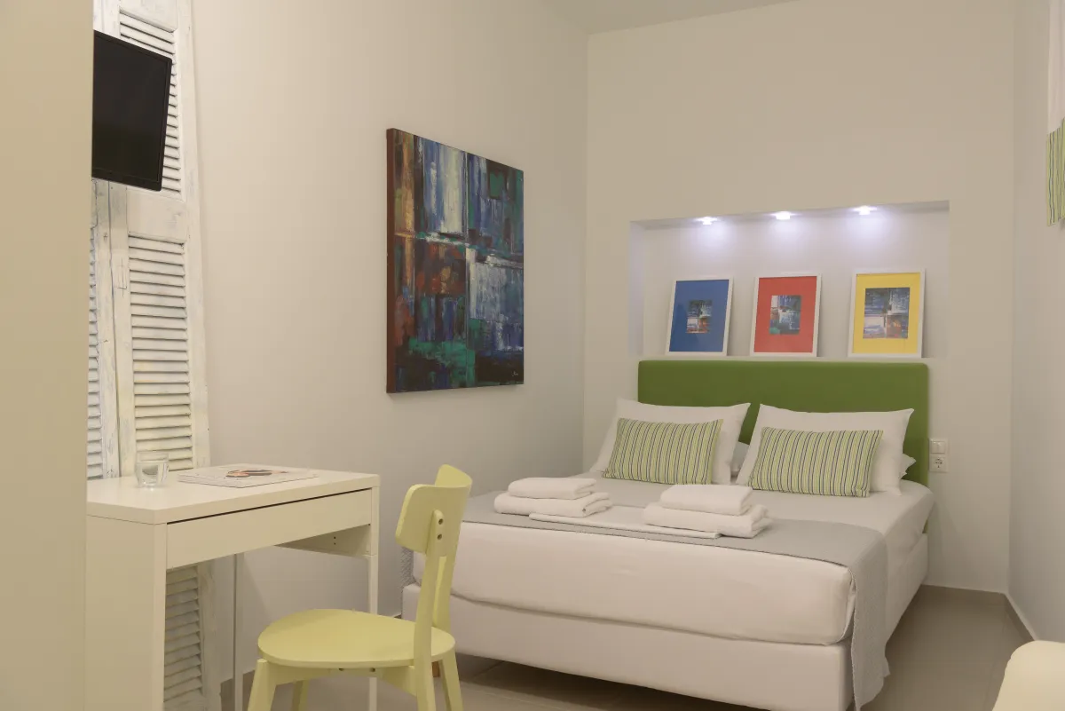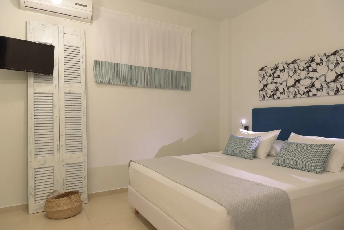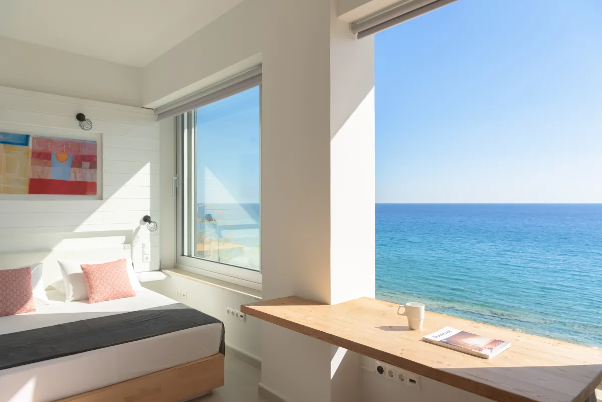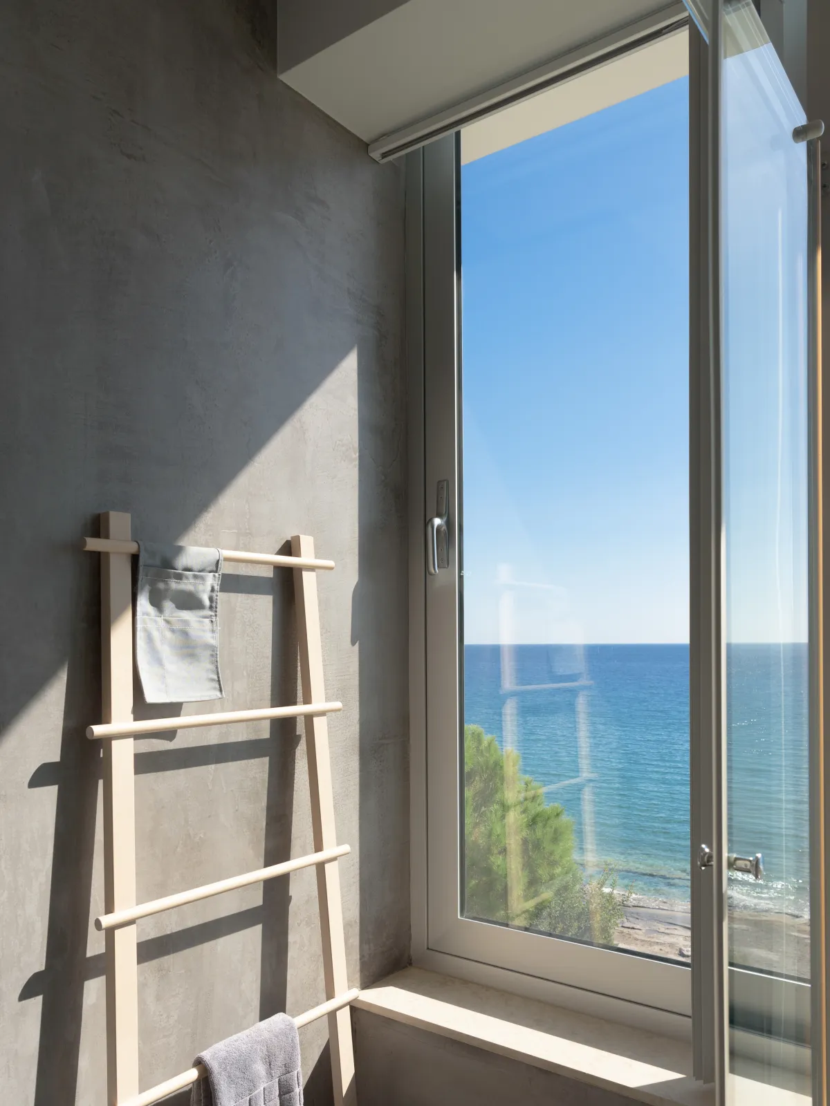 The luxury Thalassa Villa has 4 double bedrooms, 3 with king-size beds and one with a queen-size bed. The villa also has a double bunk bed. All the bedrooms are tastefully decorated with neutral shades and fitted with TVs, air-conditioning. Two of them have large sea-facing windows. There are 2 full bathrooms and one WC, and guests are provided with bath towels and toiletries. Fresh linens are provided for villa guests.