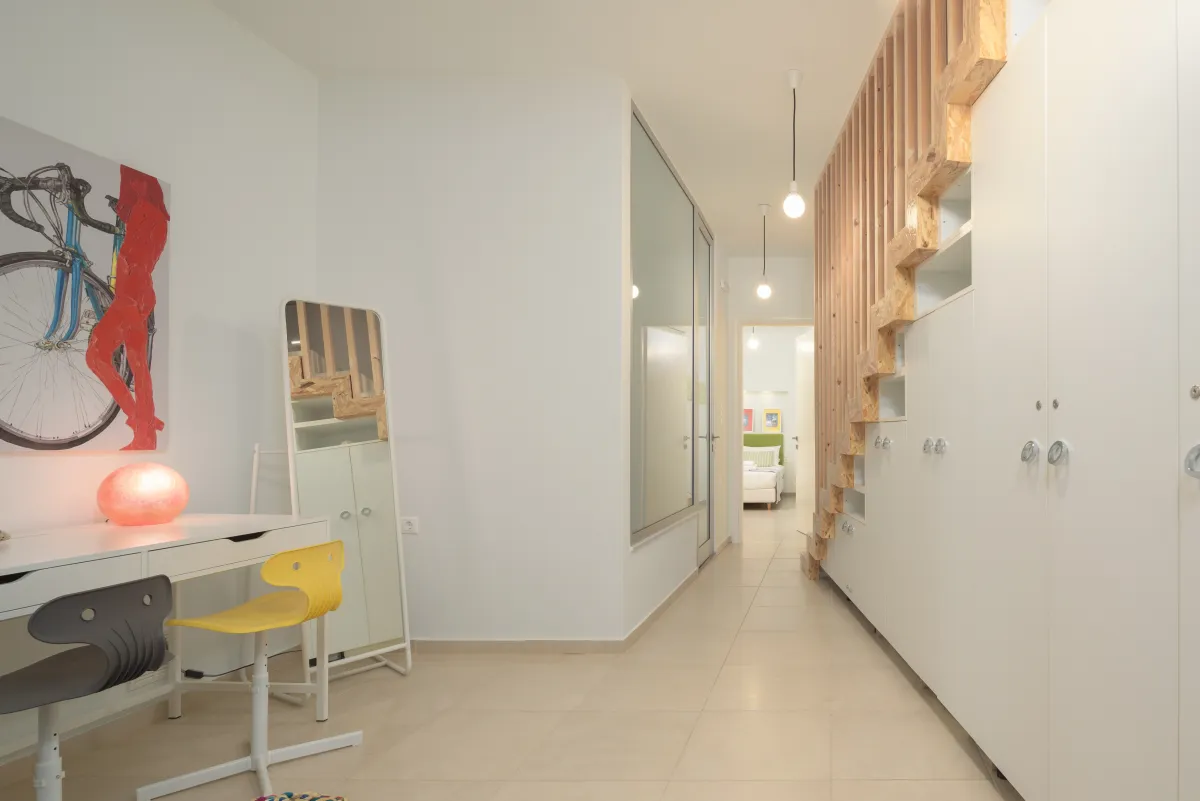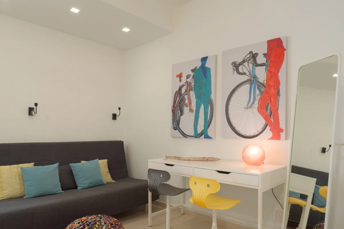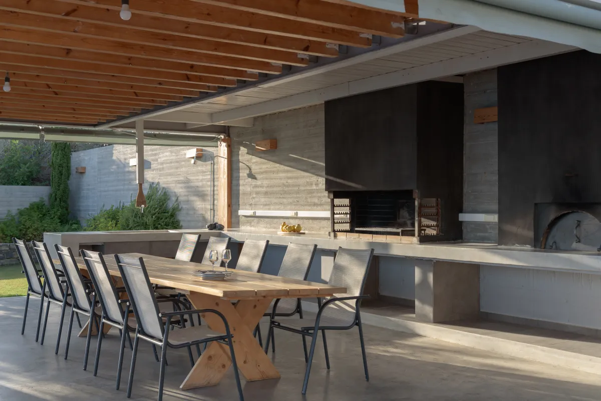 The stylish living room is furnished with a large sectional sofa and boasts a 50” Smart TV with satellite. There is additional seating in the room for leisurely chats and board games. The villa offers an open-plan layout, complete with a dining area with ample seating for 10 guests and a contemporary, well-equipped kitchen featuring an oven and stove, dishwasher, fridge, filter coffee machine, and Nespresso.