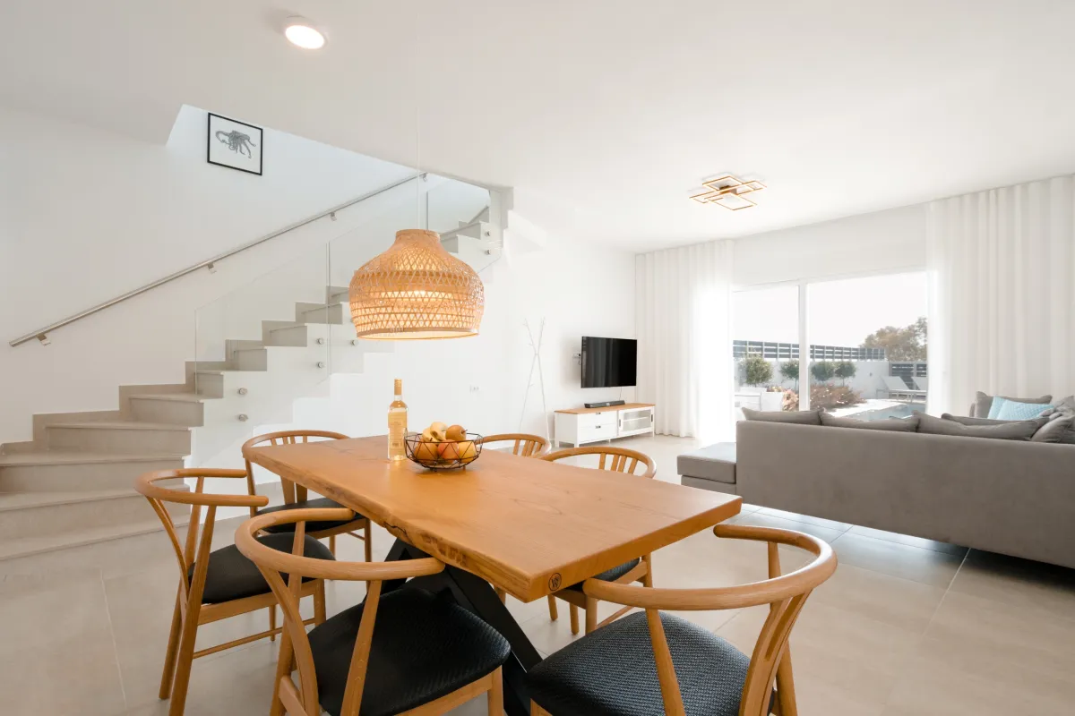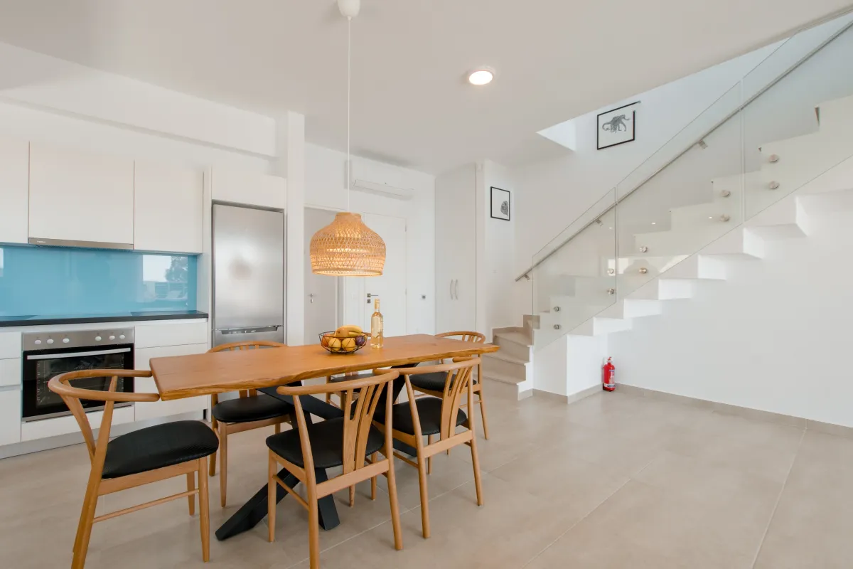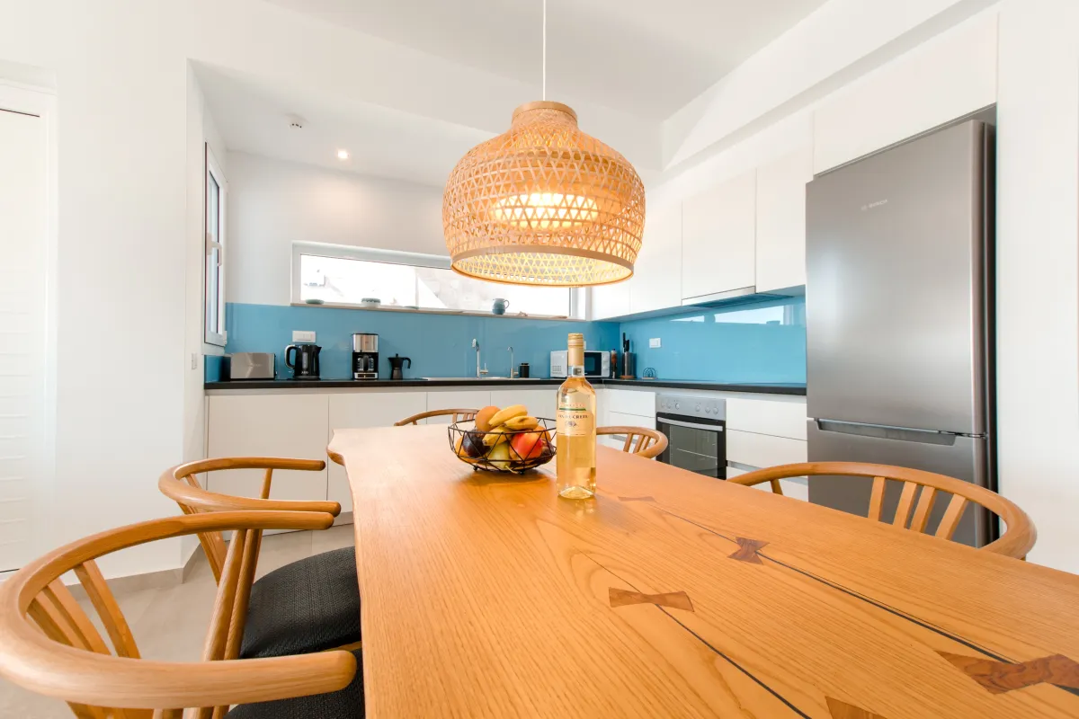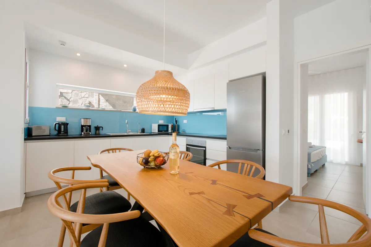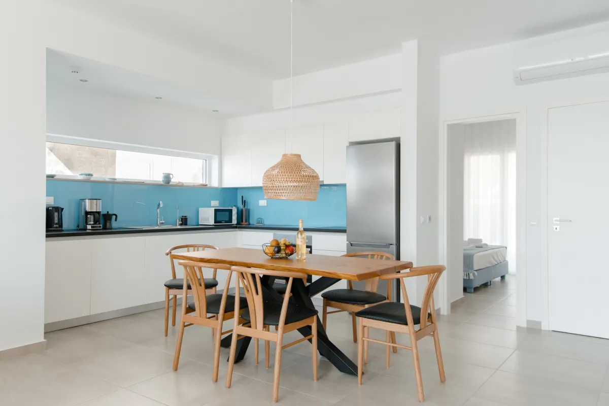 The Villa Marina Hills is designed with an open-plan kitchen, dining area, and lounge. The lounge is spacious and furnished with ample comfortable seating and a coffee table. The dining area features a contemporary dining suite seating 6 guests. The modern kitchen is equipped with all the necessary amenities including a coffee machine, toaster, refrigerator, freezer, oven and stove, dishwasher, electric kettle, and kitchenware.