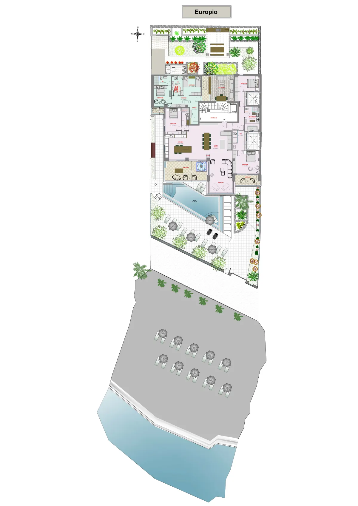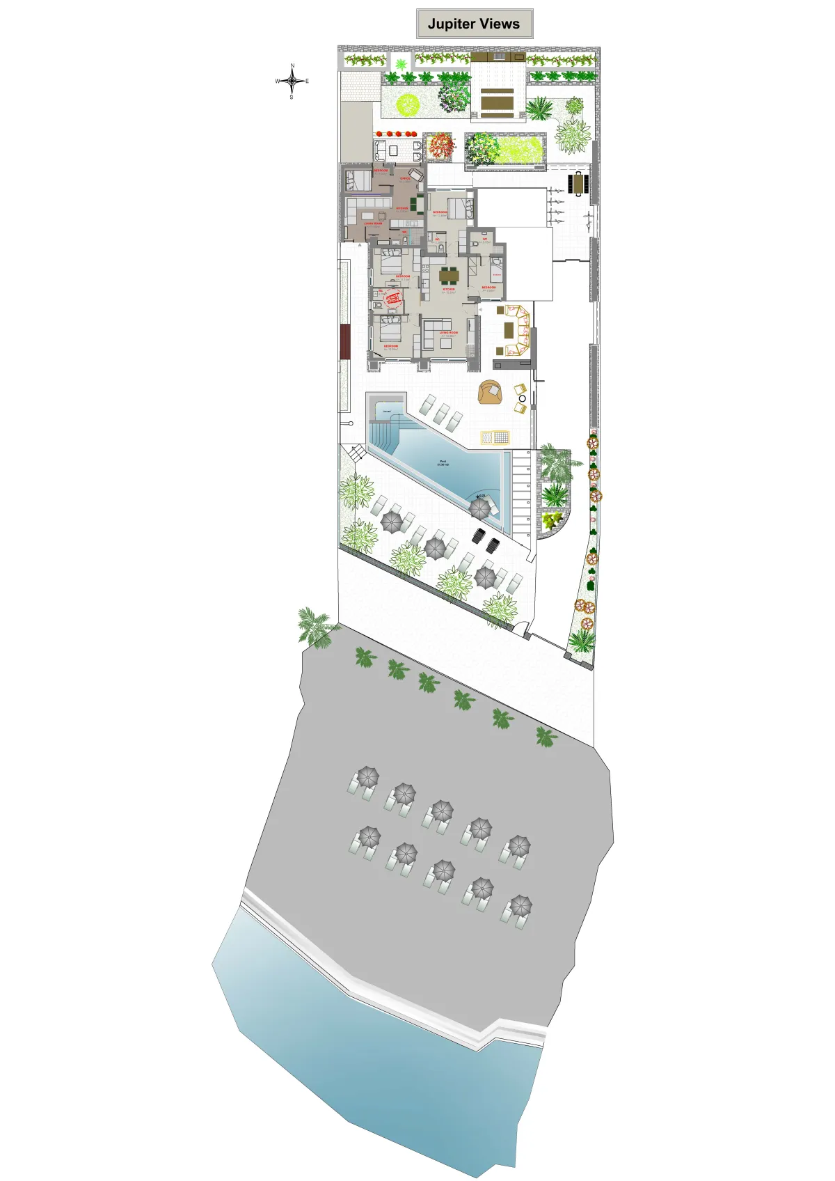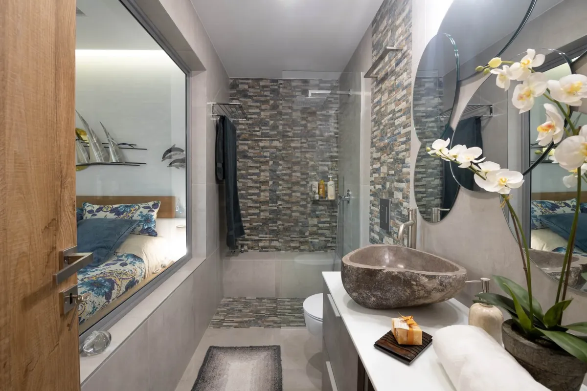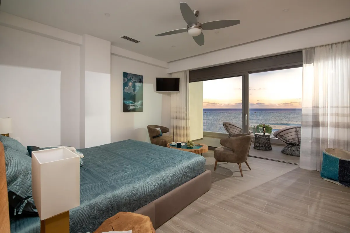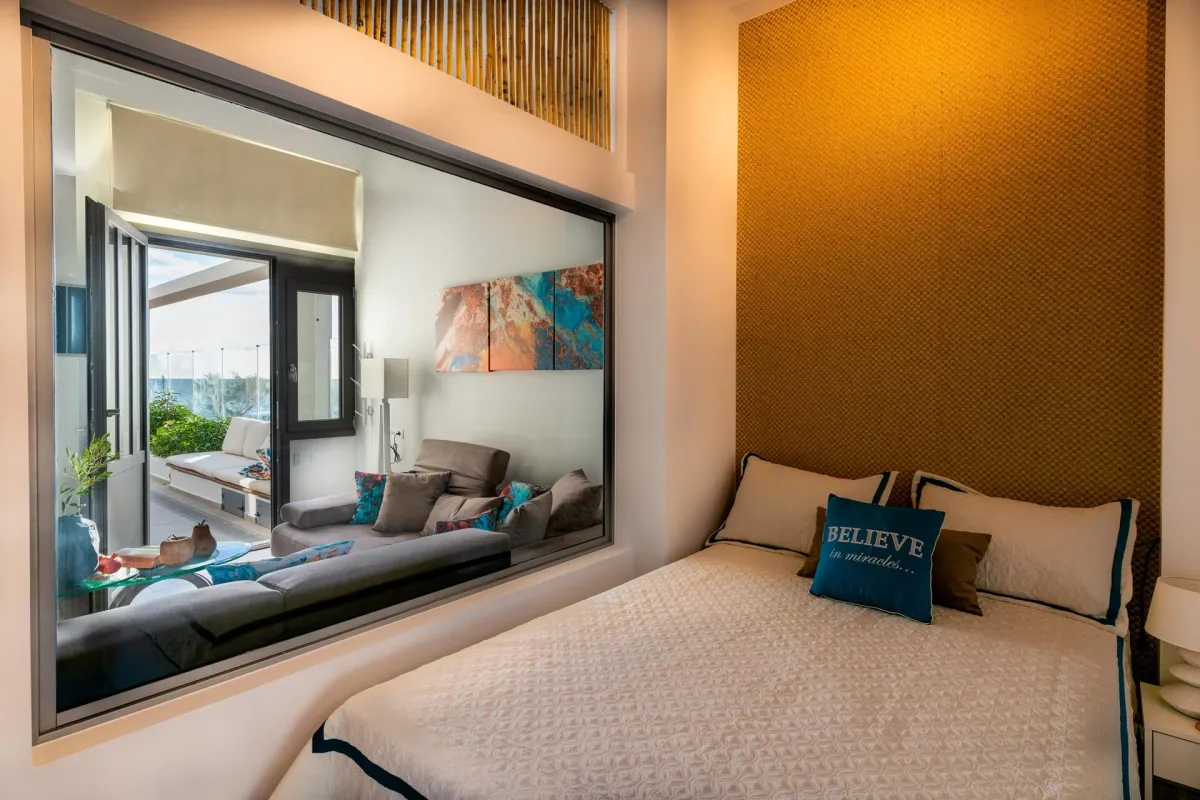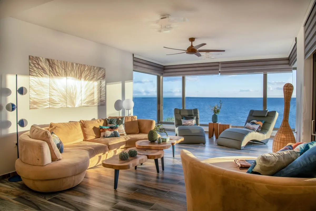 The residence includes 3 bedrooms and 3 bathrooms, all with sea views. The master bedroom, in the southeast corner, has a king-size bed, an en-suite bathroom with a shower, and a balcony with lounges. The second bedroom on the west side offers a king-size bed and a private bathroom. The third bedroom has a queen bed. A third bathroom, with a whirlpool tub and separate hydro-massage shower is also available to guests. It can accommodate up to 7 people.
