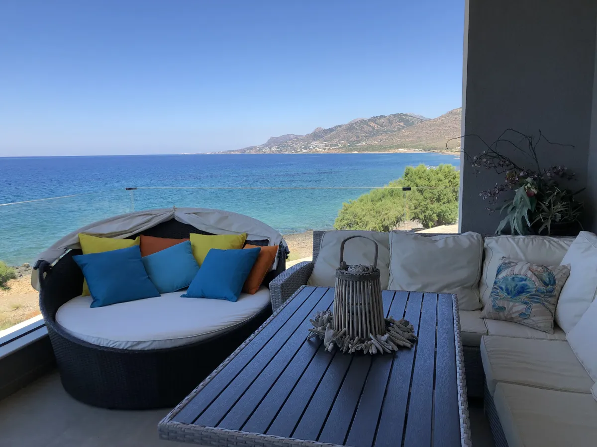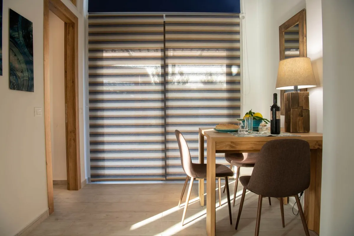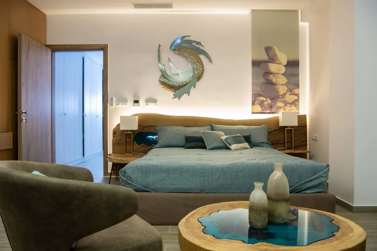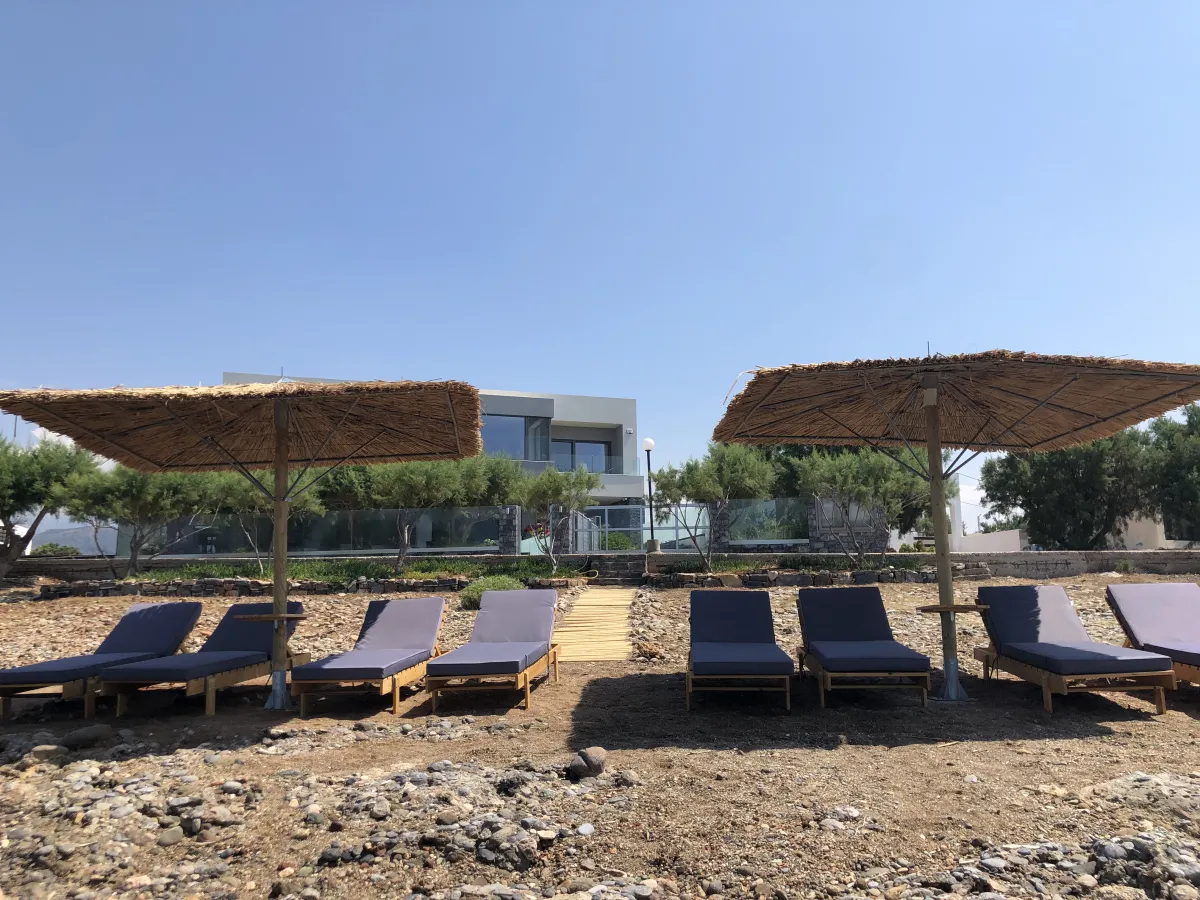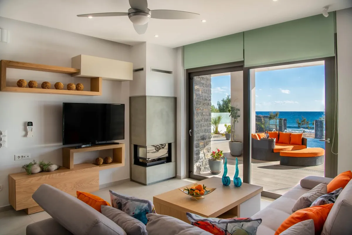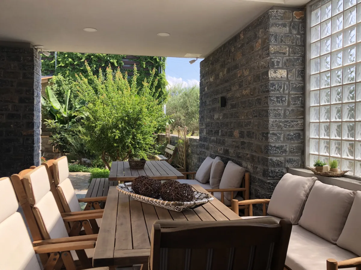 Io features 2 bedrooms, 2 bathrooms, and two verandas. The master bedroom, with a double bed and en-suite bathroom, offers beautiful southwestern views of the sea and surrounding landscape. The second room facing the garden serves as both a living room and bedroom, equipped with a sofa bed and bunk beds to accommodate up to 4 additional guests.