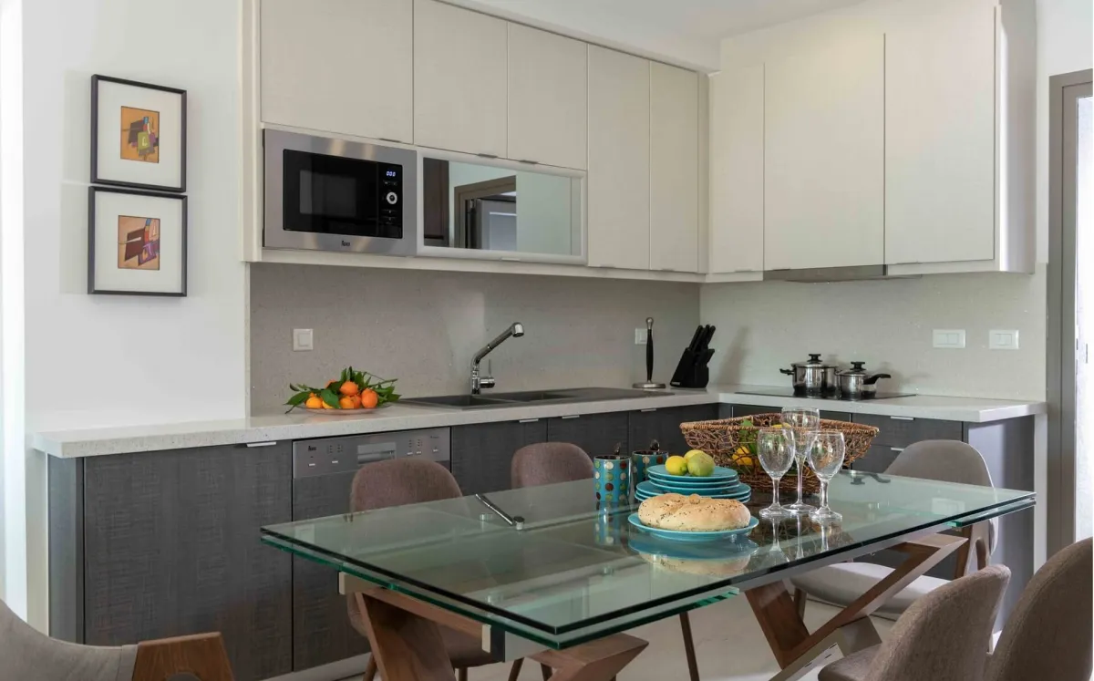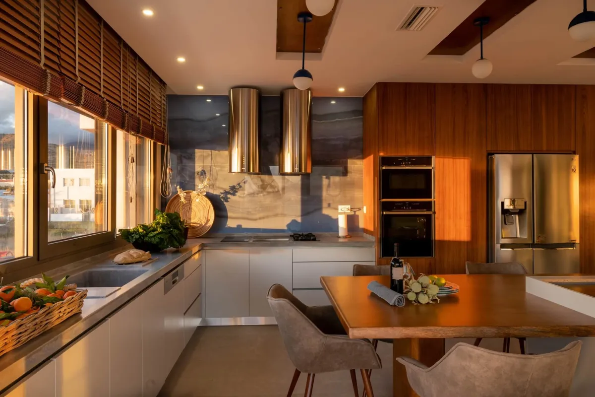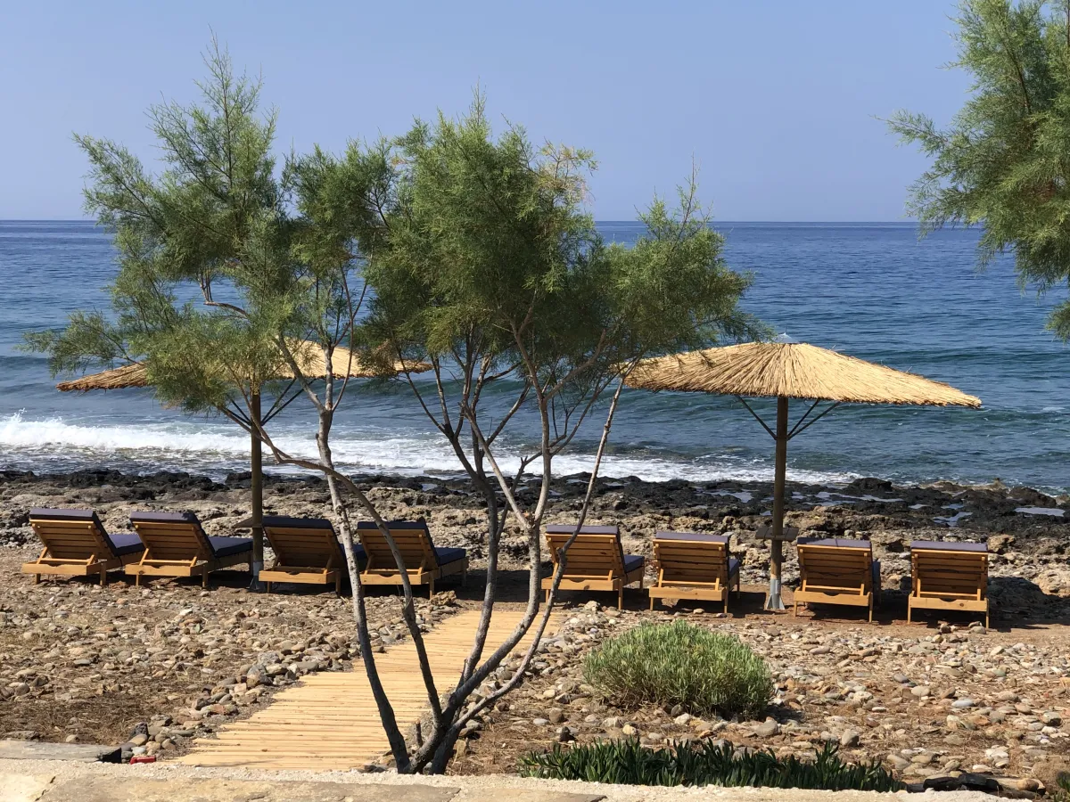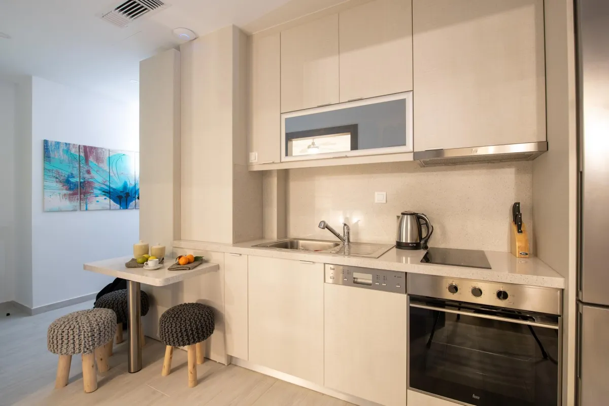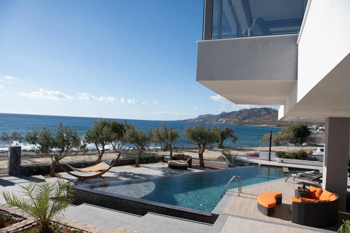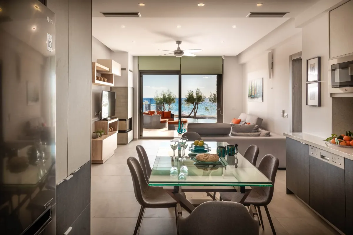 Io features 2 bedrooms, 2 bathrooms, and two verandas. The master bedroom, with a double bed and en-suite bathroom, offers beautiful southwestern views of the sea and surrounding landscape. The second room facing the garden serves as both a living room and bedroom, equipped with a sofa bed and bunk beds to accommodate up to 4 additional guests.