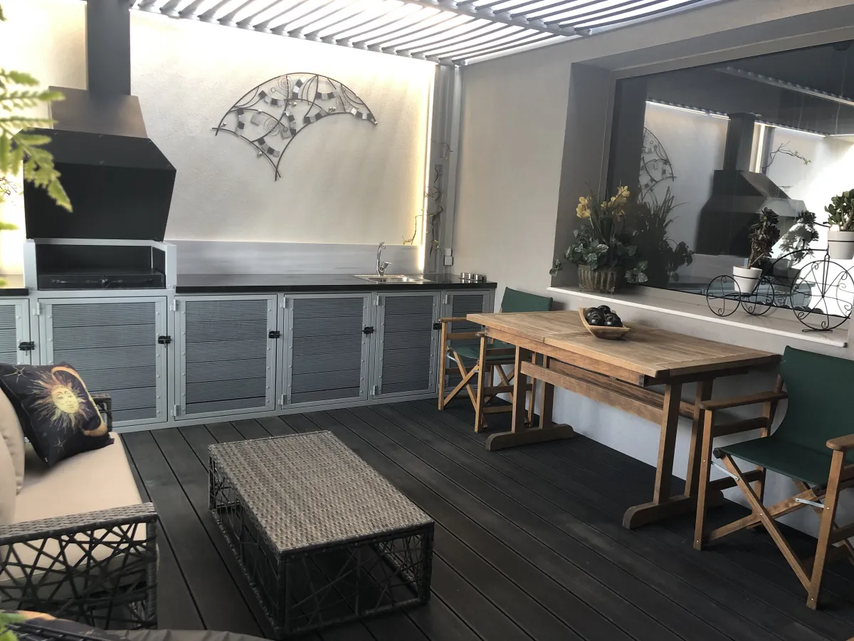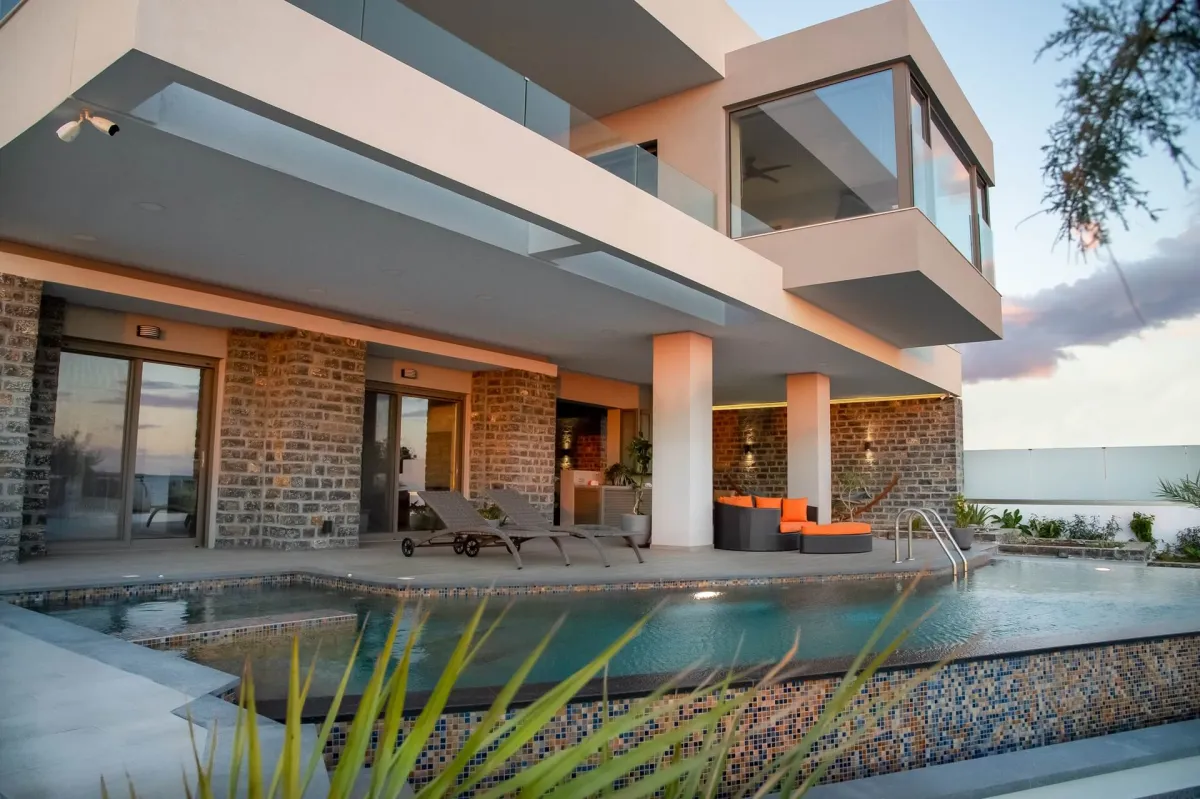 The back terrace has a shaded pergola, lounges, BBQ, outdoor kitchen and dining table. Io is a handicapped-accessible residence, featuring a fully wheelchair-accessible bathroom and elevator access. It can accommodate up to 6 people.