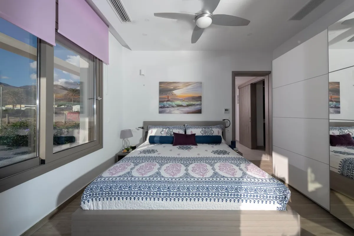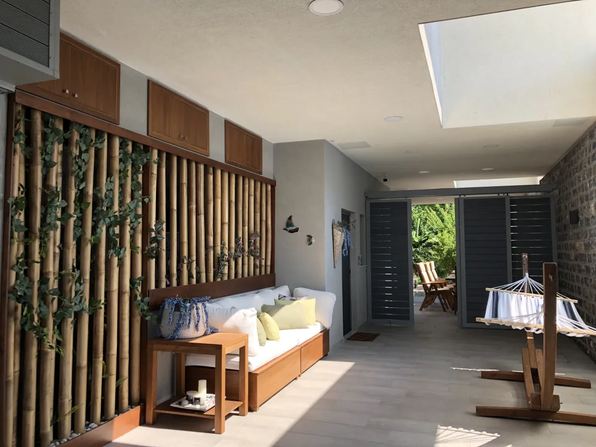 Callisto offers a cozy living space with a fireplace, corner sofa, and an open-plan kitchen. Expansive verandas provide an outdoor dining area and pool bar. The villa has 4 bedrooms and 3 bathrooms. The master double bedroom connects to front verandas and the outdoor pool. It shares a handicapped-accessible bathroom with a second bedroom, featuring Double bed & one pull-out single bed. The third bedroom has Two wall-mounted and folded bunk beds (1 adult or 2 kids)and ensuite bathroom. And the 4th has has a queen-sized bed and en-suite bathroom. A separate entrance off the main living area leads to a fourth bedroom with foldable bunk beds and its private bathroom. Callisto is handicapped-accessible, featuring a fully wheelchair-accessible bathroom and flat ground floor access. It can accommodate up to 9 people.