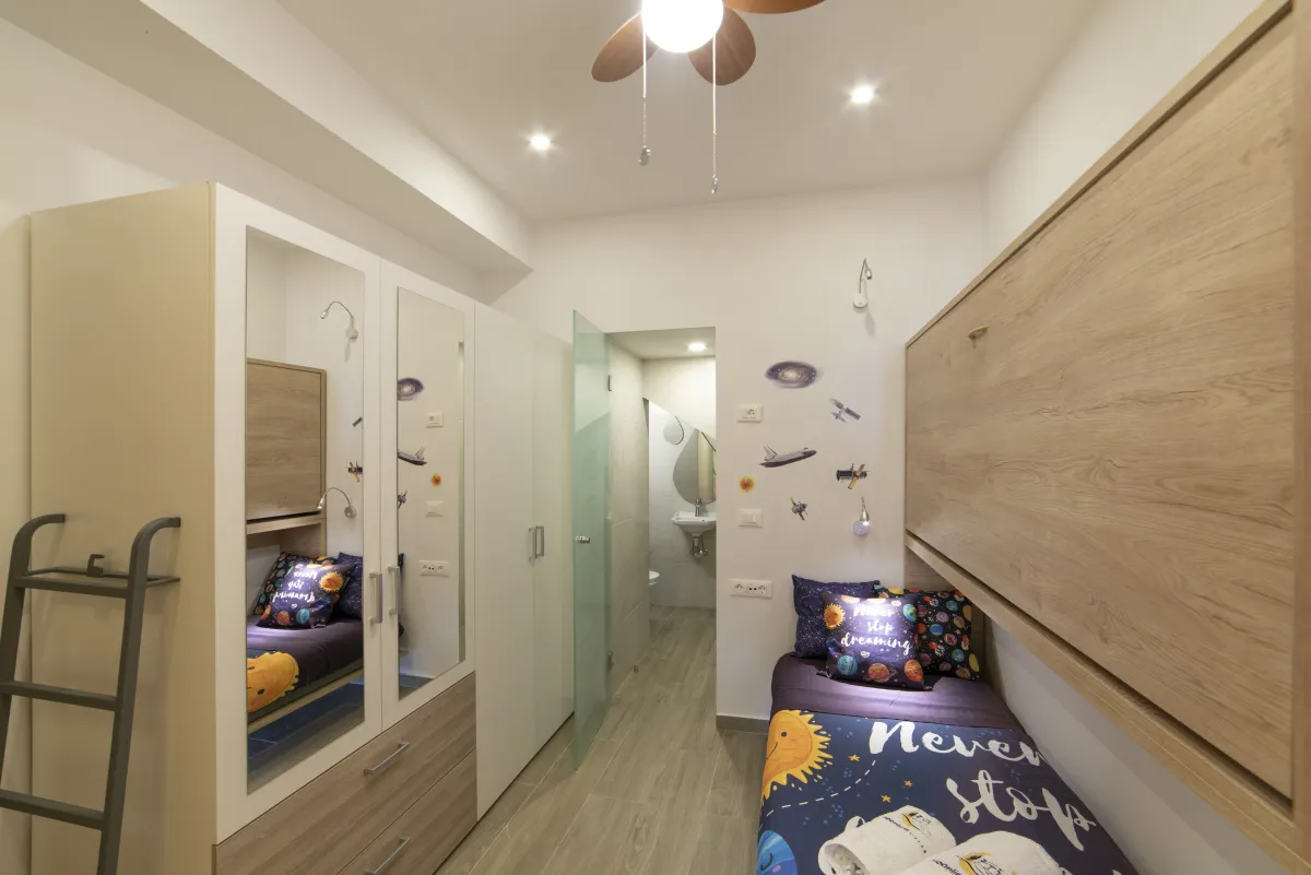 On the west side of Moonlight Villa by the pool terrace, Ganymede studio apartment boasts a cozy living room with a small bedroom featuring a double bed, a corner couch, and a convertible chair for a single bed. There is also a loft bed above the bathroom ceiling where a child can sleep in. Ganymede can accommodate a total of 4 people. The large window overlooks the tranquil back garden, while a smaller one faces the sea.