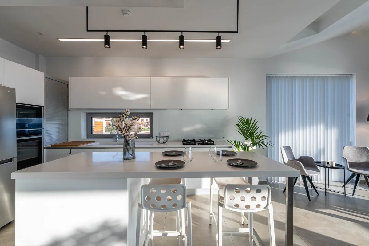 On the first floor, the villa has an open-plan layout with the living room featuring comfortable seating, a 50-inch Smart TV as well as air-conditioning for guests to enjoy. The elegantly furnished dining area seats all guests comfortably and is stylishly decorated in natural seaside tones. Villa Nouvelle offers a fully equipped kitchen area with facilities that include a stove, oven, dishwasher, fridge, toaster, nespresso machine, etc.