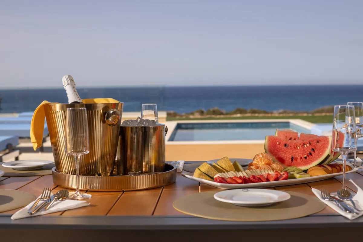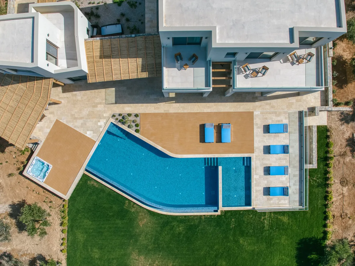 Between the two buildings lies a breathtaking 15-meter infinity pool with active oxygen, appearing to merge with the Aegean Sea. Take a refreshing dip or relax on the plush sunbeds. The pool includes a separate shallow area for children, and a soothing jacuzzi offers the perfect spot to unwind after a day of exploring the island.