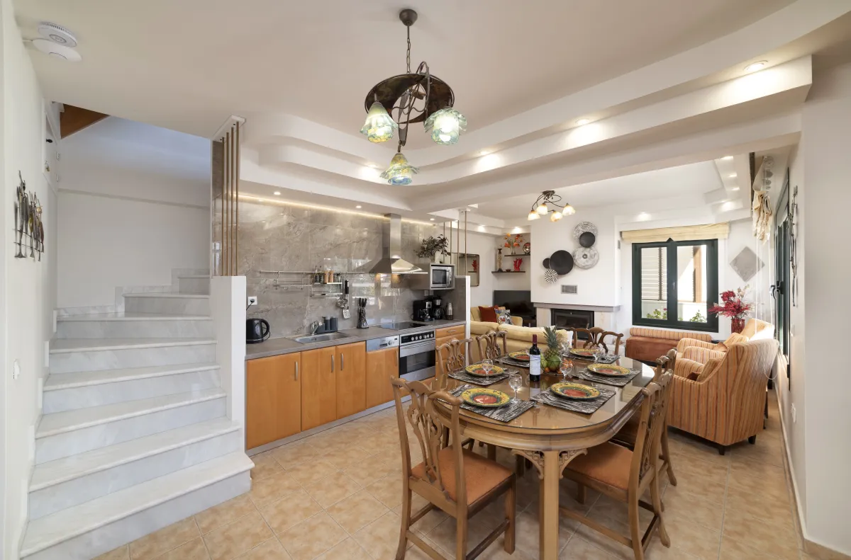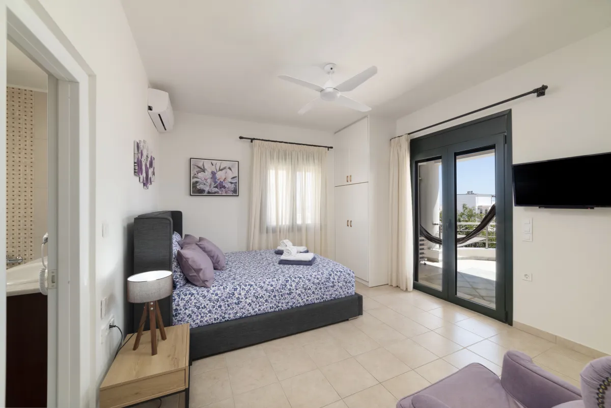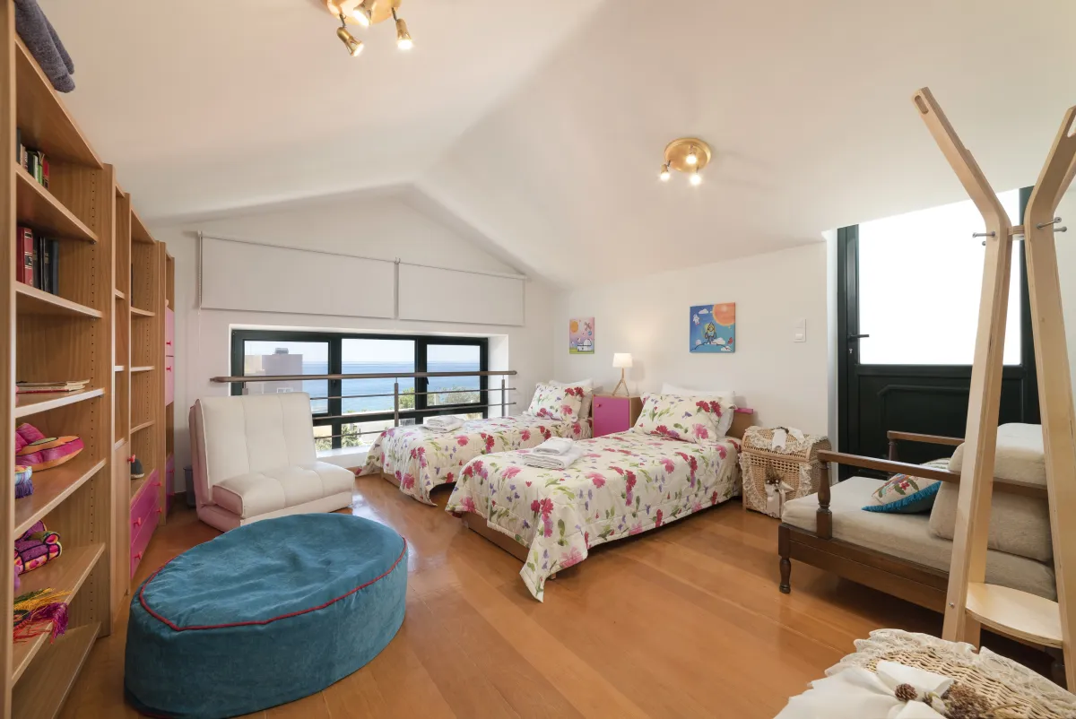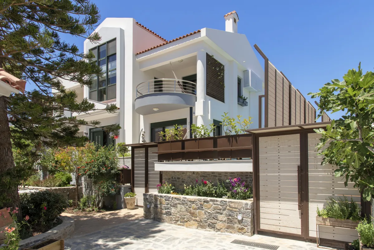 Mimoza Villa is a self-catering vacation home suited to a family gathering with 5 bedrooms and a garden with mature tall arokaria and mimoza trees and a beautiful beach only 4 minutes away, in a non-touristy area of southeast Crete, where popular activities include hiking, swimming, and splurging in local tastes. In Mimoza Villa, you can stay in comfort with peace and quiet ,just a few minutes from the beach, in Lassithi, southeast Crete, which is full of hidden treasures to reward regular return visitors. Mimoza Villa is an air-conditioned vacation home consisted of 2 living rooms with a fireplace, a modern kitchen, 4 private bedrooms with en-suite bathrooms, as well as a loft bedroom and a ground floor patio, plus 3 large balconies with hammocks on the first floor. Wide windows bring views and natural light into key areas in the villa. At Mimoza Villa, you will appreciate the natural shadows created by the many large trees and beds of your private garden, ideal to catch up on some reading and sip Cretan herbal tea underneath after all your sea activities and sightseeing is done.