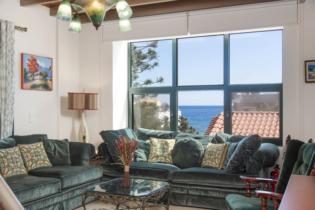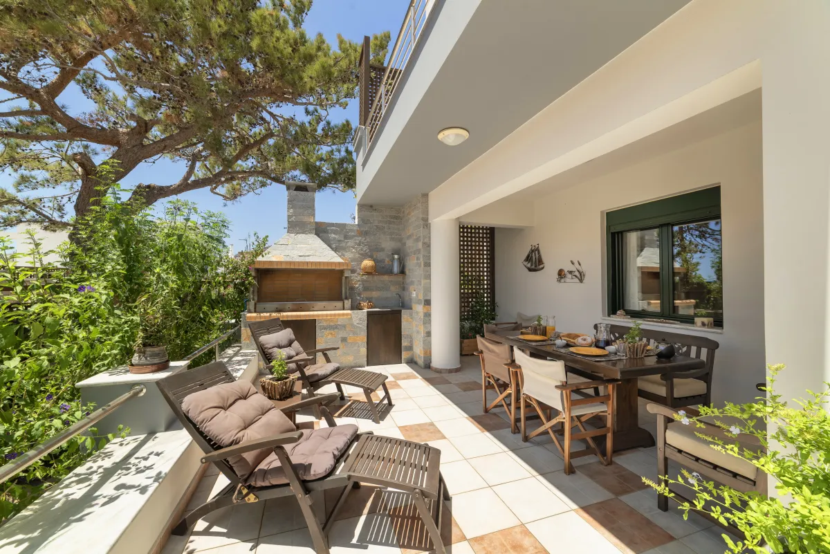 A recently renovated 200m2 holiday mezonette with sea views in a fenced, wooded, secluded lot, with patio and BBQ, inspired by green wilderness and local character few meters away from Koutsouras Beach in southeast Crete, 22 km east of Ierapetra.