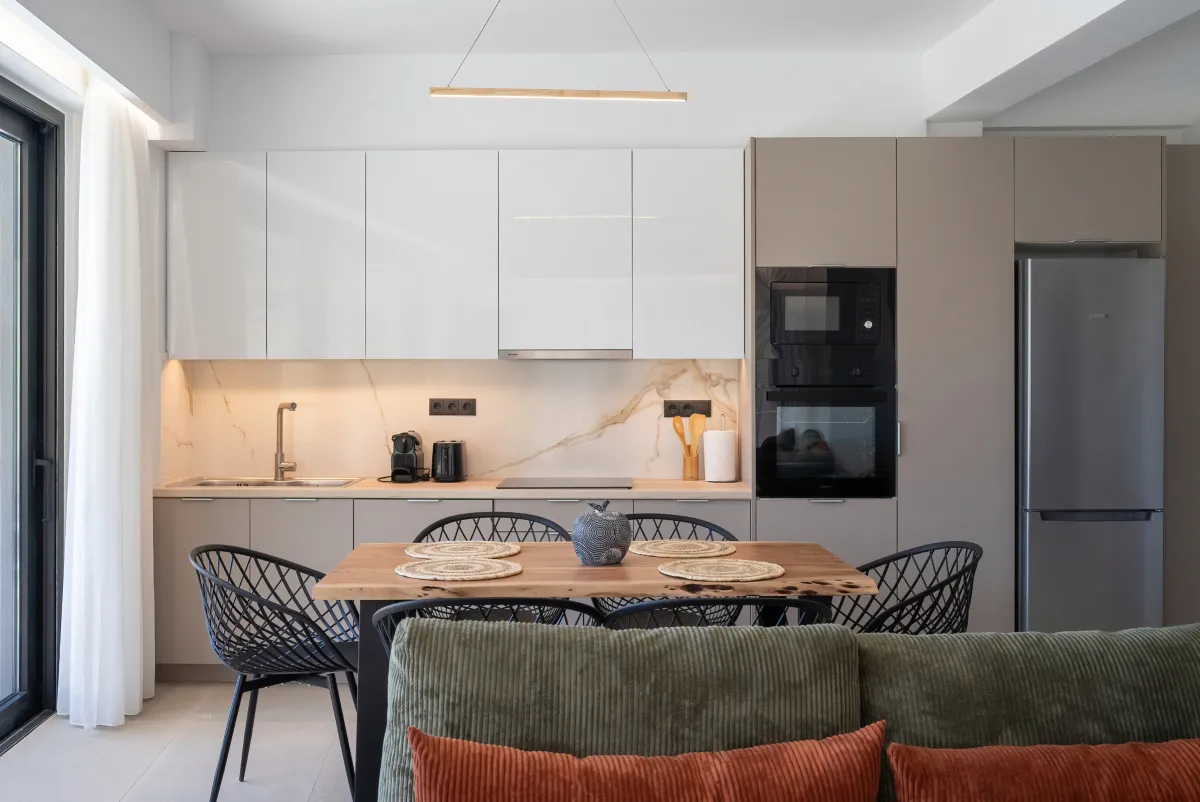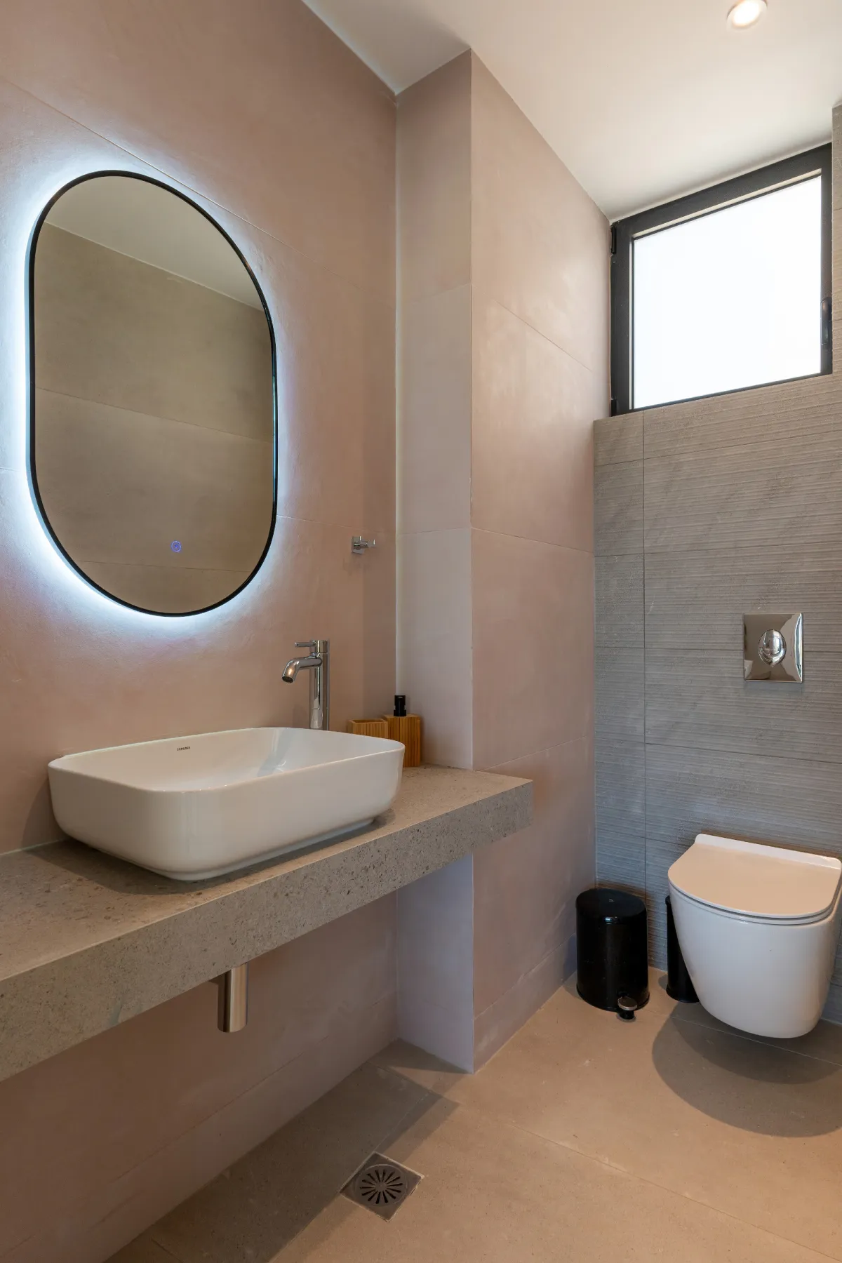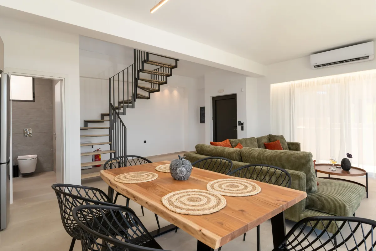 The villa’s lower ground floor hosts an inviting open-plan living space where comfort and technology come together. The lounge area features plush seating, air conditioning, a 55" smart HDTV with satellite channels, and a Bluetooth-enabled stereo system for relaxing with music. The fully equipped kitchen features modern appliances, including a Nespresso machine, microwave, toaster, dishwasher, and even a blender – everything you need to prepare meals to enjoy in the indoor dining area or outside under the stars.