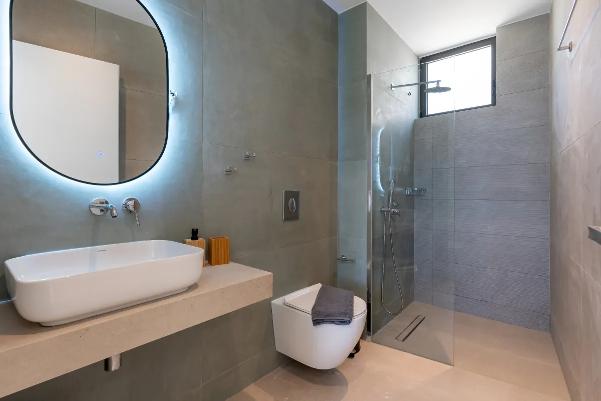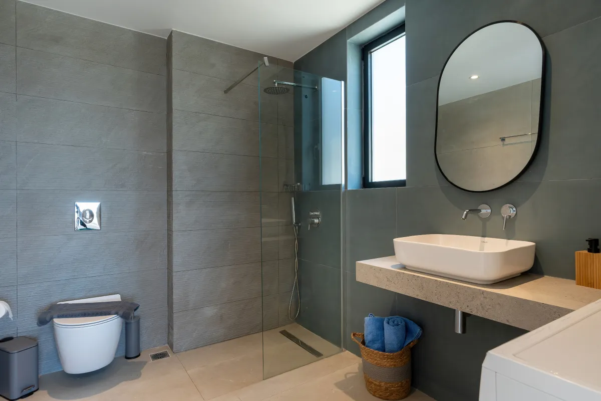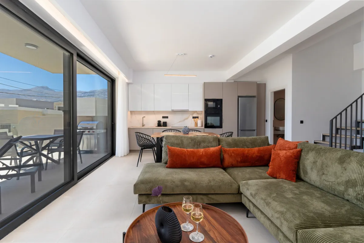 Step outside to discover the heart of Anemoni Villa – its private outdoor pool, perfect for cooling off under the Cretan sun. The pool area is surrounded by four comfortable sunbeds. Nearby, a built-in BBQ and outdoor dining table invite you to enjoy al fresco meals with a view. There’s also a shaded sitting area, an outdoor shower, and secure parking – including a private garage space and room for four more vehicles roadside.