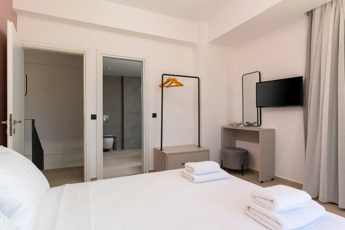 Upstairs, Anemoni Villa boasts two charming bedrooms, each with its own balcony overlooking the sea or the surrounding hills. The master bedroom features a queen-sized bed, air conditioning, an ensuite bathroom, and a flat-screen TV with satellite channels. The second bedroom offers two single beds, its own TV, and access to a second ensuite. With three bathrooms in total, plus extra foldable beds for additional guests, the villa combines comfort with flexibility for families or small groups.