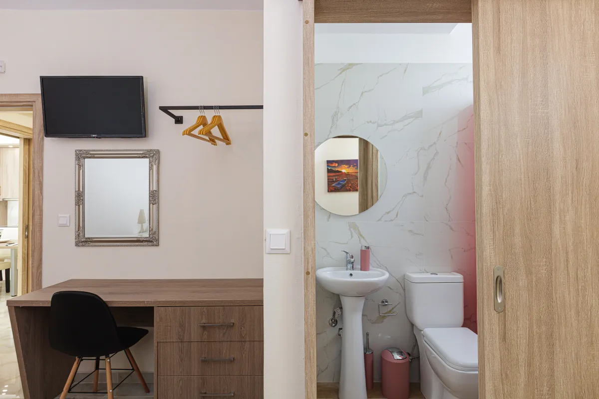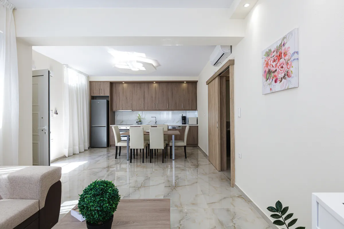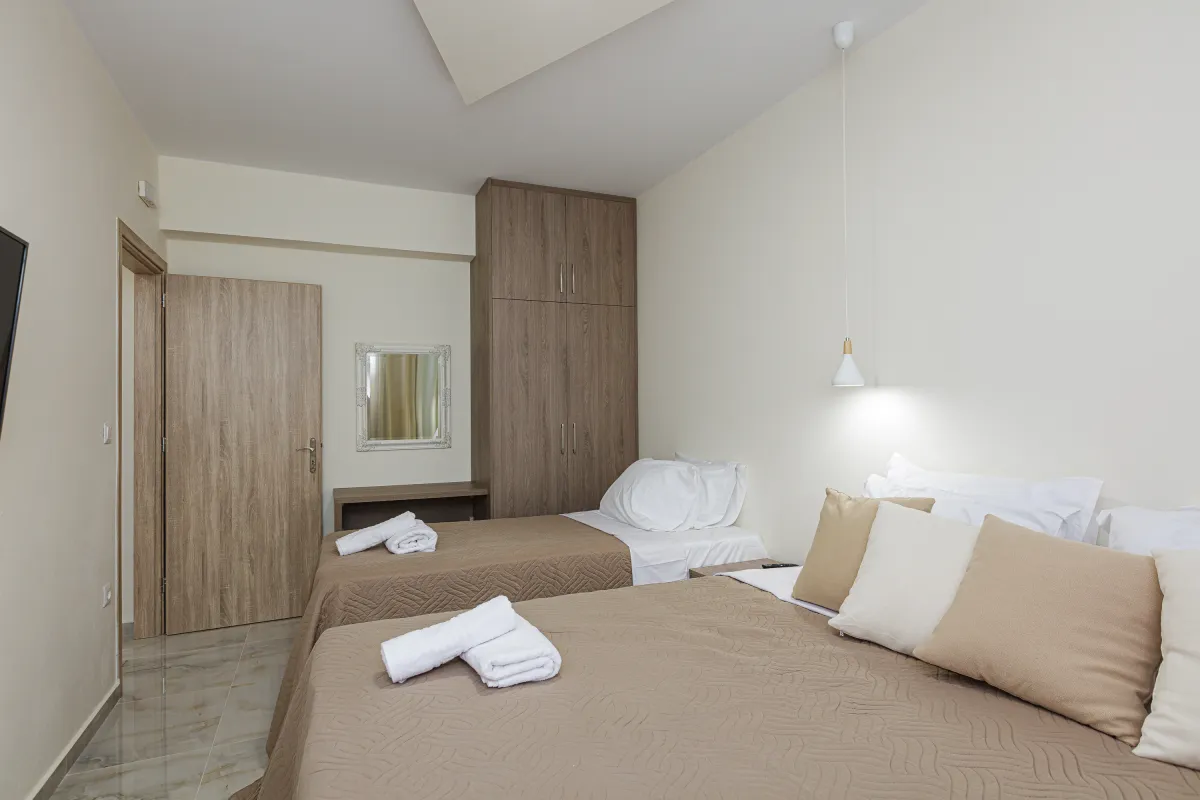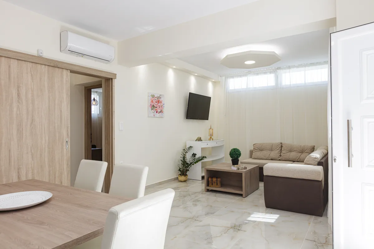 The top apartment has a kitchen and living room with direct access to the patio and pool area, dining table, 1 double bedroom,1 twin bedroom & 1 big bathroom.