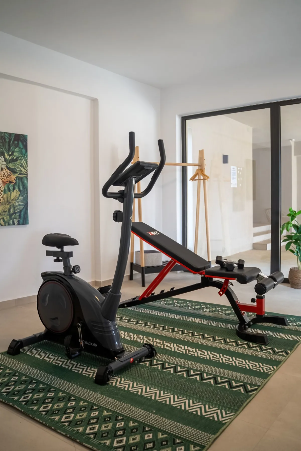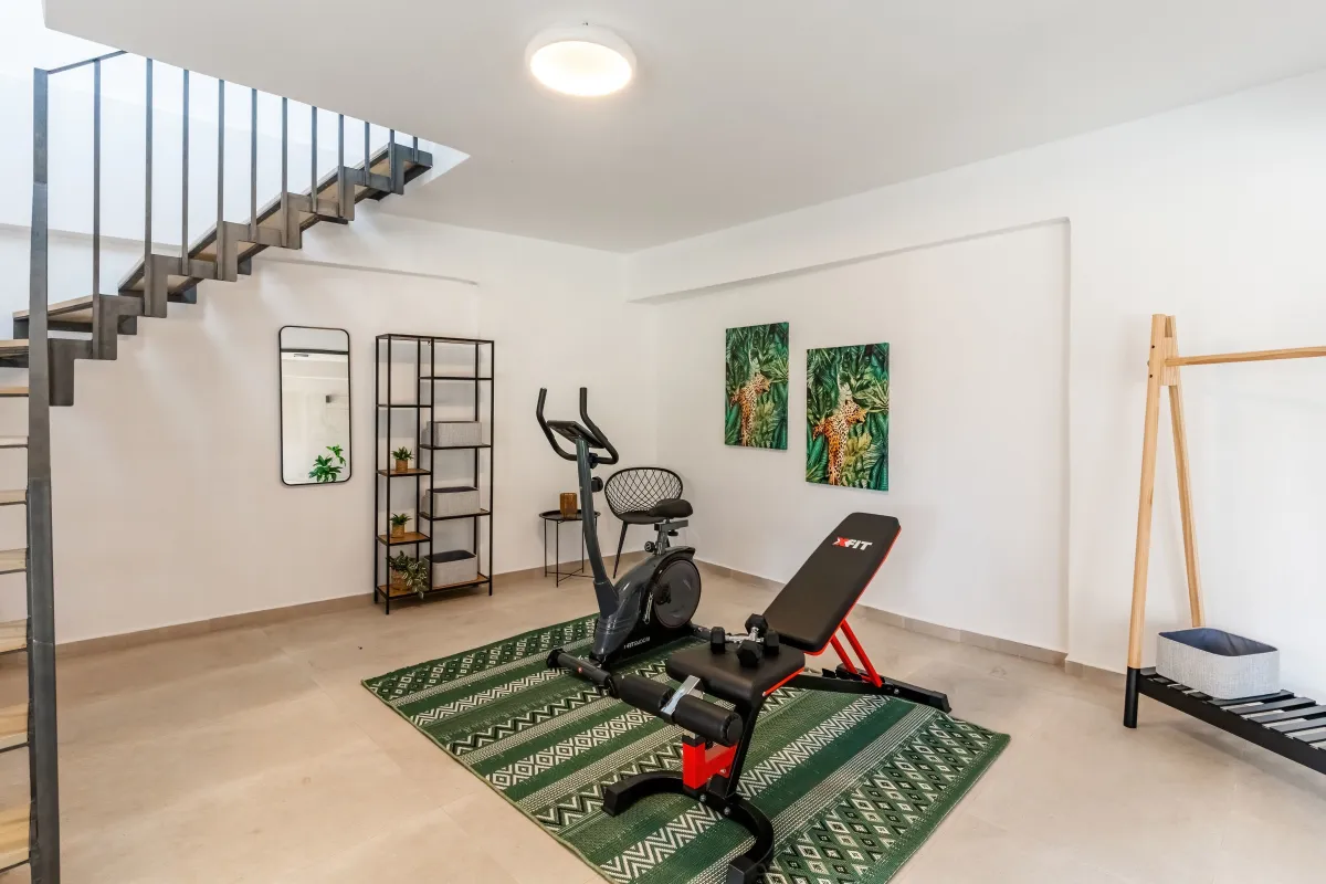 On the villa’s first floor, you’ll find a bright and airy living area with stylish décor, a 49" smart satellite TV, air conditioning, and comfortable seating ideal for relaxing after a day in the sun. The open-plan kitchen and dining space is fully equipped with everything from a Nespresso machine and toaster to a dishwasher, microwave, and blender, making it easy to whip up delicious meals. Music lovers will appreciate the Bluetooth-enabled stereo system, while fitness fans will love the private in-house gym.