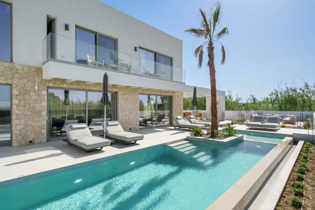 A very beautiful villa located directly on a quiet beach. Supermarkets and restaurants are nearby and can be easily reached on foot. The outdoor area of the villa is beautifully landscaped and equipped with sun loungers, a comfortable seating area, a large pool, and a gas grill. Upon entering the villa, you are greeted by a beautiful gallery with a high ceiling, which immediately adjoins the liv... more