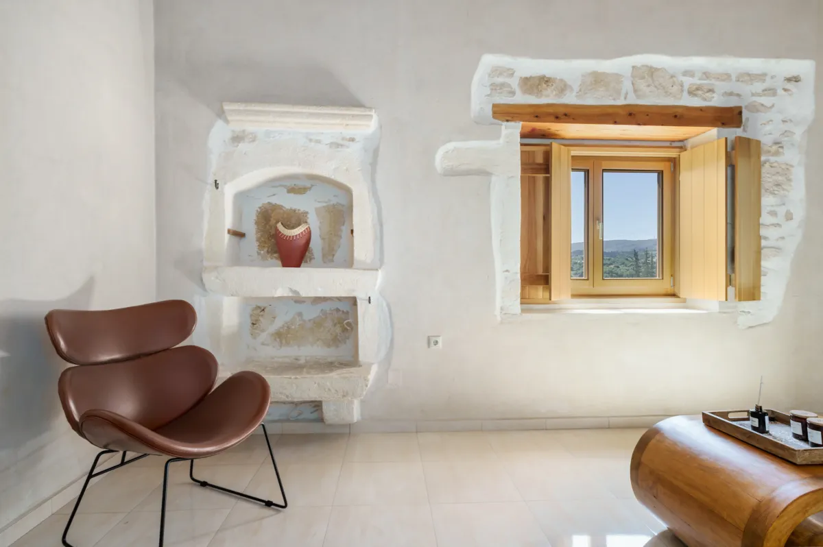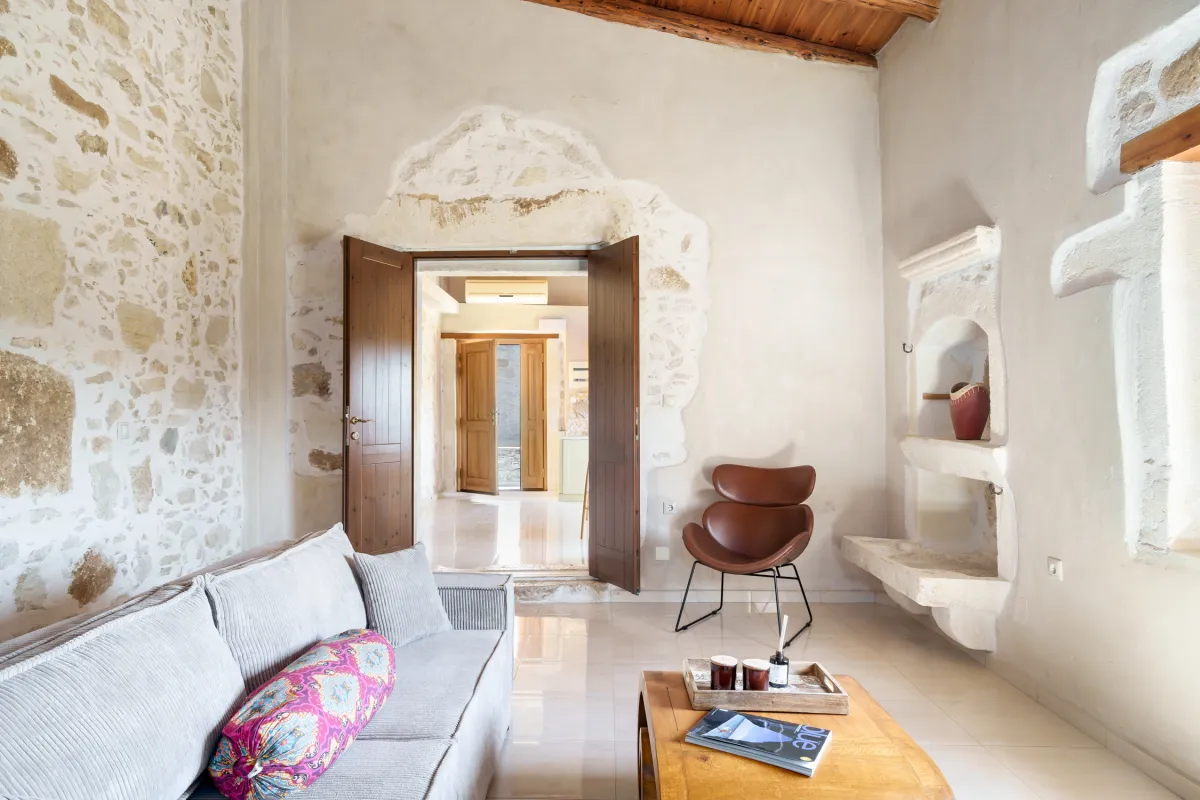 This spacious apartment is nestled within a peaceful holiday home complex, offering both privacy and access to wonderful shared amenities. Accommodating up to 5 guests, the apartment features a private entrance, providing a peaceful retreat after a day of exploring Crete. Inside, you’ll find a bright and cosy living room with comfortable seating and a fireplace, ideal for relaxation after a day of adventure.