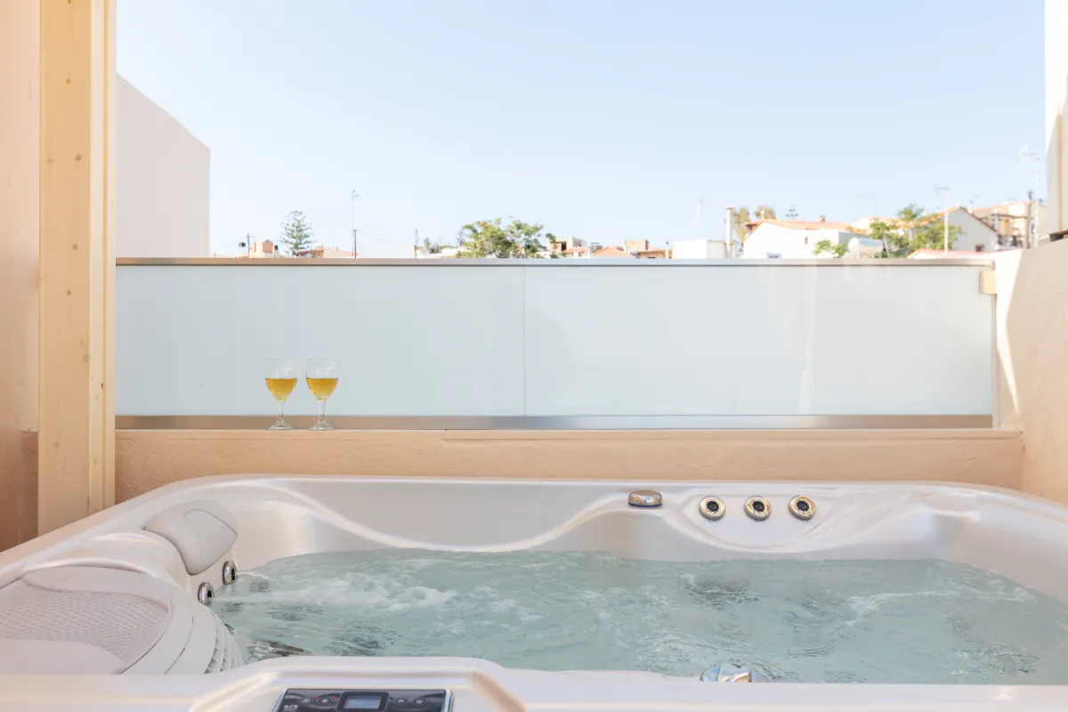 The first-floor king-size bedroom is ensuite and connects to a twin bedroom, while the second-floor king-size attic bedroom connects to another twin room, which includes an ensuite bathroom and access to a heated Jacuzzi hot tub on its private balcony. Additional twin bedrooms on the first floor complete the sleeping arrangements. The villa offers three bathrooms, air conditioning throughout, and thoughtful touches for a restful stay.