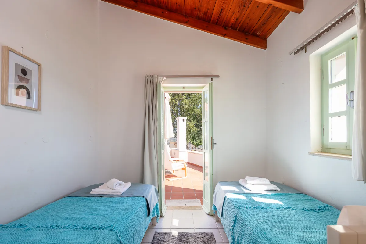 The villa features three welcoming bedrooms across two floors. On the ground floor, a twin bedroom with air conditioning offers a cosy retreat. Upstairs, a twin room and a double bedroom, all with balcony access and air conditioning, provide peaceful spaces to rest after a day of exploring. Comfortable outdoor seating and a spacious balcony complete the experience. Two bathrooms, one on each floor, ensure convenience for all guests. An additional sofa bed on the first floor offers extra sleeping space if needed.