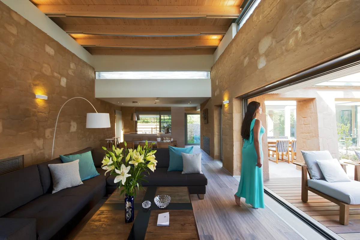La villa Alivia est en pierre avec des briques de ton de orange et elle the entourée d'un jardin coloré. La piscine extérieure a une waist of 40 mètres carrés et elle est décorée avec de grandes colonnes de pierre construites comme un ancien bâtiment minoen. La piscine peut être en partie ombragée par un toit ouvrant en mouvement. En entrant dans la maison, la salle de séjour est élégamment décoré avec des meubles modern et confortables et de grandes portes fenêtres offrent une vue extérieure of the oliveraies et montagnes environnantes. Une TV LCD de 42 pouces avec satellite et Internet WIFI saura vous tenir compagnie tout en vous reposant à l'intérieur. Une grande table en bois brun complète la pièce idéale pour les repas à des occasions spéciales. La cuisine est entièrement équipée avec des accessoires luxueux et elle est conçue comme une surface de travail semi-encastrée. La villa Alivia peut accueillir jusqu'à 6 personnes dans ses 3 chambres, 2 d'entre elles, double lites jumeaux ou à deux lits, sont situées au rez-de-chaussée avec piscine et accès au jardin. Au premier étage, il ya une lit de chambre Grande waist avec salle de bain et jacuzzi. Son balcon est équipé d'une terrace ensoleillée et a coin salon confortable.