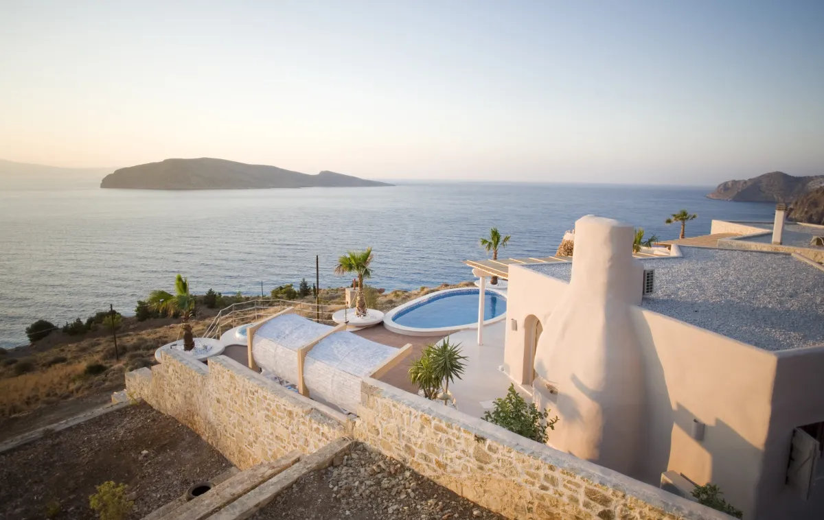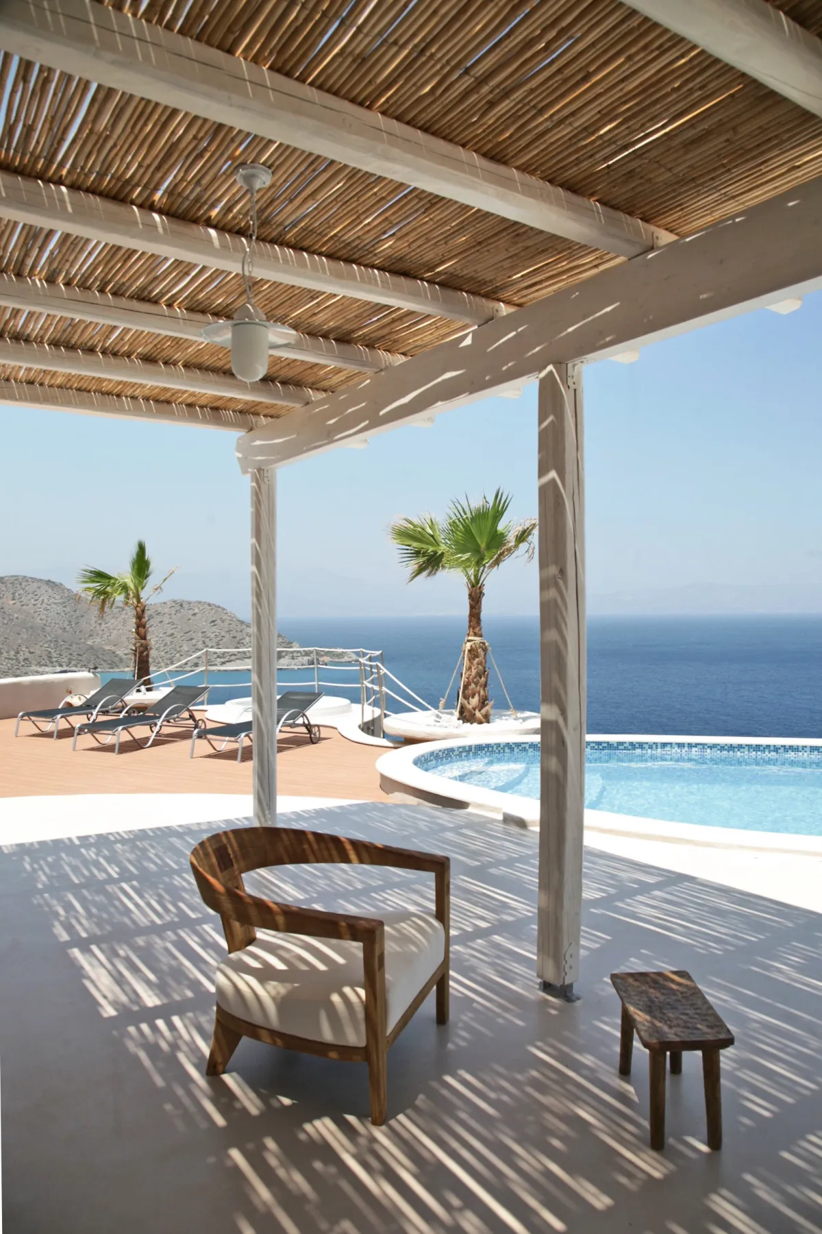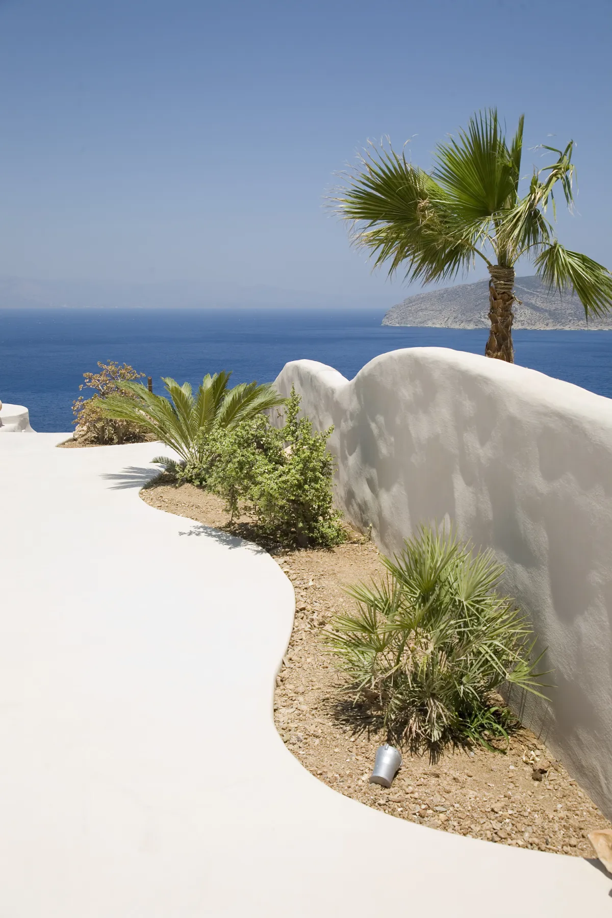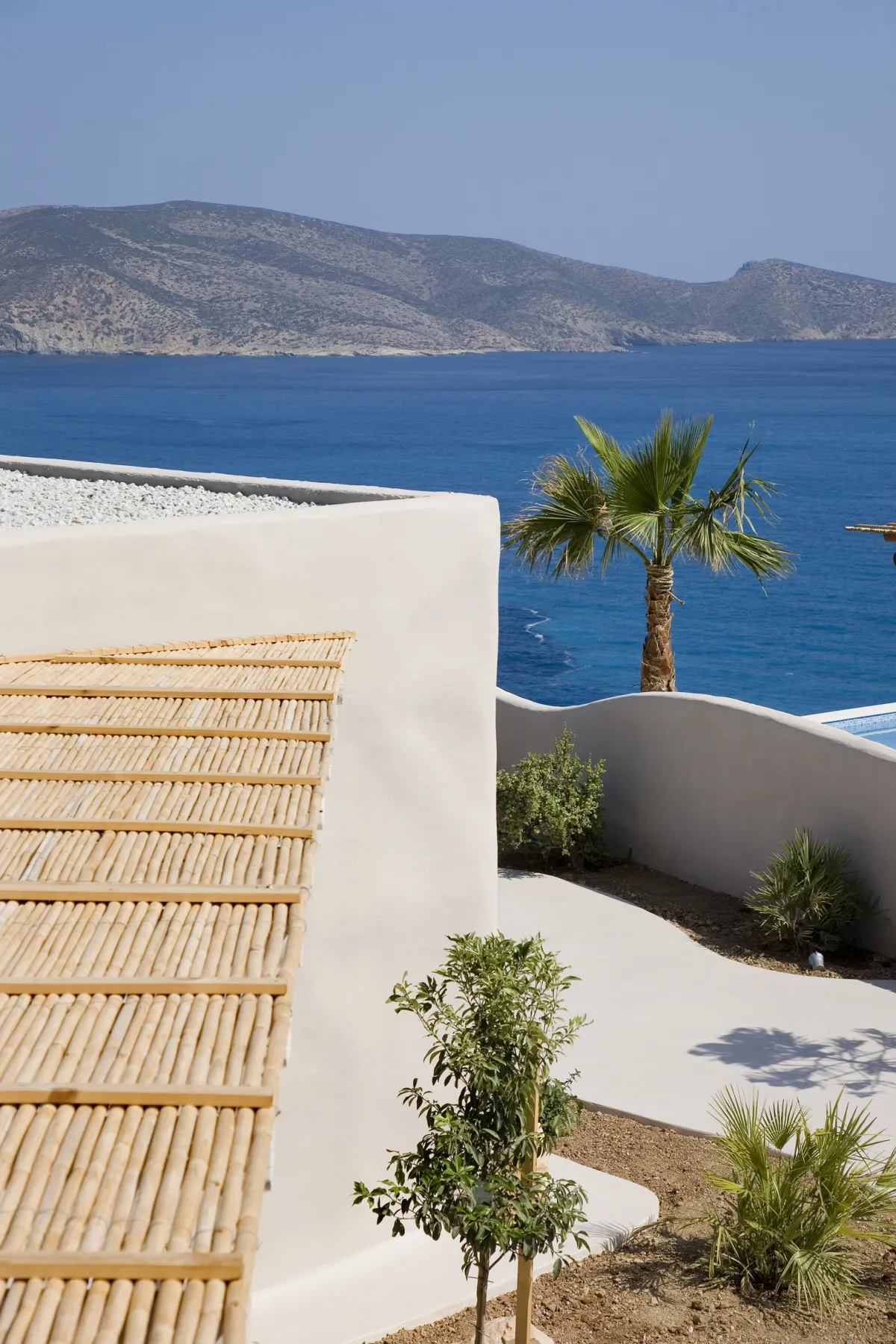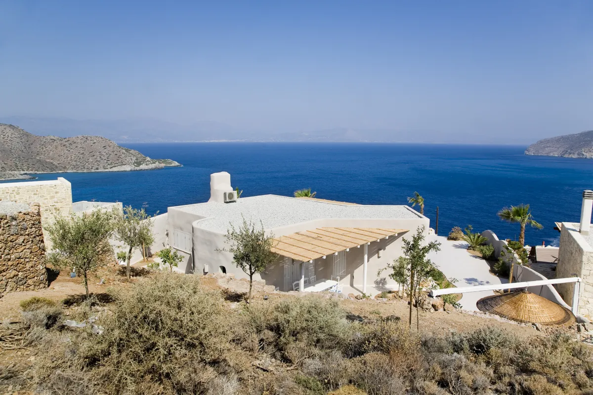 Cette villa d'un blanc immaculé qui repose à 150 mètres au-dessus du niveau de la mer et offre des vues à couper le souffle sur le golfe de Mirabello, est conçue pour donner des sentiments d'équilibre pur et de plaisir esthétique loin des regards indiscrets sur un paysage de montagne aride, avec sa propre piscine privée et jacuzzi, dans le zone exclusive de la Crète orientale.