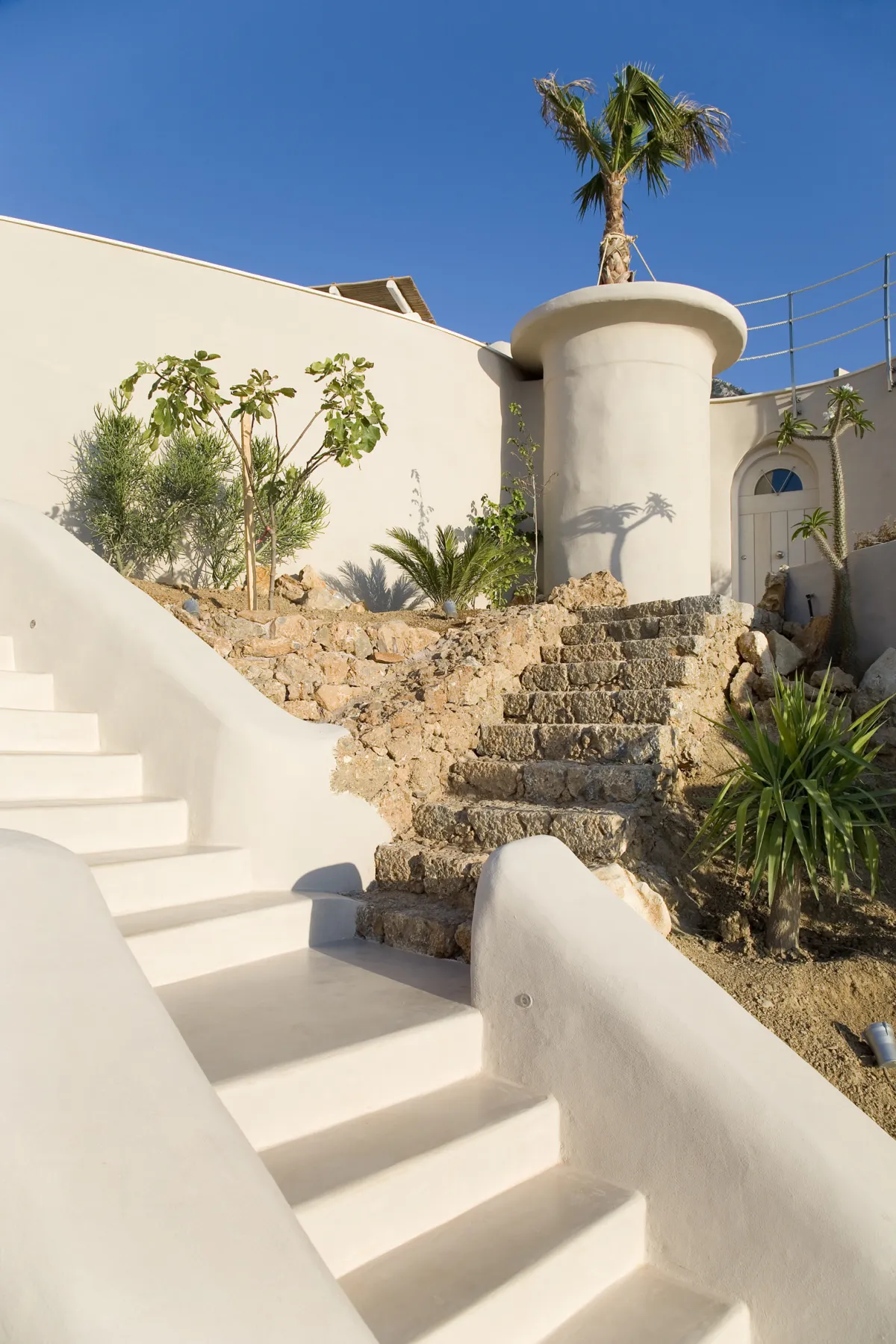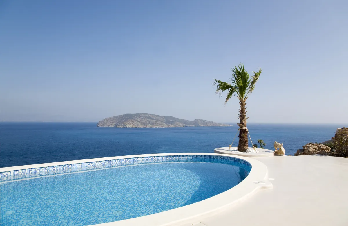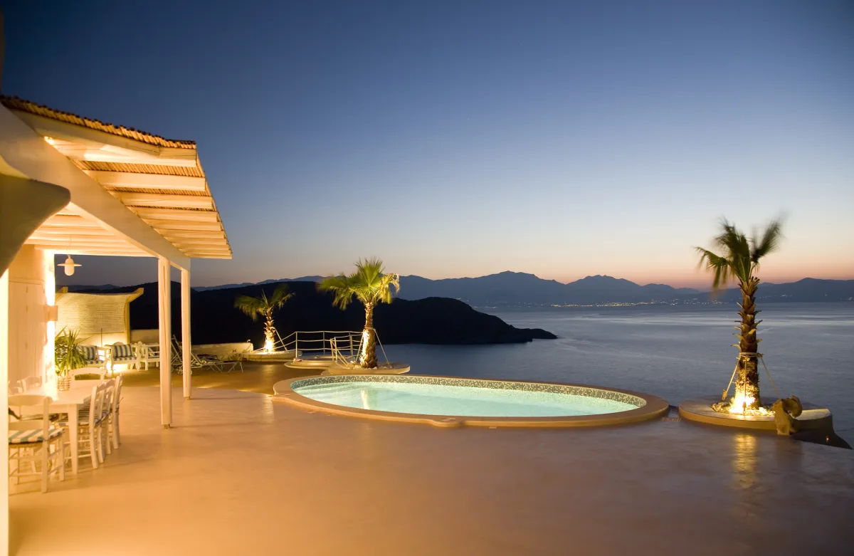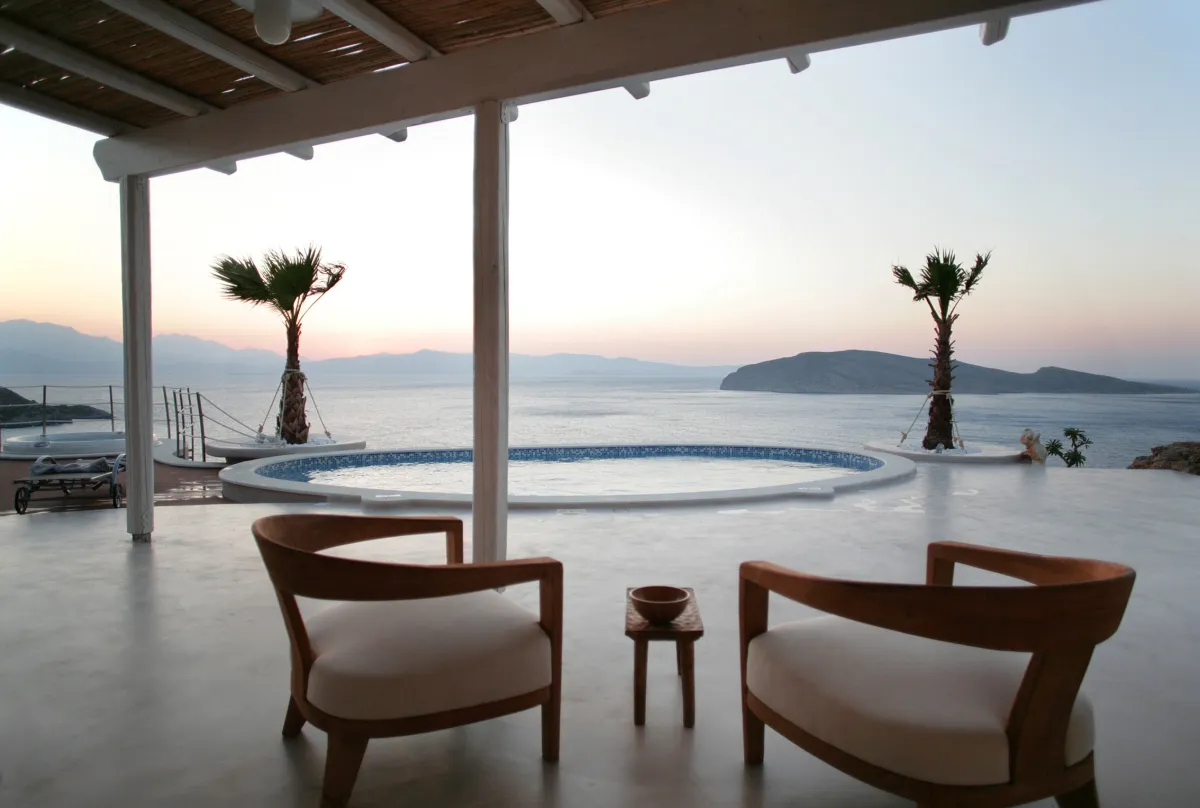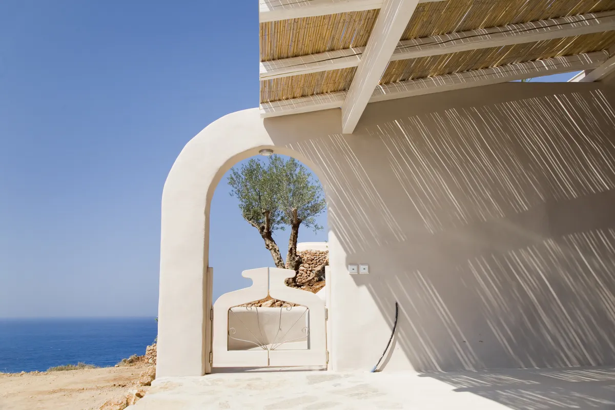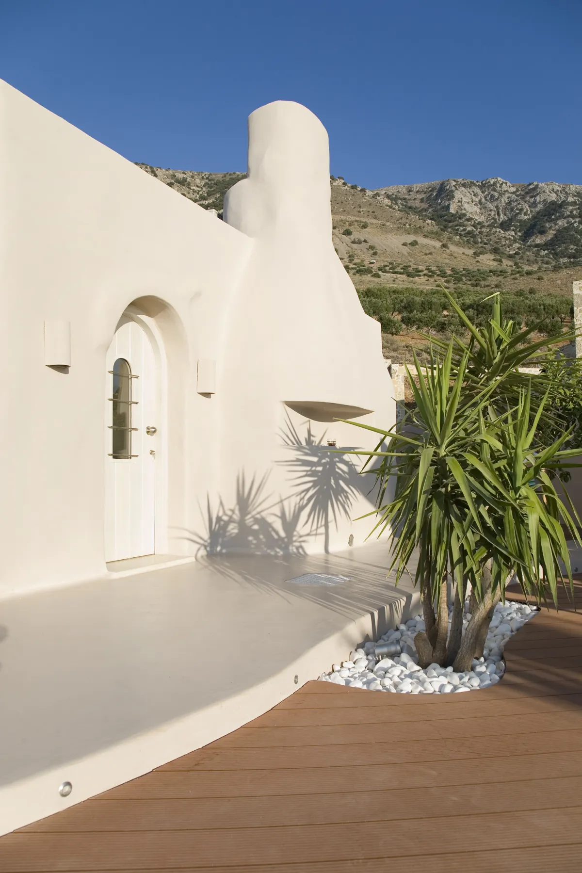 Cette villa d'un blanc immaculé qui repose à 150 mètres au-dessus du niveau de la mer et offre des vues à couper le souffle sur le golfe de Mirabello, est conçue pour donner des sentiments d'équilibre pur et de plaisir esthétique loin des regards indiscrets sur un paysage de montagne aride, avec sa propre piscine privée et jacuzzi, dans le zone exclusive de la Crète orientale.