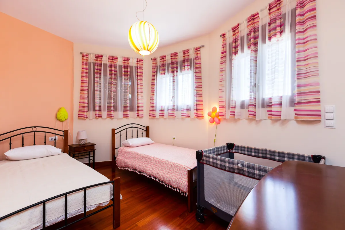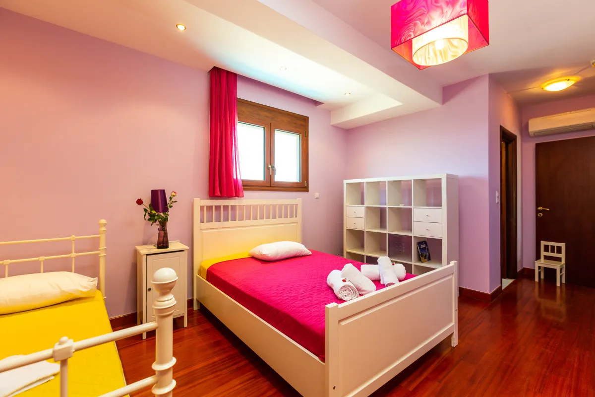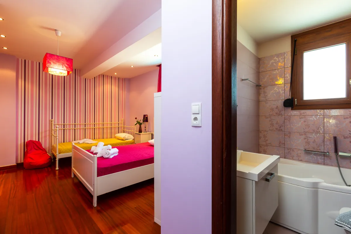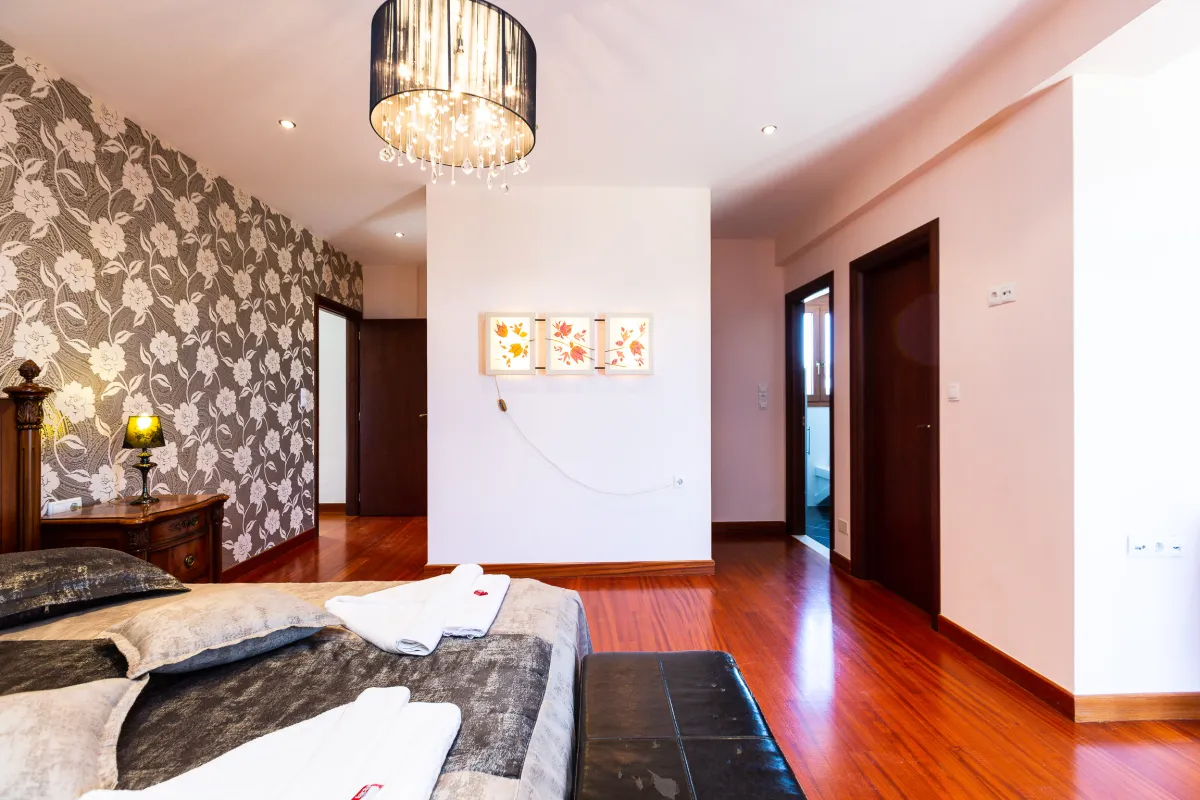 La Villa 4 Seasons dispose de 5 splendides chambres dotées d'un mobilier décadent et de rideaux occultants. Quatre d'entre elles sont situées au premier étage : la chambre principale dispose d'un lit king-size, de la climatisation, d'une armoire, d'une télévision de 32 pouces et d'une salle de bain attenante avec baignoire à jets. L'autre chambre dispose de 2 lits simples et de la climatisation. La troisième chambre a un lit double, un balcon privé, la climatisation, une télévision 40'' et une salle de bain avec douche et la dernière chambre du premier étage a un lit double et un lit simple, la climatisation et une salle de bain avec jets. baignoire. La cinquième chambre est située dans les combles, où se trouvent un lit double inclinable, la climatisation, des balcons privés, une télévision 40'', un coin fitness avec tapis roulant et vélo d'appartement, une kitchenette, un coin salon, un bureau. et salle de bain attenante avec douche. Les salles de bains sont équipées de serviettes, d'un sèche-cheveux et d'articles de toilette gratuits. Un fer et une planche à repasser, un lave-linge et un sèche-linge sont également à votre disposition.