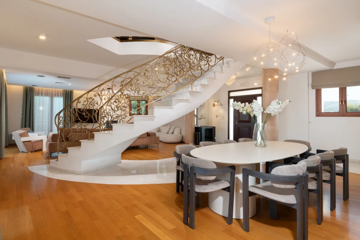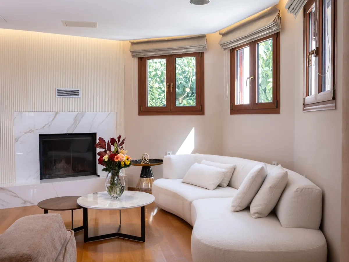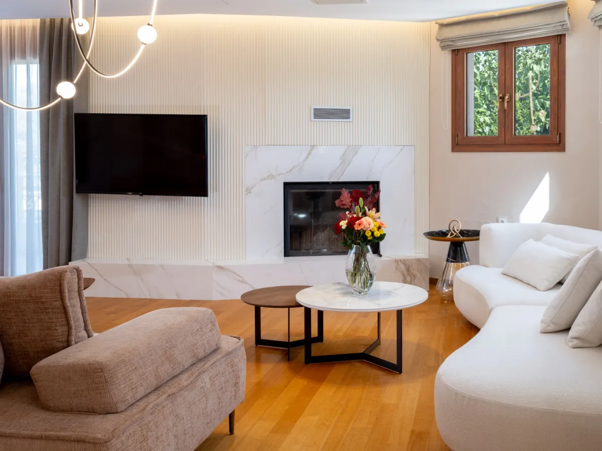 L'espace de vie de la Villa 4 Seasons est ouvert sur l'extérieur, avec de hauts plafonds et de vastes sols en bois et en marbre qui confèrent une impression de grandeur à l'intérieur spacieux. La villa dispose d'un luxueux salon avec des sièges élégants et confortables, une Smart TV HD de 50 pouces, une chaîne hi-fi, des consoles de jeux et des jeux de société, ainsi qu'une cheminée et la climatisation. Un piano est également à disposition des mélomanes. Un ascenseur dessert les étages.