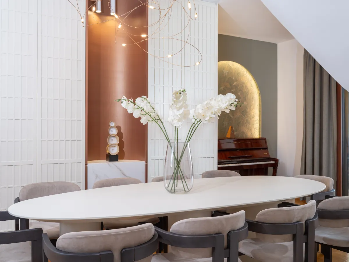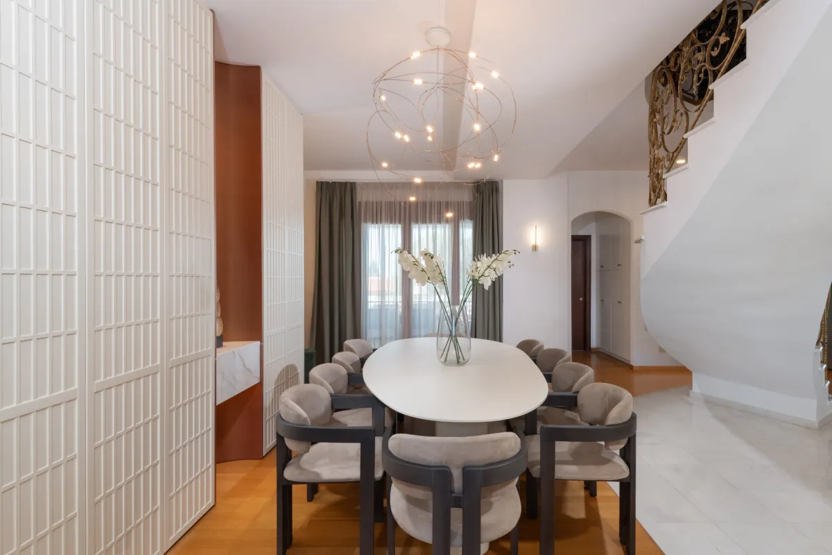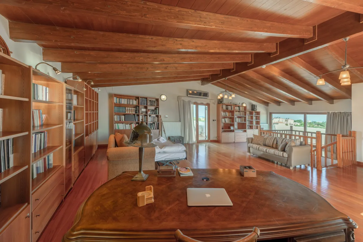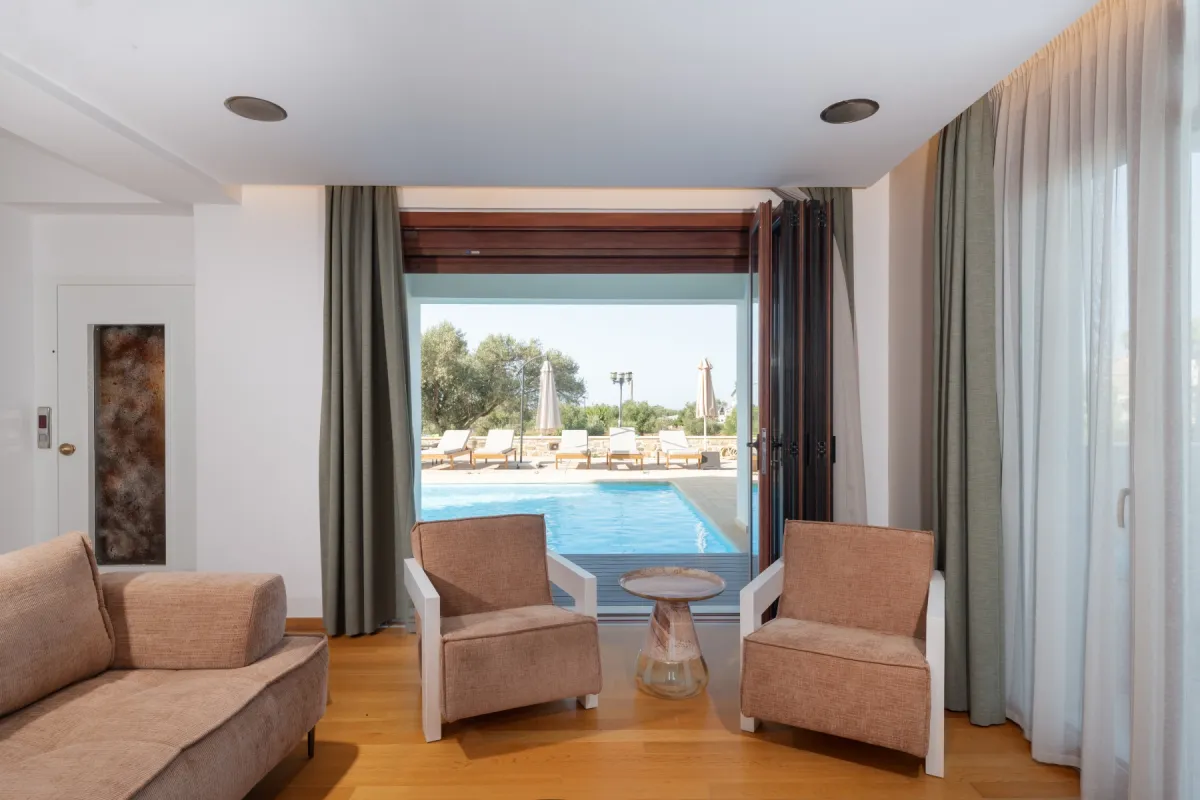 L'espace de vie de la Villa 4 Seasons est ouvert sur l'extérieur, avec de hauts plafonds et de vastes sols en bois et en marbre qui confèrent une impression de grandeur à l'intérieur spacieux. La villa dispose d'un luxueux salon avec des sièges élégants et confortables, une Smart TV HD de 50 pouces, une chaîne hi-fi, des consoles de jeux et des jeux de société, ainsi qu'une cheminée et la climatisation. Un piano est également à disposition des mélomanes. Un ascenseur dessert les étages.