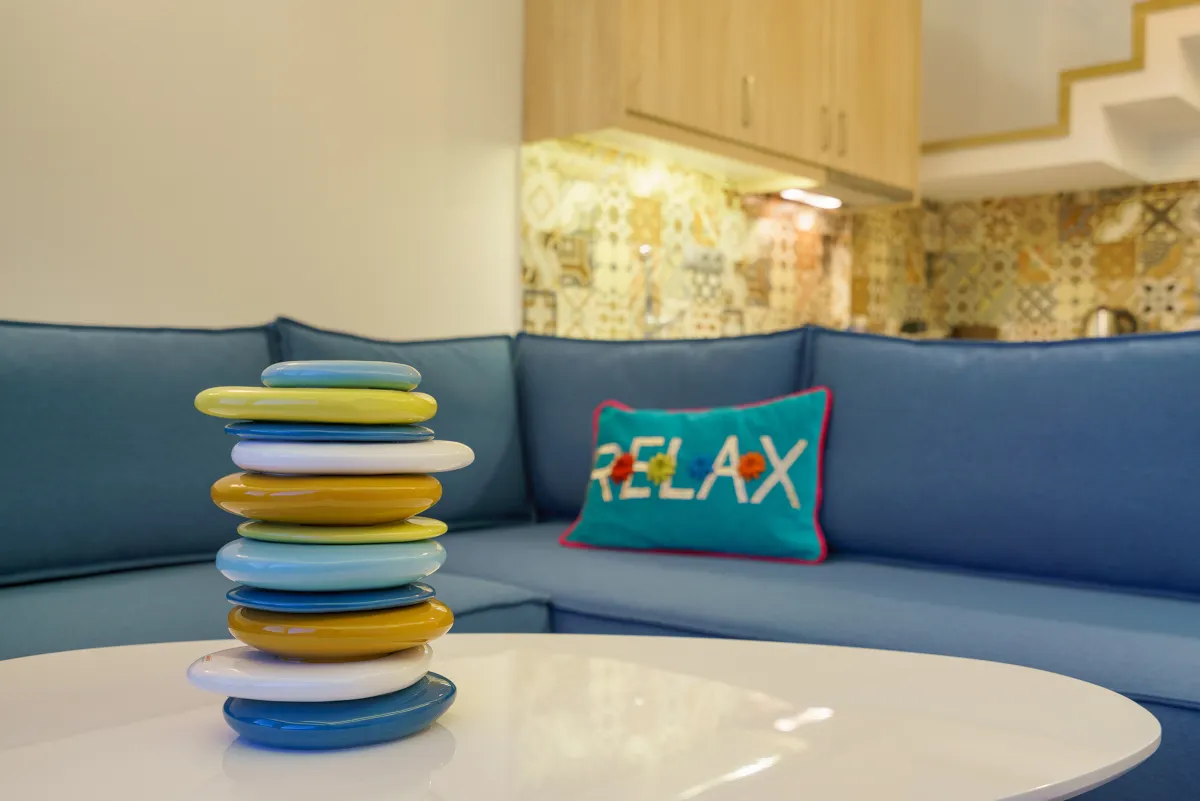 villa exterior sunbed sea views living room area kitchen sea views and furniture